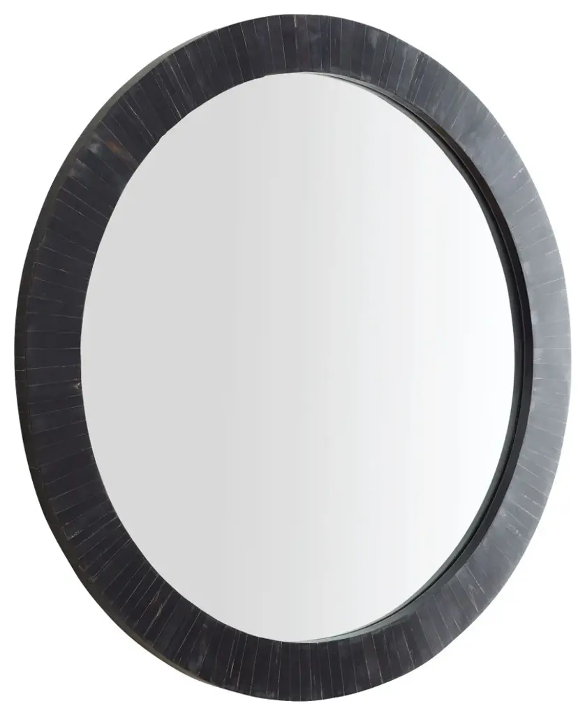 The unique round concave shape of our Tula Mirror is an eye-catching addition to any room. The 5" concave frame is accented in antique brass and striking charcoal Grey Faux-Shagreen.