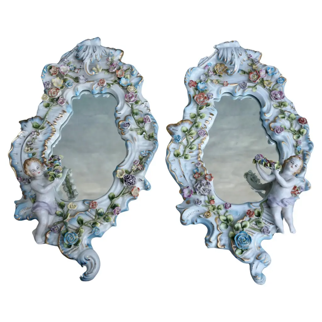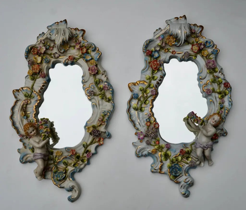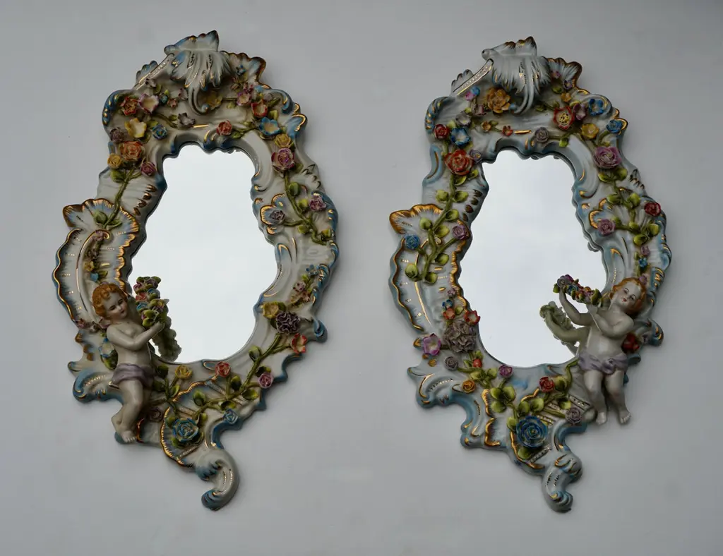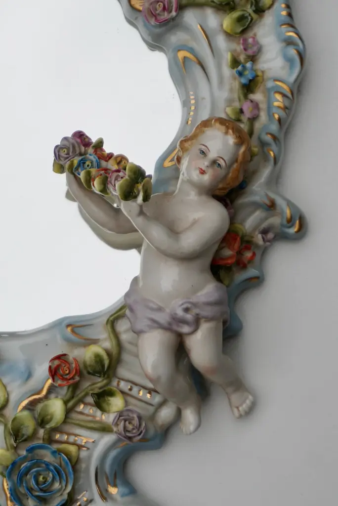Two Vintage Capodimonte Porcelain Floral Cherub Wall Mirror Dresden
