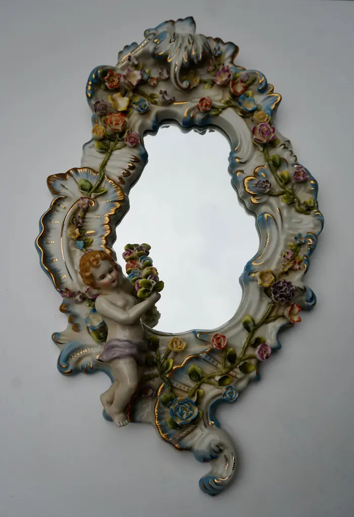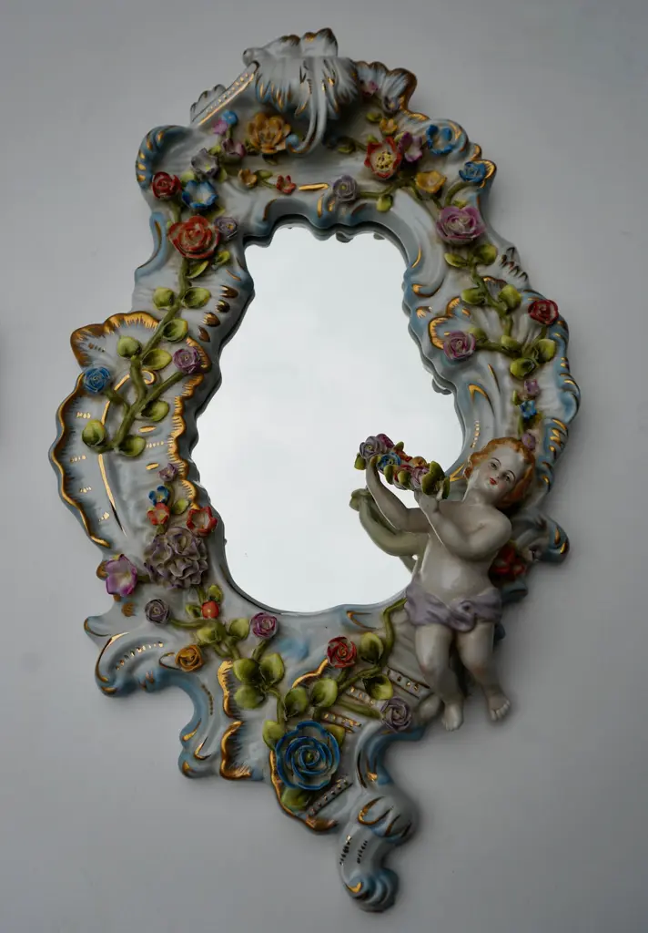 Vintage Capodimonte porcelain framed wall mirror; with gilded accents,and elaborately decorated with a variety of delicately crafted flowers and cherub perched on the corners.There can be some small leaves missing given the period of dating and also due to the fragility.