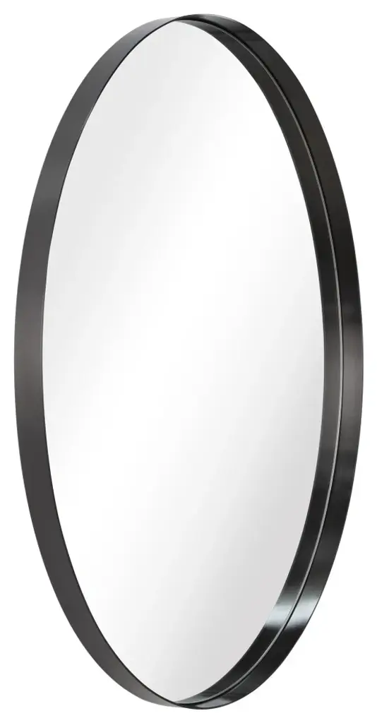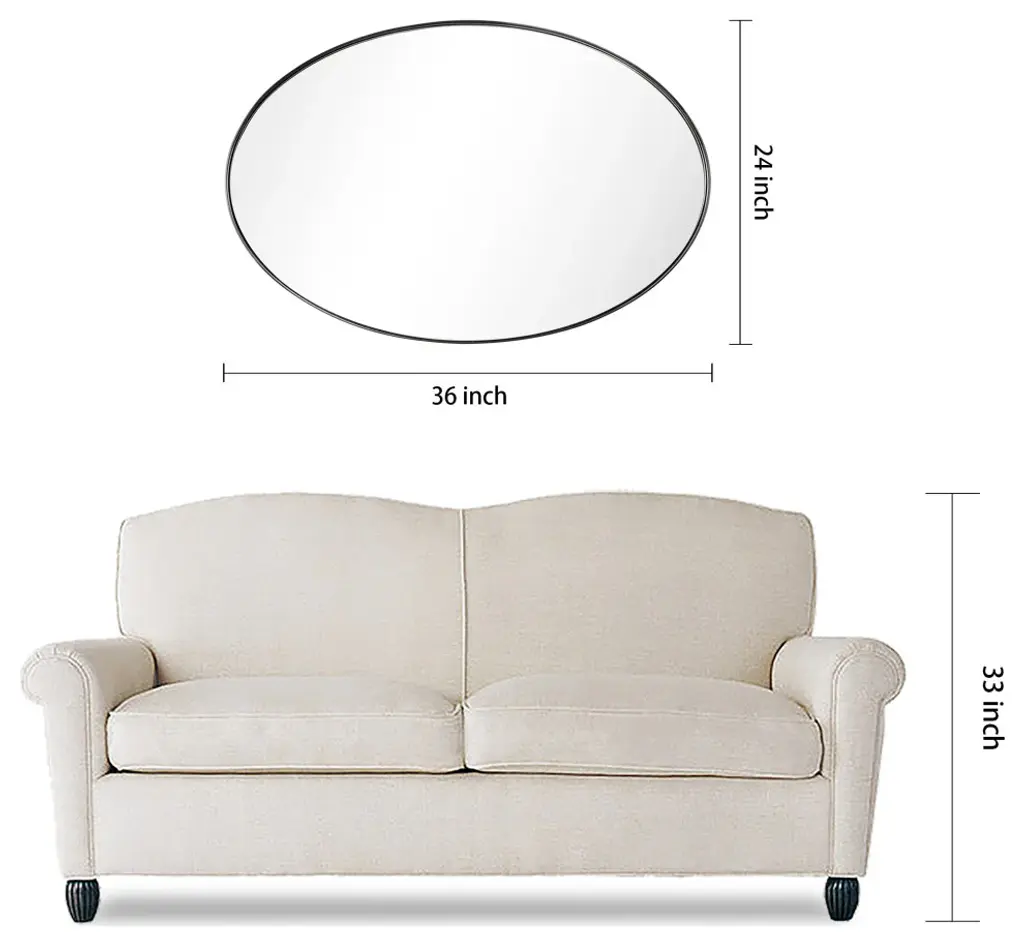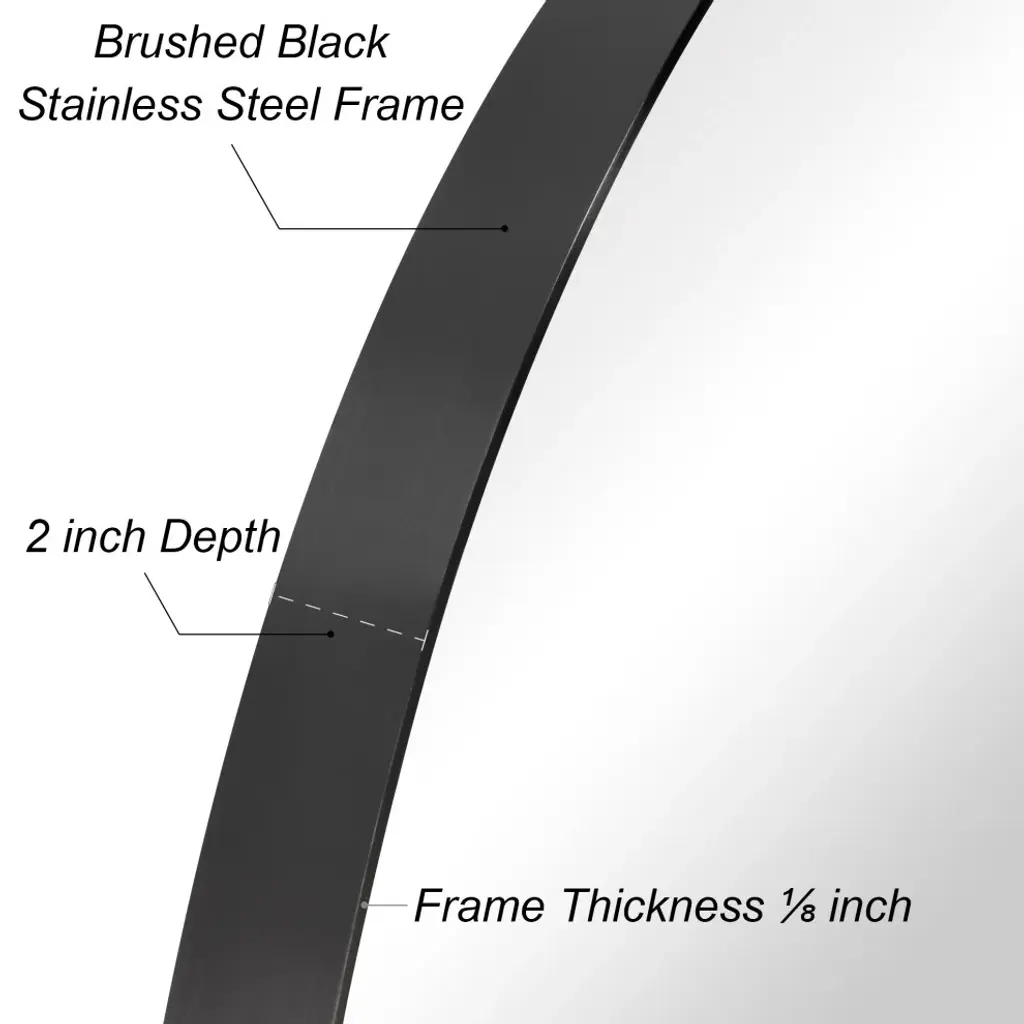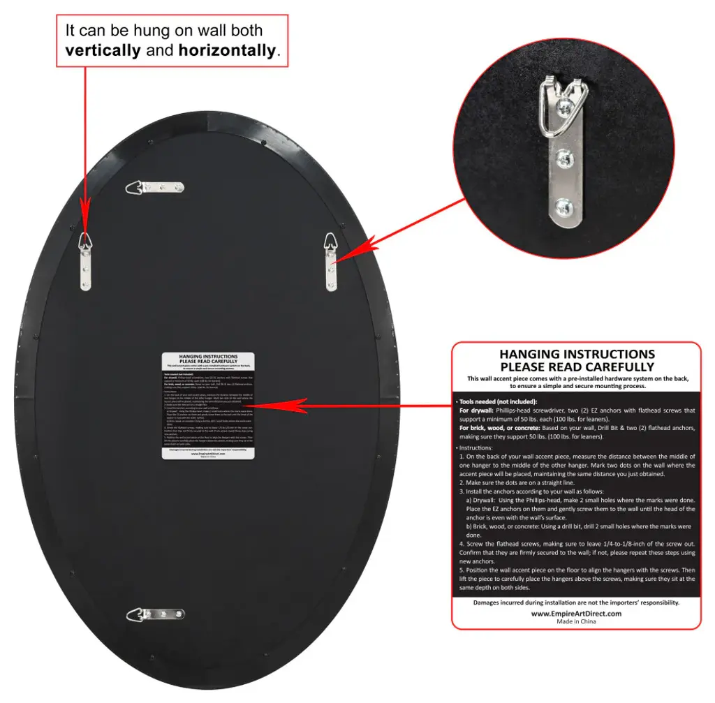 This inspiring 24" x 36" oval wall mirror is incredible for adding utility and function to wall space without compromising on minimalistic beauty. With a brushed black stainless-steel frame, this piece embodies the ultimate in quality and modern presentation. This mirror uses silver glass, making sure NO distortion or wrapping. All that is needed to hang this mirror are EZ anchors that can be purchased at your Lowes or Home Depot. 4 strong pre-installed D-Rings are attached to the back of the product for quick and easy installation either vertically or horizontally.