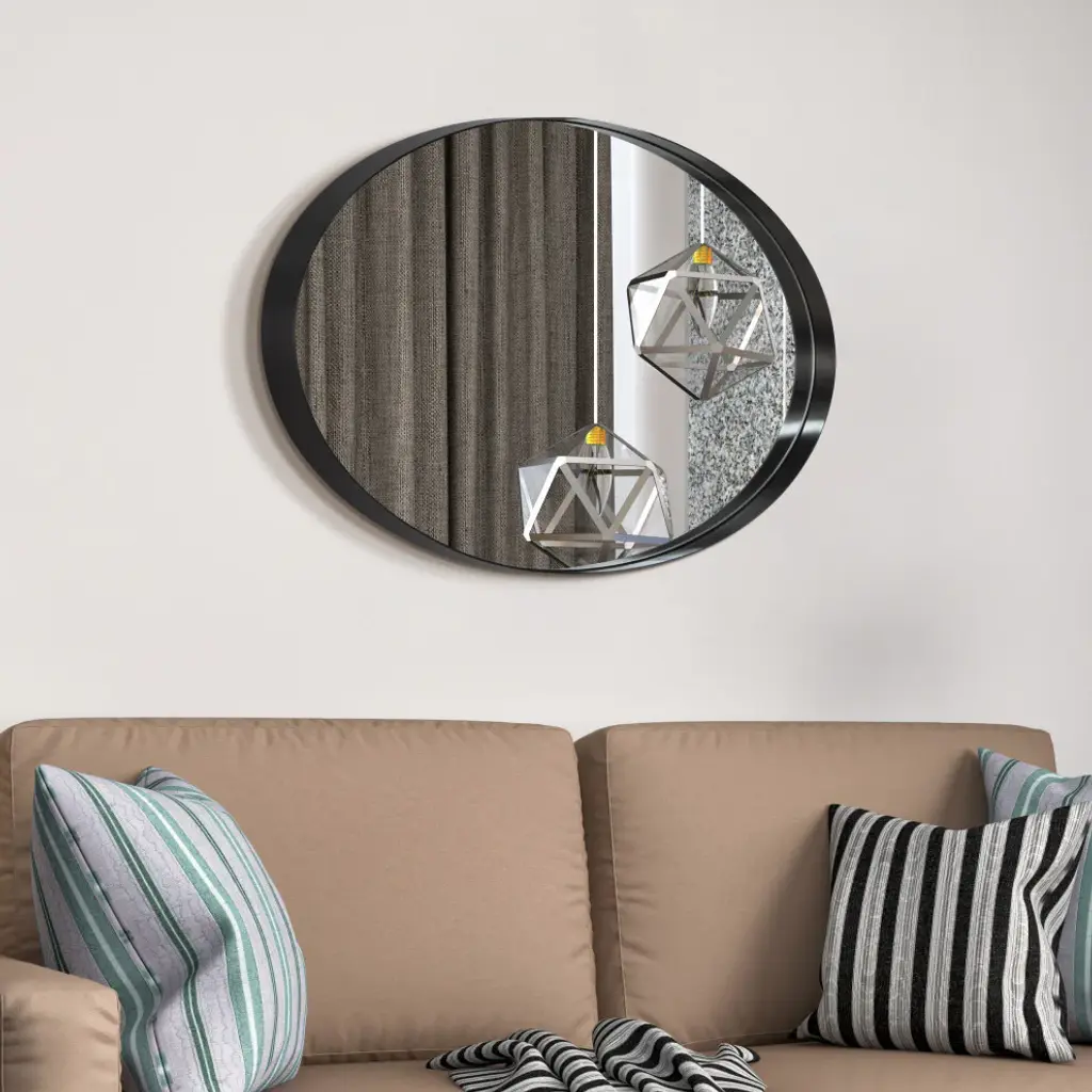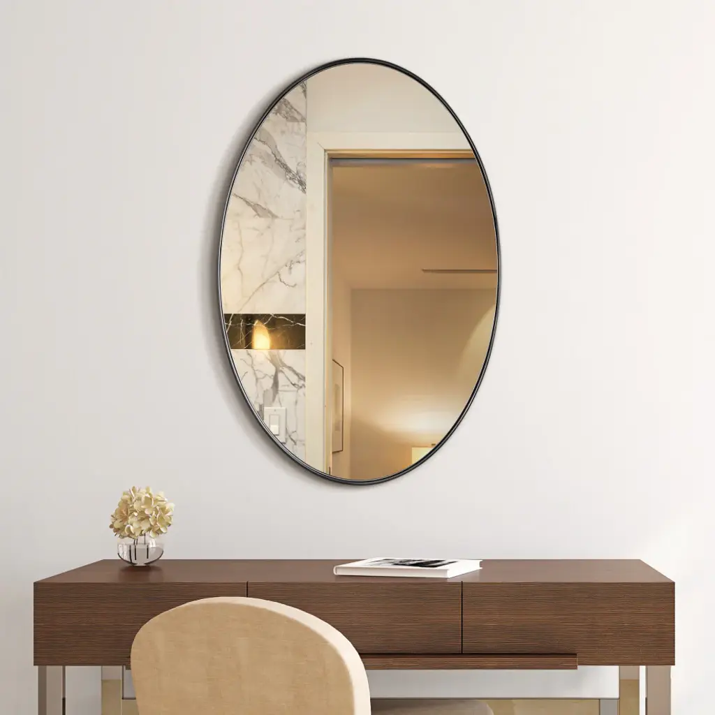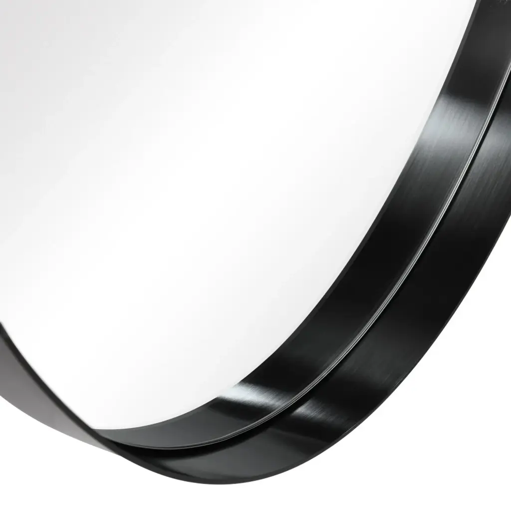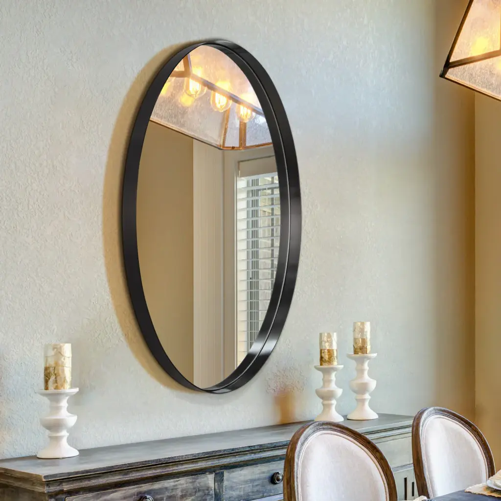 This inspiring 24" x 36" oval wall mirror is incredible for adding utility and function to wall space without compromising on minimalistic beauty. With a brushed black stainless-steel frame, this piece embodies the ultimate in quality and modern presentation. This mirror uses silver glass, making sure NO distortion or wrapping. All that is needed to hang this mirror are EZ anchors that can be purchased at your Lowes or Home Depot. 4 strong pre-installed D-Rings are attached to the back of the product for quick and easy installation either vertically or horizontally.