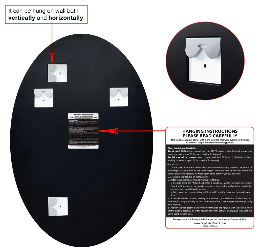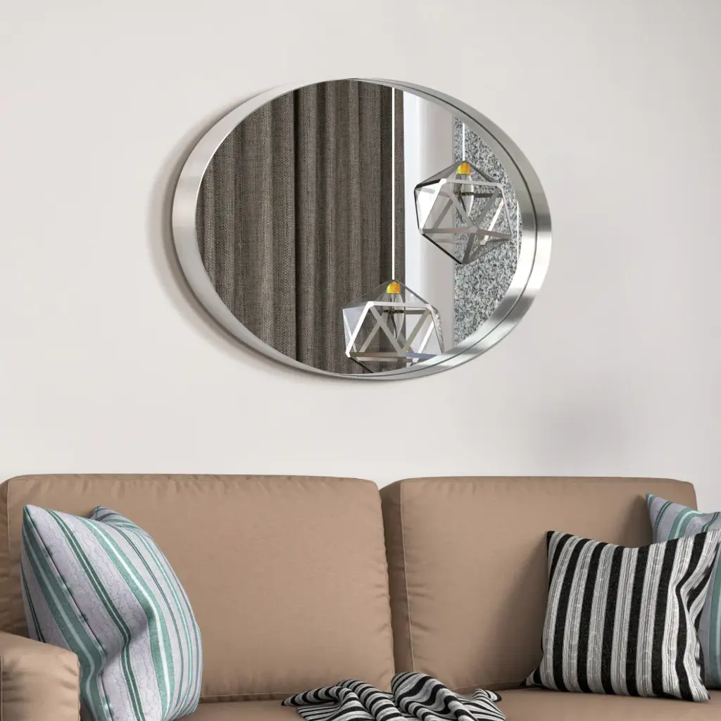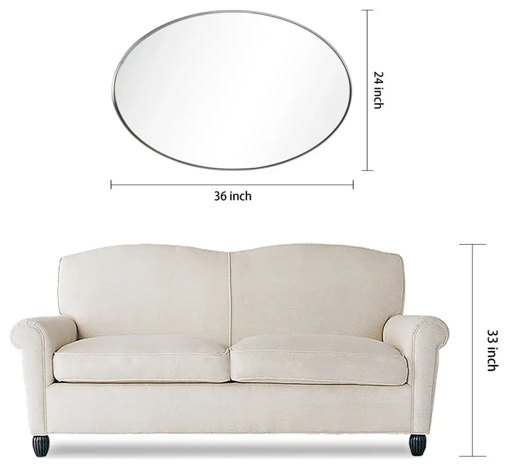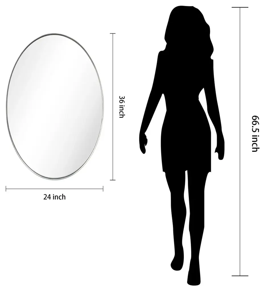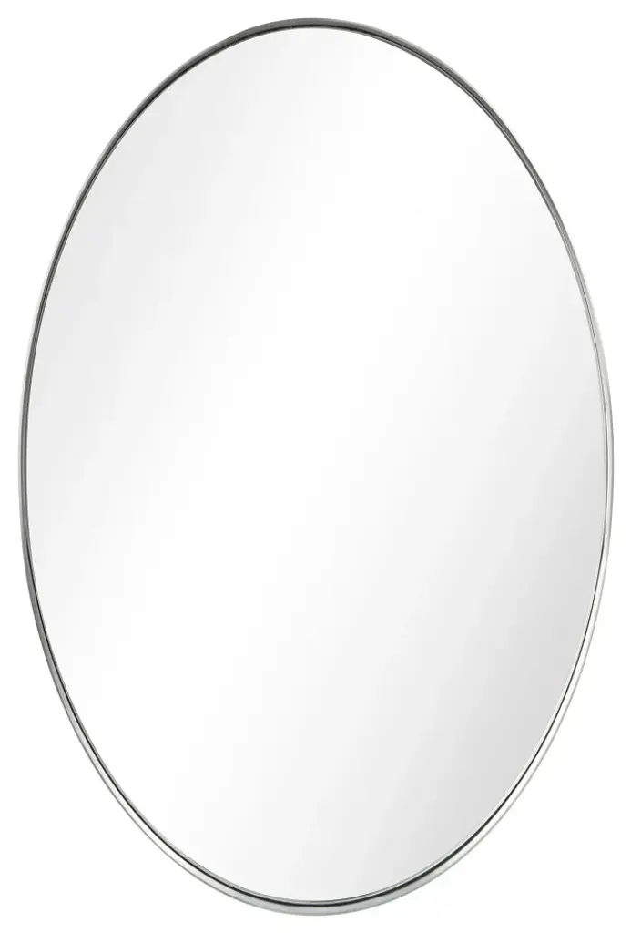 This inspiring 24" x 36" oval wall mirror is incredible for adding utility and function to wall space without compromising on minimalistic beauty. With a brushed silver stainless-steel frame, this piece embodies the ultimate in quality and modern presentation. This mirror uses silver glass, making sure NO distortion or wrapping. All that is needed to hang this mirror are EZ anchors that can be purchased at your Lowes or Home Depot. 4 strong pre-installed D-Rings are attached to the back of the product for quick and easy installation either vertically or horizontally.