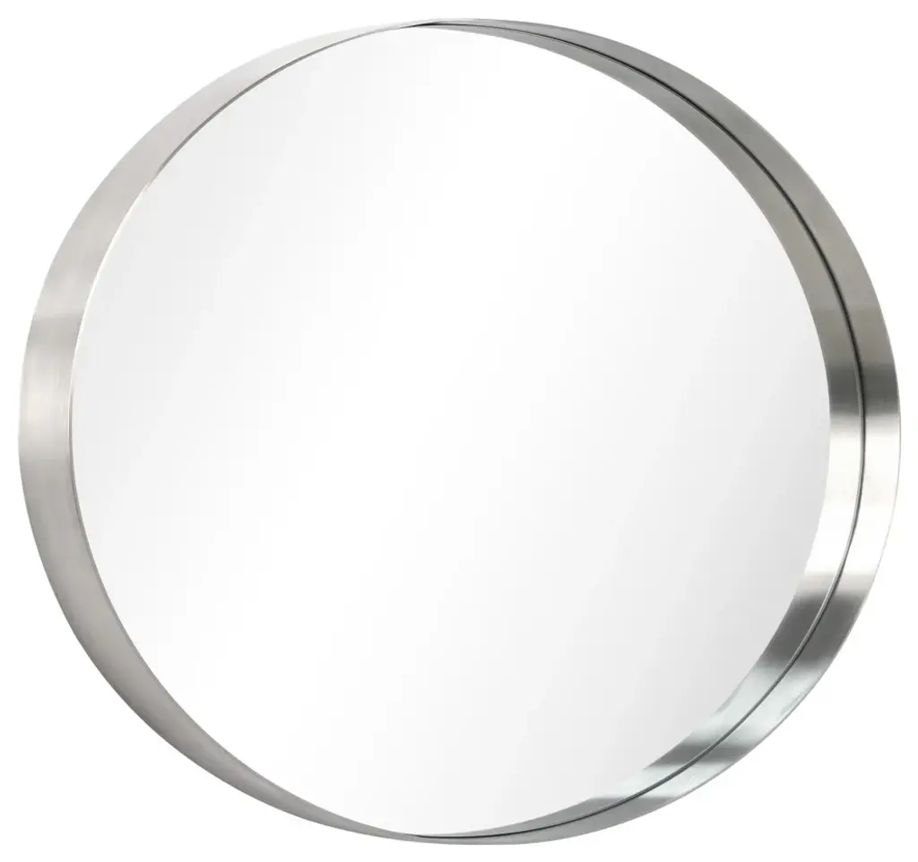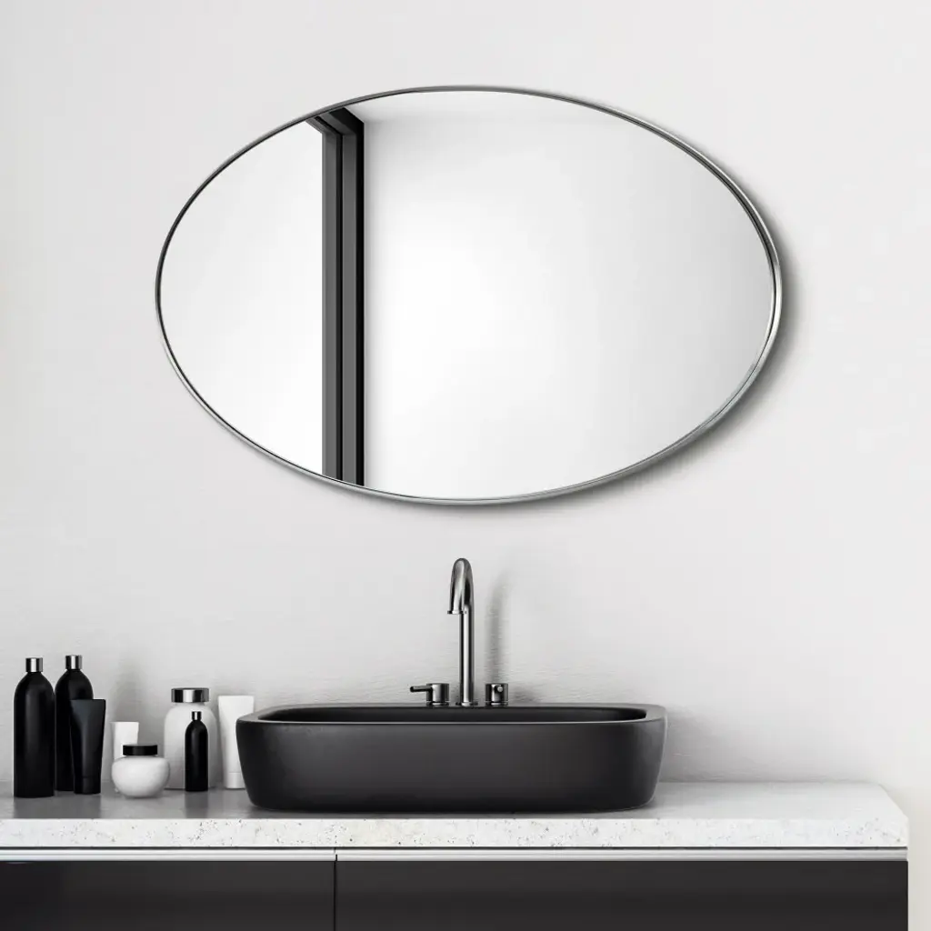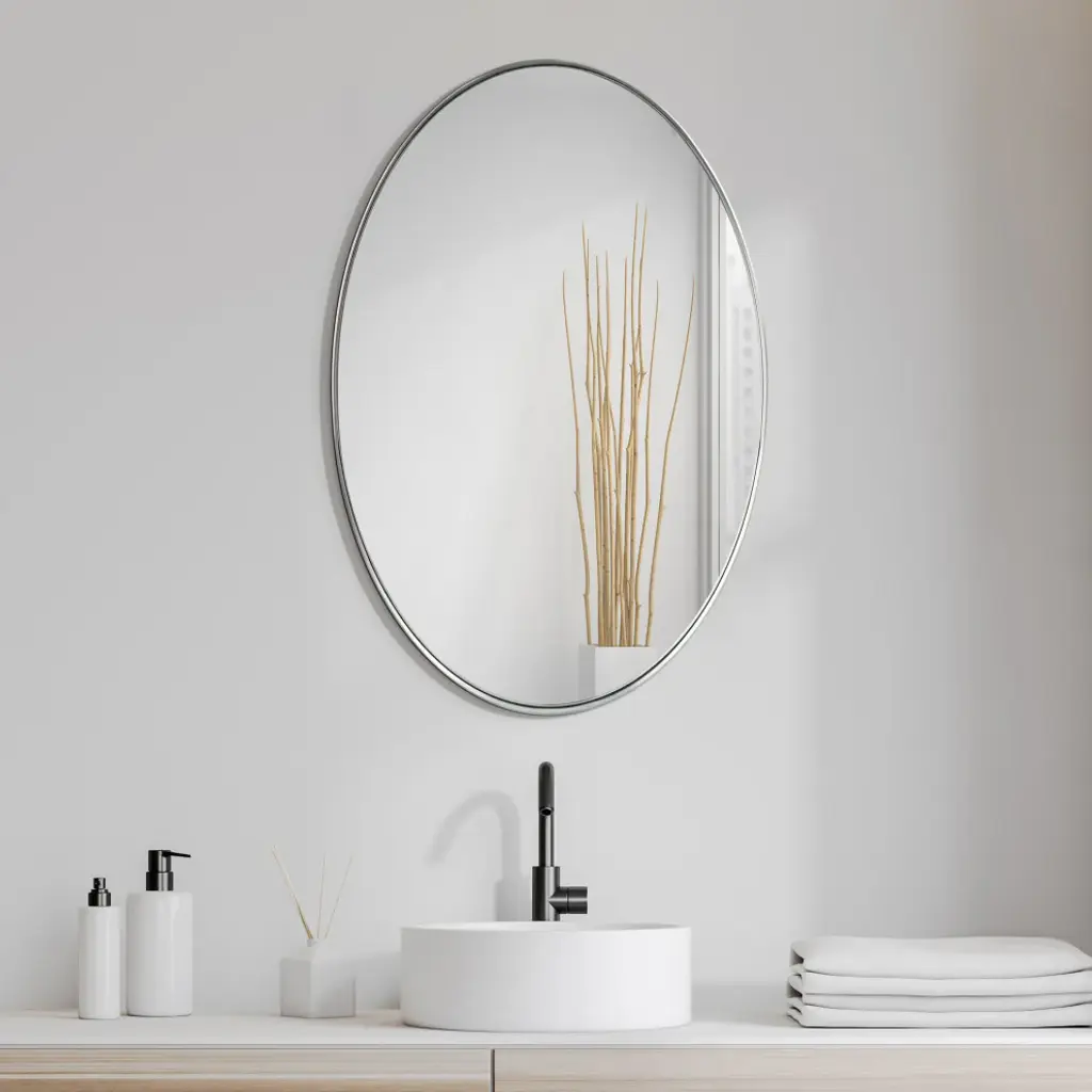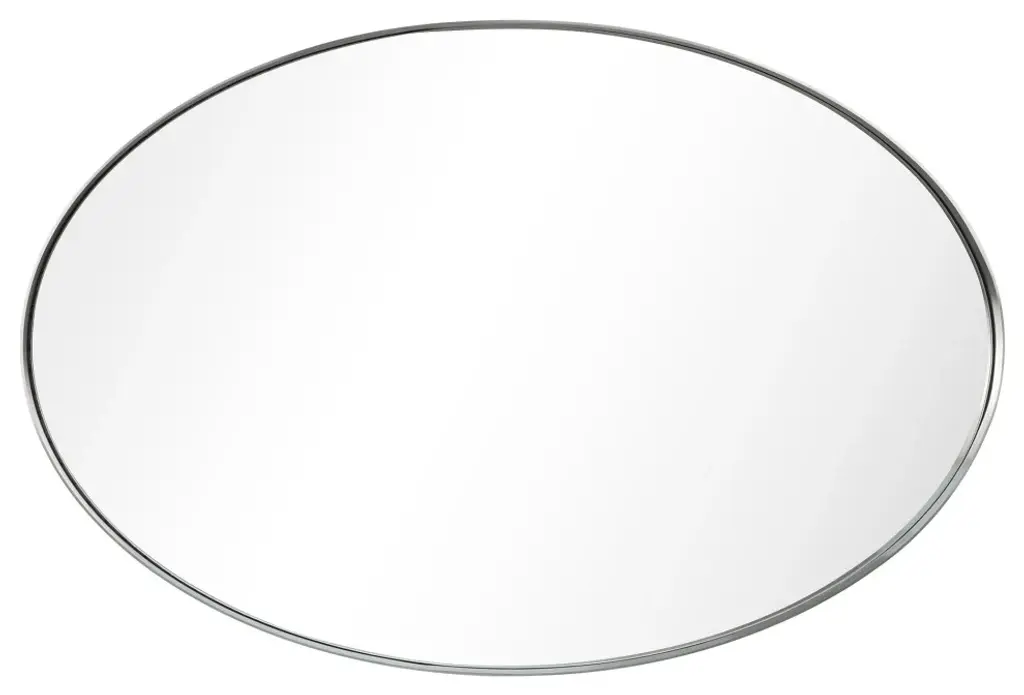 This inspiring 24" x 36" oval wall mirror is incredible for adding utility and function to wall space without compromising on minimalistic beauty. With a brushed silver stainless-steel frame, this piece embodies the ultimate in quality and modern presentation. This mirror uses silver glass, making sure NO distortion or wrapping. All that is needed to hang this mirror are EZ anchors that can be purchased at your Lowes or Home Depot. 4 strong pre-installed D-Rings are attached to the back of the product for quick and easy installation either vertically or horizontally.