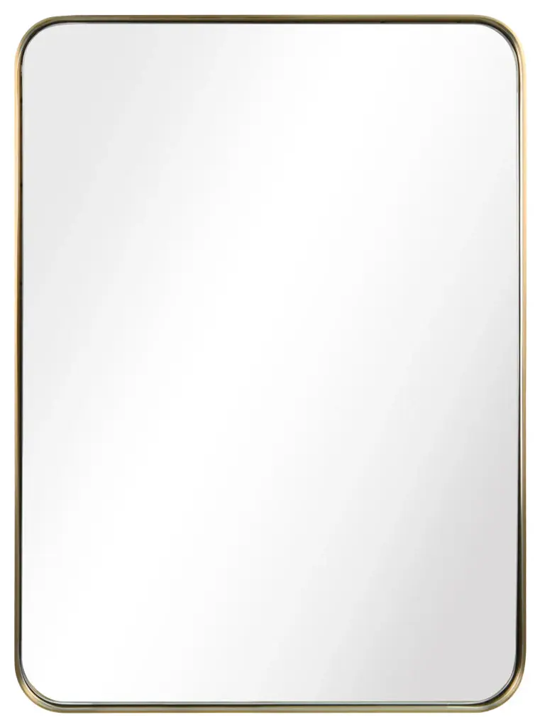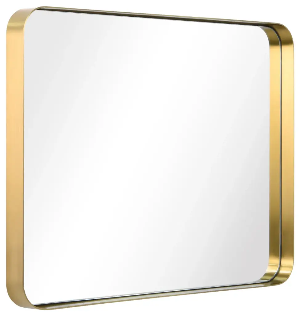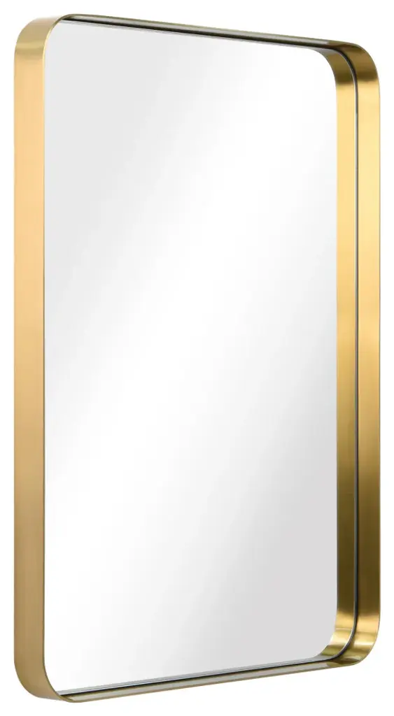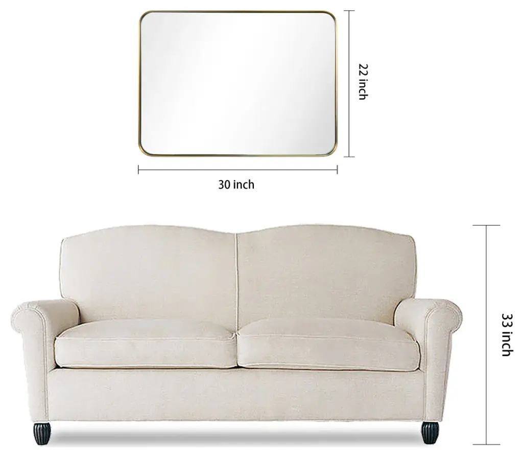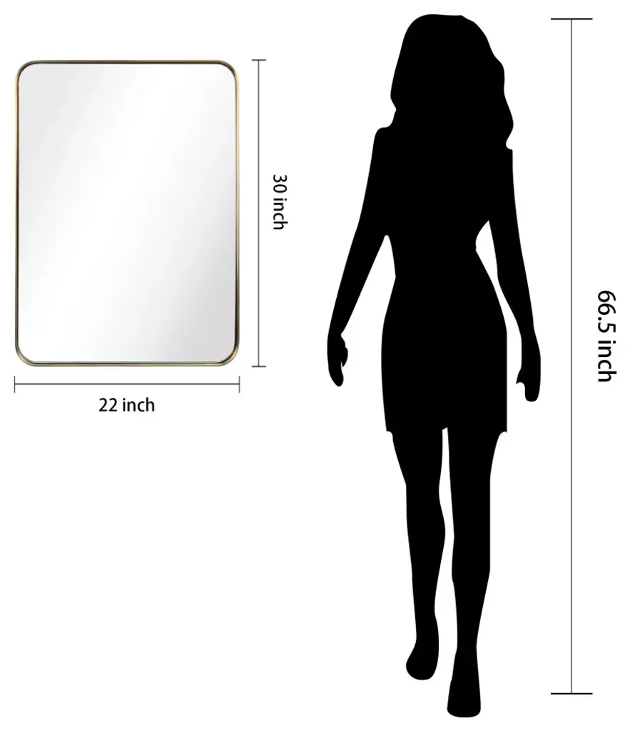 This inspiring 22" x 30" rectangular wall mirror is incredible for adding utility and function to wall space without compromising on minimilistic beauty. With a brushed gold stainless-steel frame, this piece embodies the ultimate in quality and modern presentation. This mirror uses silver glass, making sure NO distortion or wrapping. All that is needed to hang this mirror are EZ anchors that can be purchased at your Lowes or Home Depot. 4 strong pre-installed D-Rings are attached to the back of the product for quick and easy installation either vertically or horizontally.