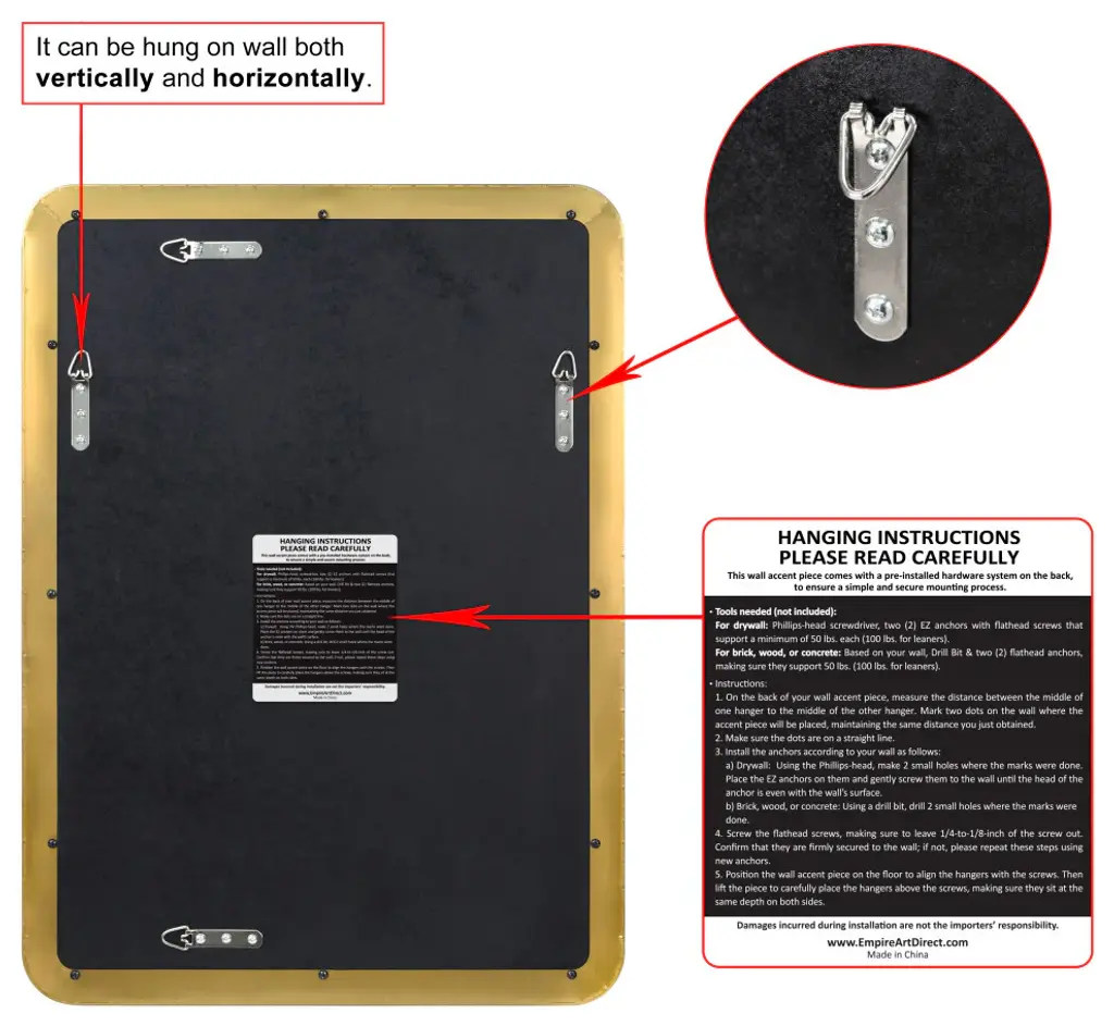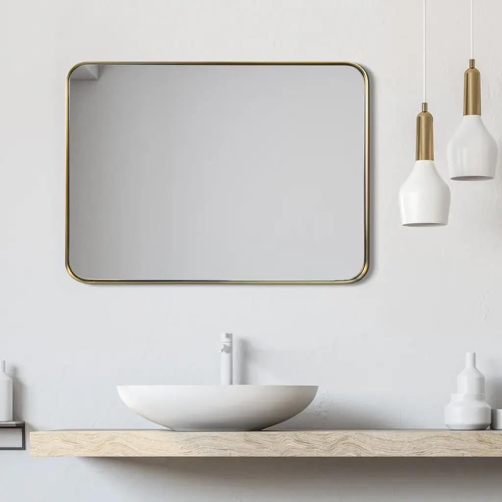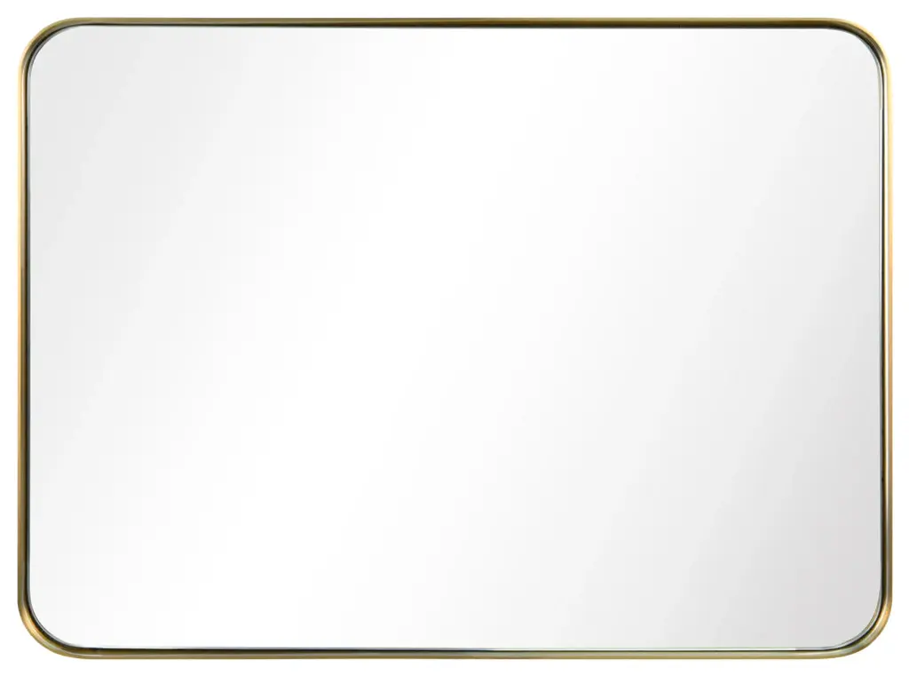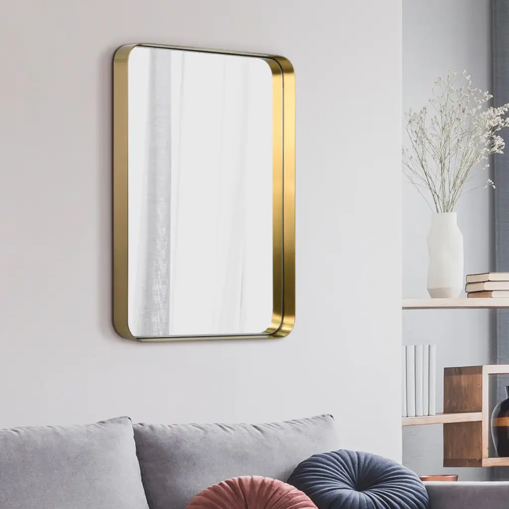 This inspiring 22" x 30" rectangular wall mirror is incredible for adding utility and function to wall space without compromising on minimilistic beauty. With a brushed gold stainless-steel frame, this piece embodies the ultimate in quality and modern presentation. This mirror uses silver glass, making sure NO distortion or wrapping. All that is needed to hang this mirror are EZ anchors that can be purchased at your Lowes or Home Depot. 4 strong pre-installed D-Rings are attached to the back of the product for quick and easy installation either vertically or horizontally.