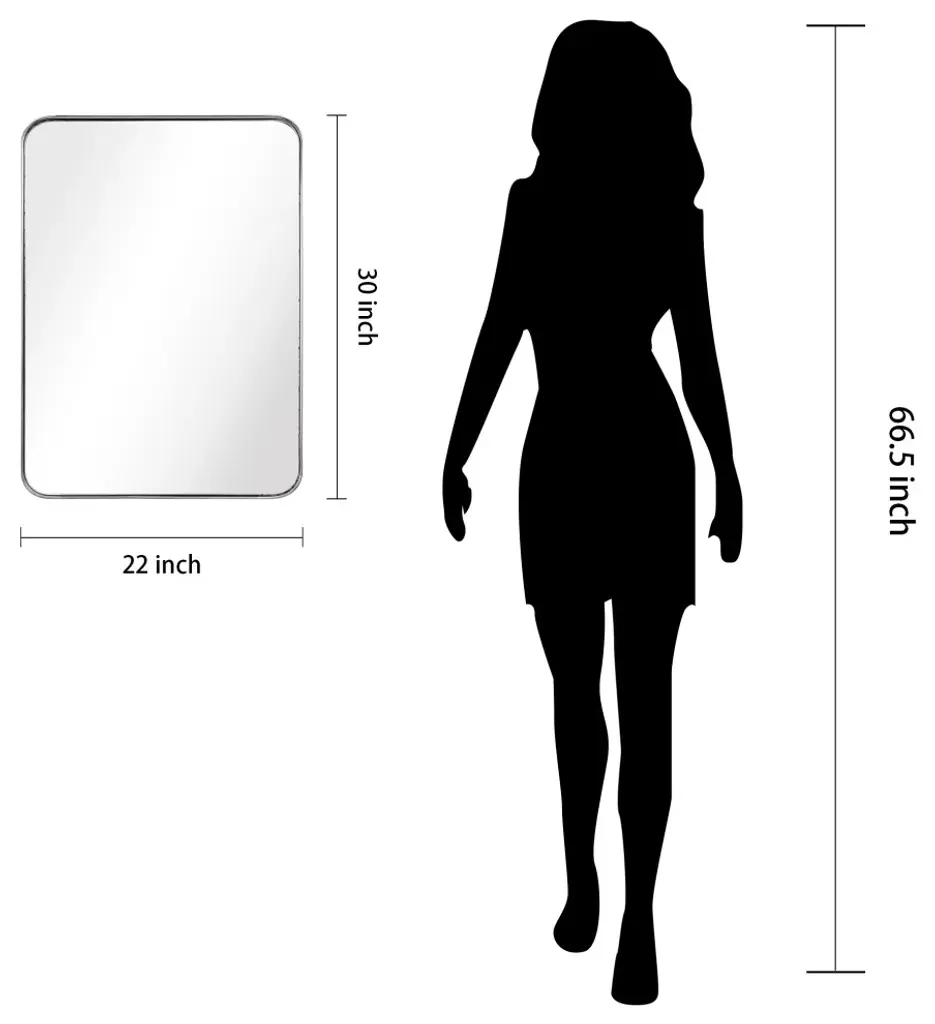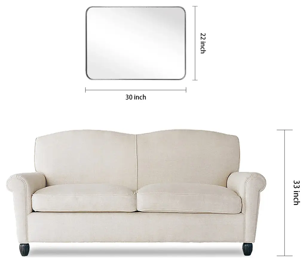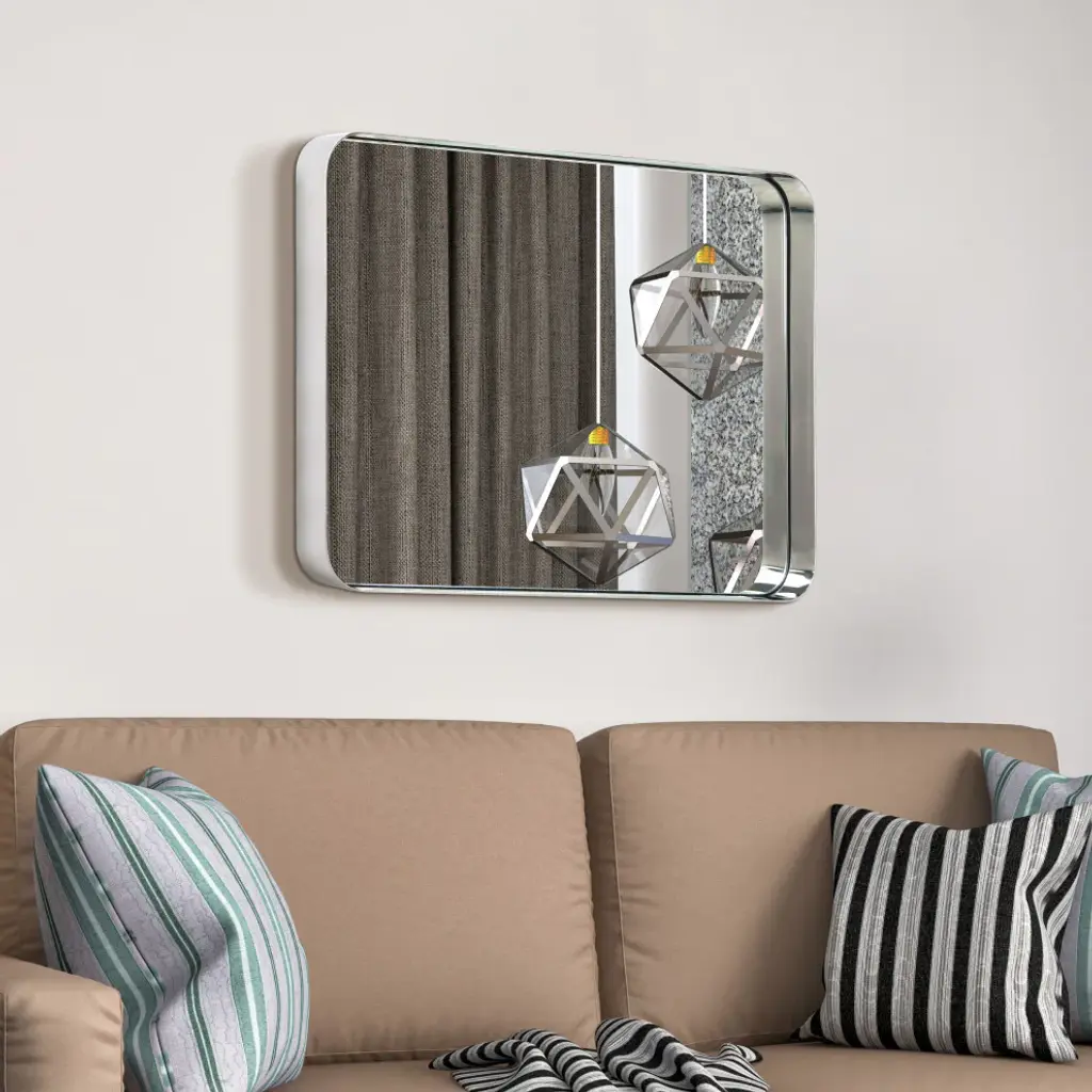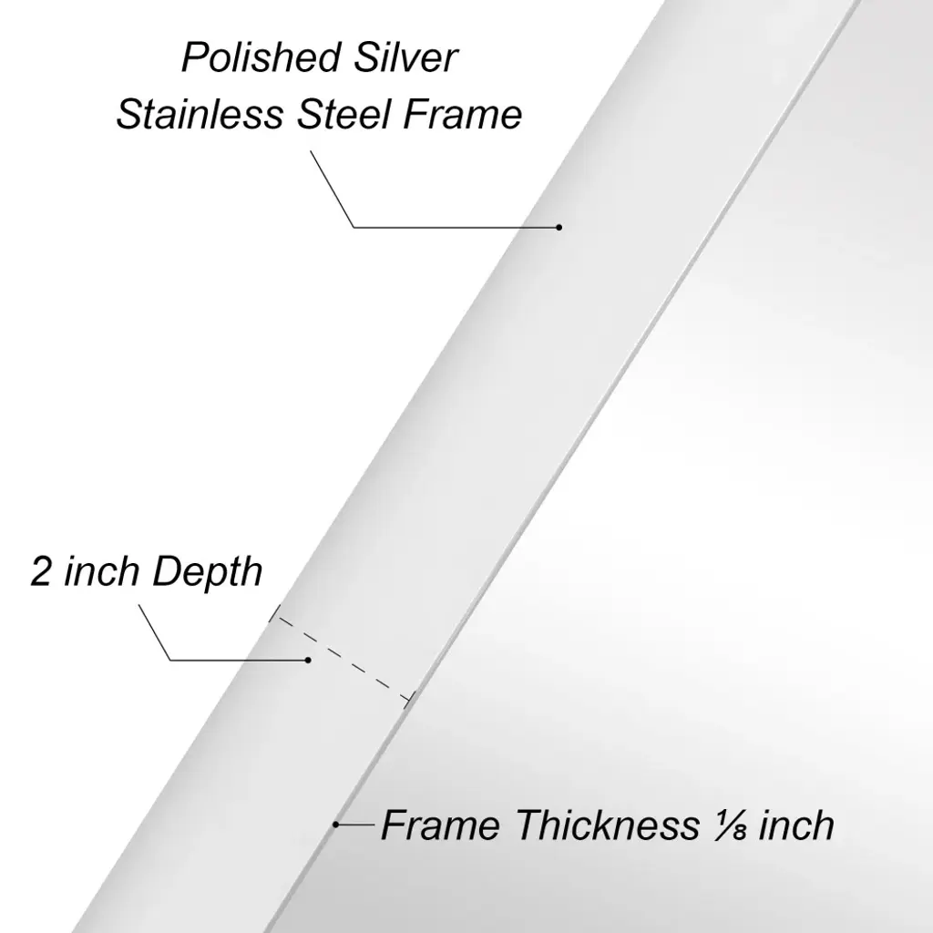 This inspiring 22" x 30" rectangular wall mirror is incredible for adding utility and function to wall space without compromising on minimalistic beauty. With a polished silver stainless-steel frame, this piece embodies the ultimate in quality and modern presentation. This mirror uses silver glass, making sure NO distortion or wrapping. All that is needed to hang this mirror are EZ anchors that can be purchased at your Lowes or Home Depot. 4 strong pre-installed D-Rings are attached to the back of the product for quick and easy installation either vertically or horizontally.