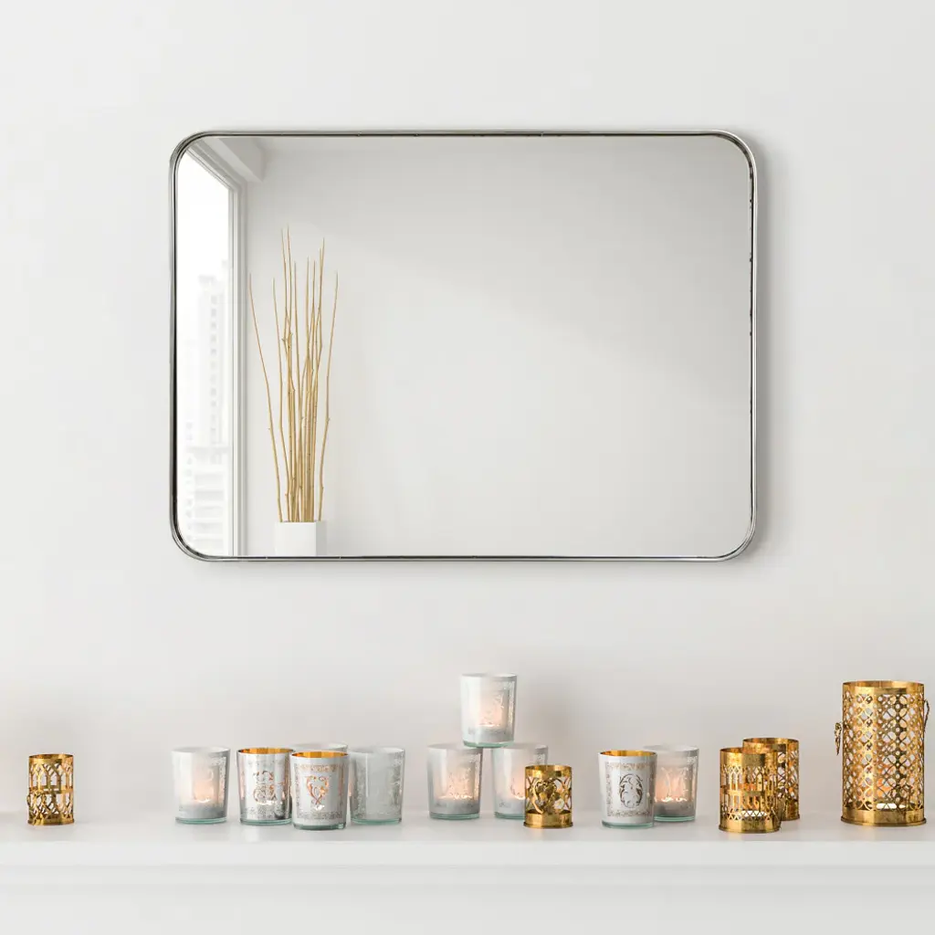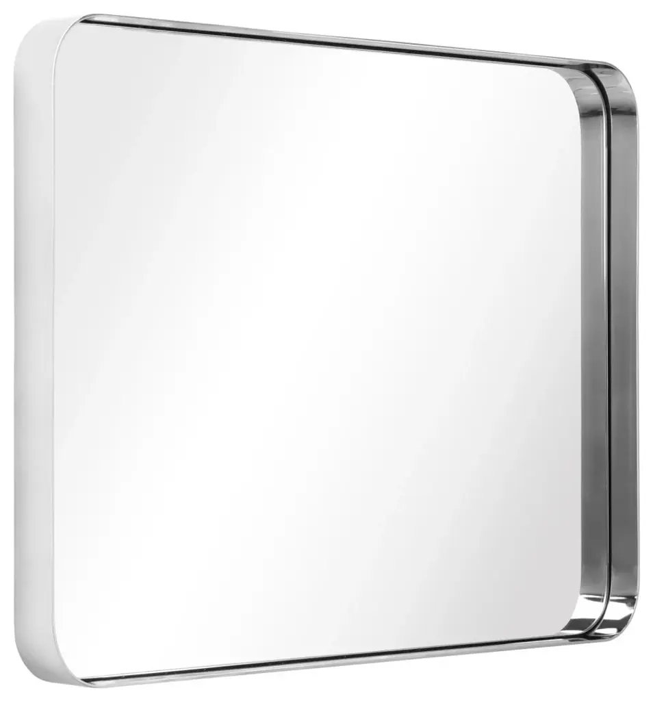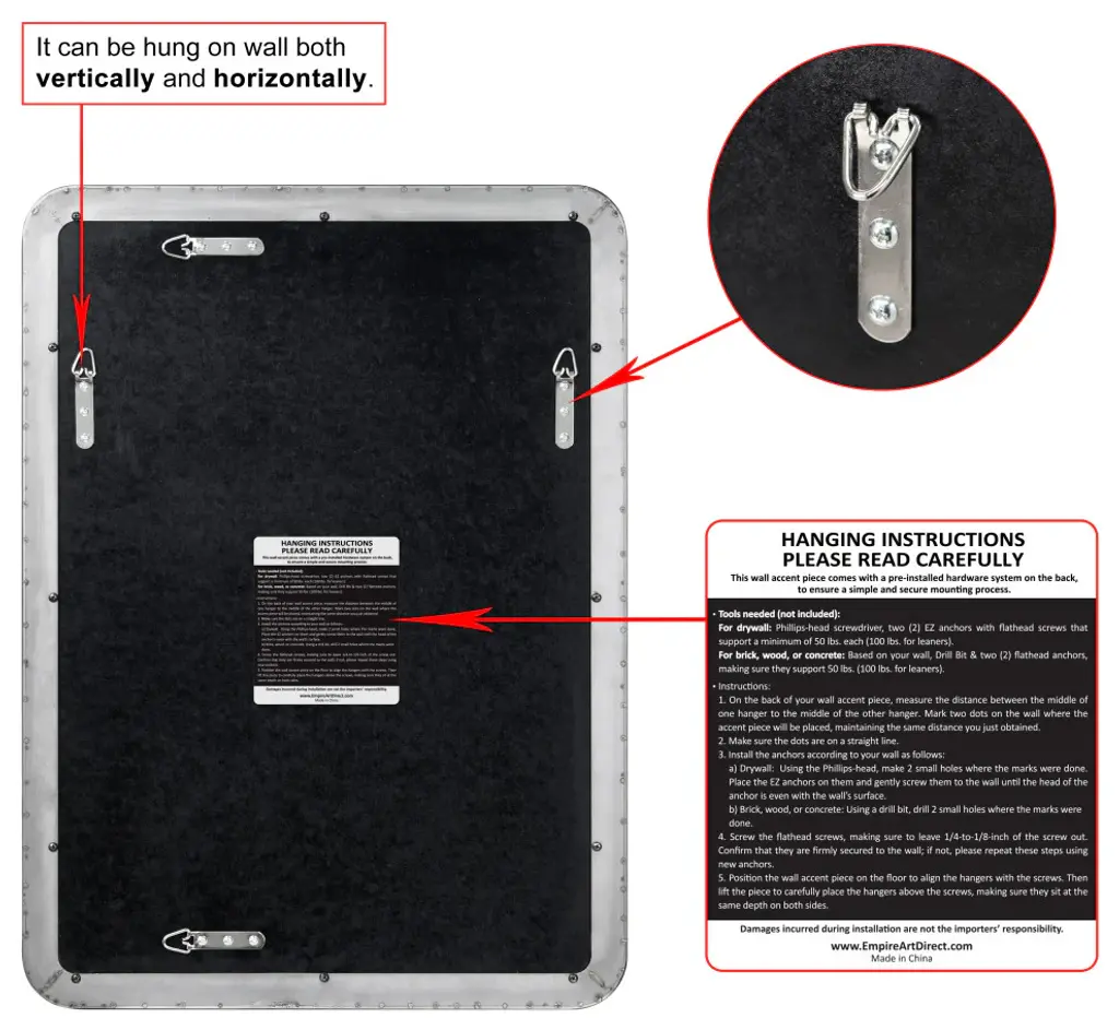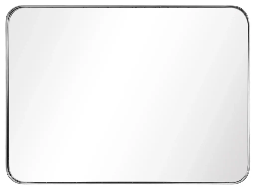 This inspiring 22" x 30" rectangular wall mirror is incredible for adding utility and function to wall space without compromising on minimalistic beauty. With a polished silver stainless-steel frame, this piece embodies the ultimate in quality and modern presentation. This mirror uses silver glass, making sure NO distortion or wrapping. All that is needed to hang this mirror are EZ anchors that can be purchased at your Lowes or Home Depot. 4 strong pre-installed D-Rings are attached to the back of the product for quick and easy installation either vertically or horizontally.