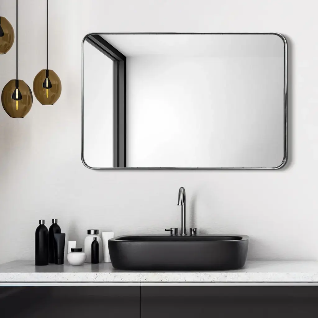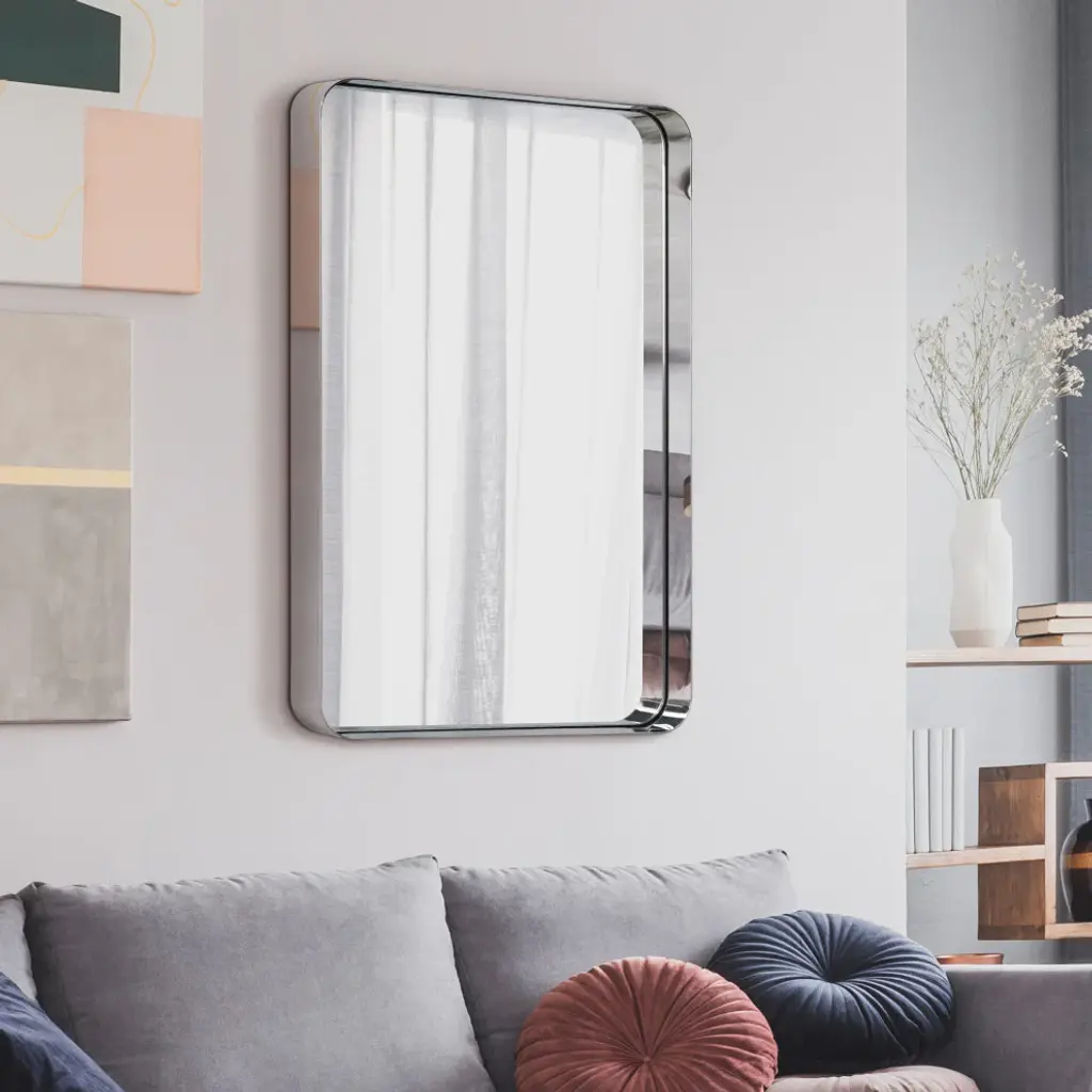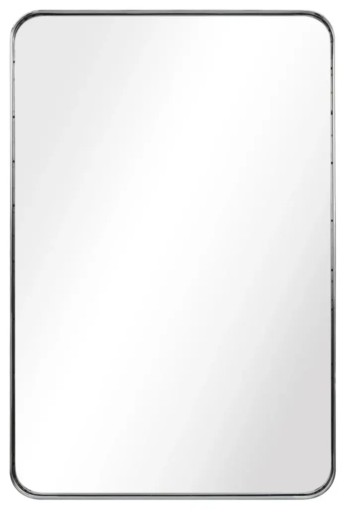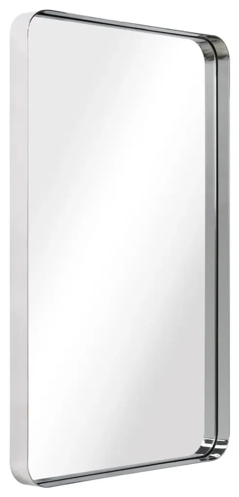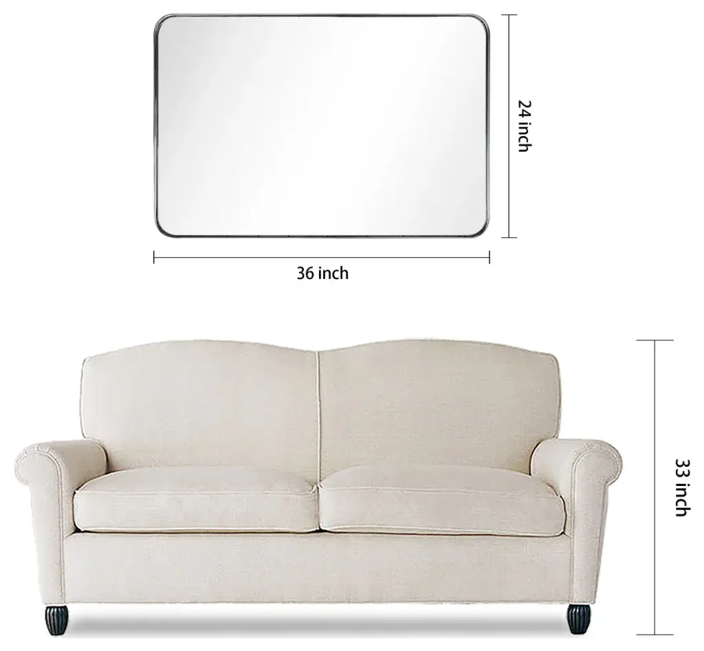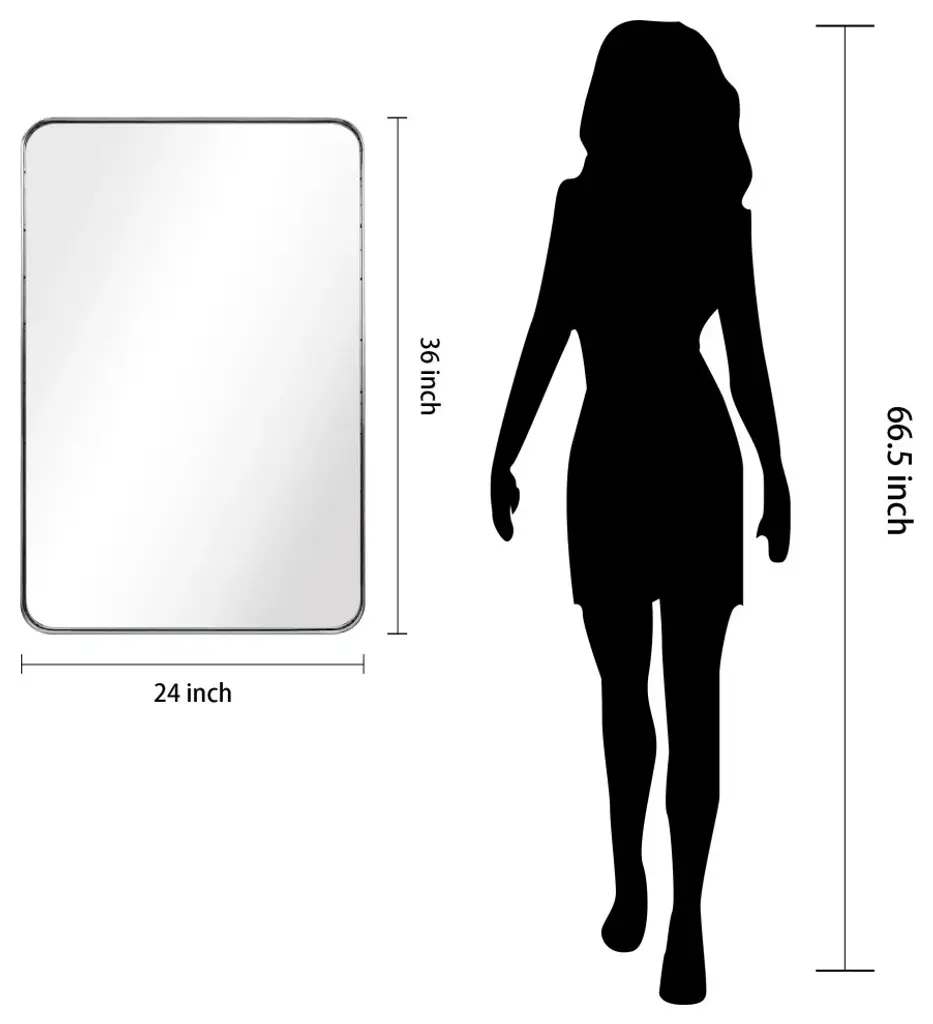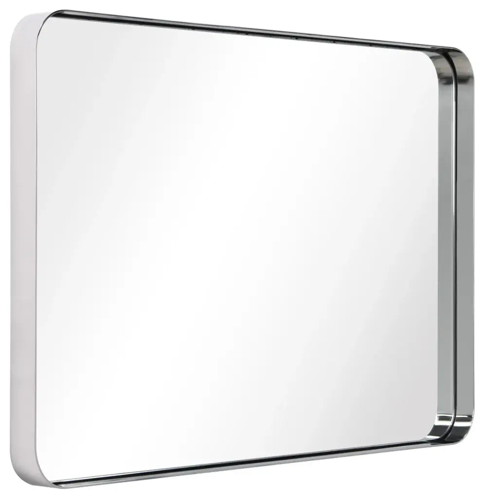 This inspiring 24" x 36" rectangular wall mirror is incredible for adding utility and function to wall space without compromising on minimalistic beauty. With a polished silver stainless-steel frame, this piece embodies the ultimate in quality and modern presentation. This mirror uses silver glass, making sure NO distortion or wrapping. All that is needed to hang this mirror are EZ anchors that can be purchased at your Lowes or Home Depot. 4 strong pre-installed D-Rings are attached to the back of the product for quick and easy installation either vertically or horizontally.