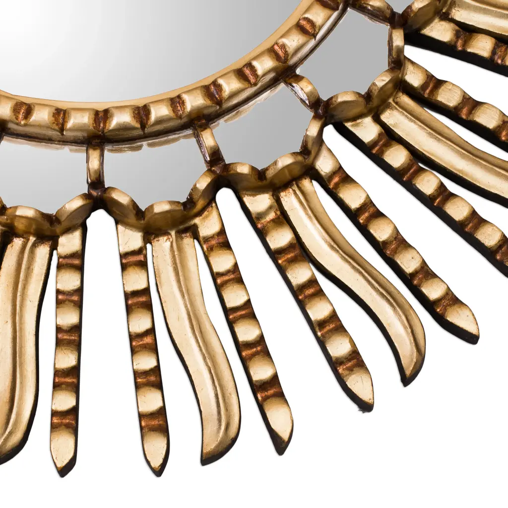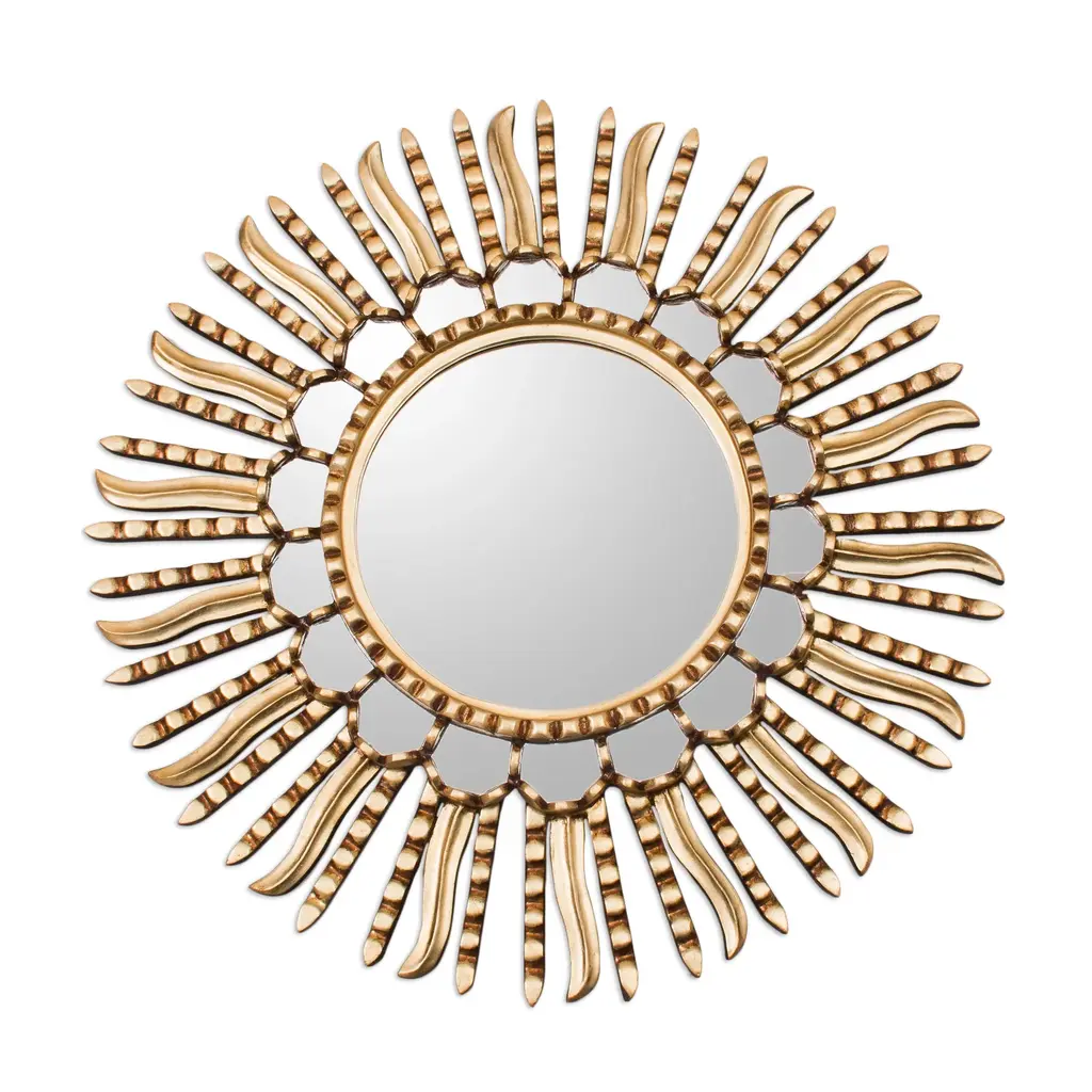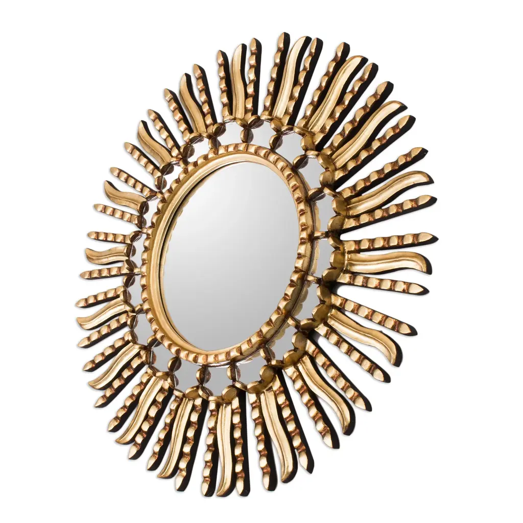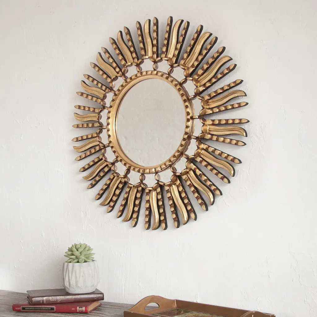 A sun of spectacular beauty radiates golden light in a mirror frame designed by Marcos Luzalde. He crafts the wood frame by hand with lavish detail and adorns it with bronze leaf applications.