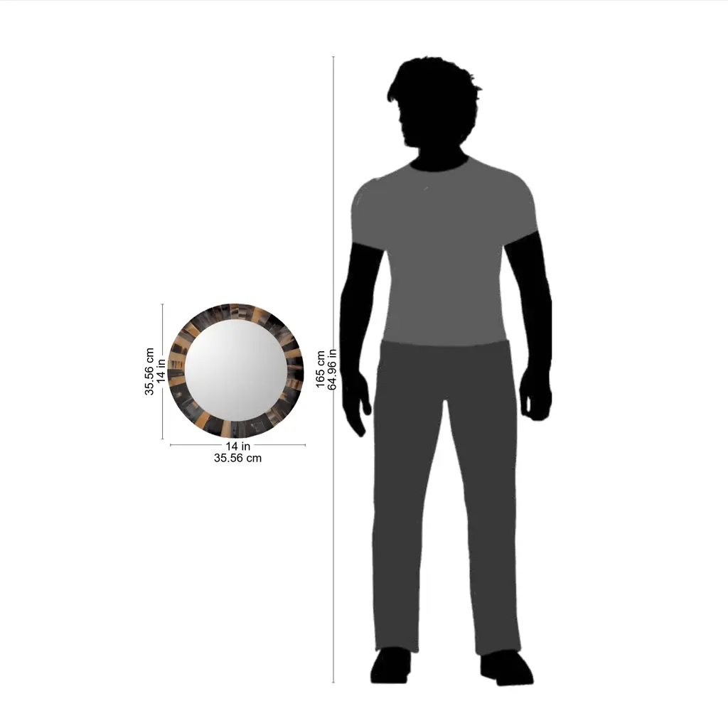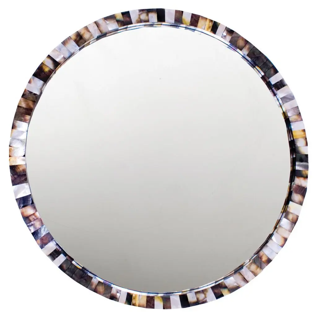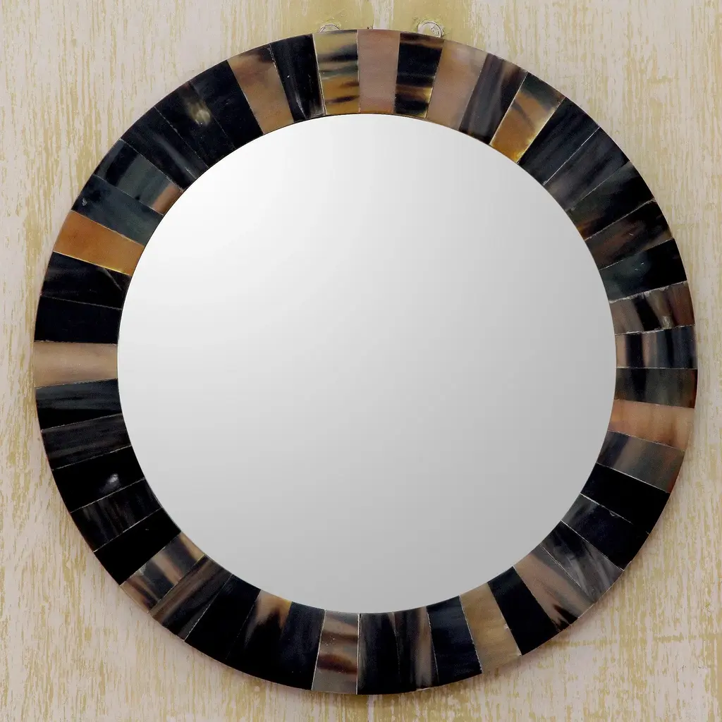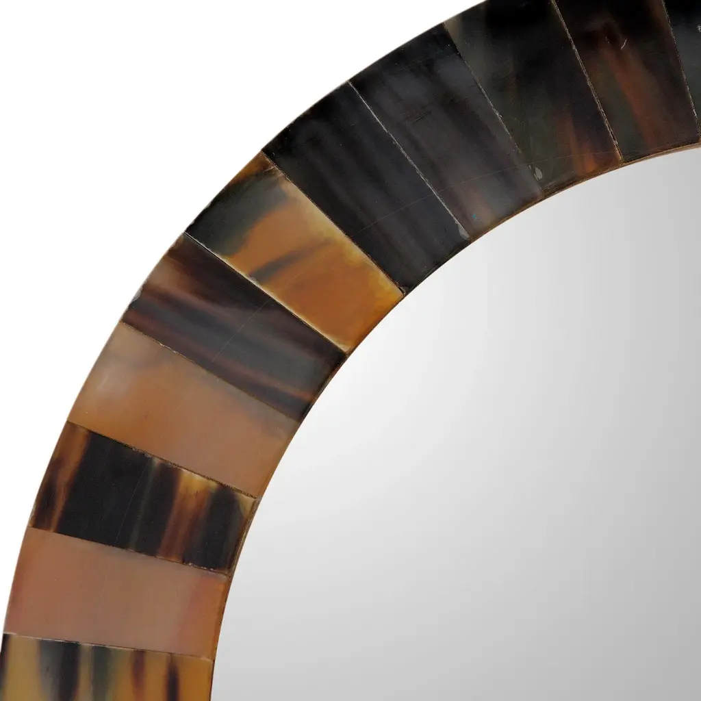 Wonderfully variegated tiles of smooth buffalo horn are used to tile this mirror from Kamal in India. The round wall mirror adds earthy elegance to any room.Please note: as the frame is crafted with natural buffalo horn, colors may vary widely.
