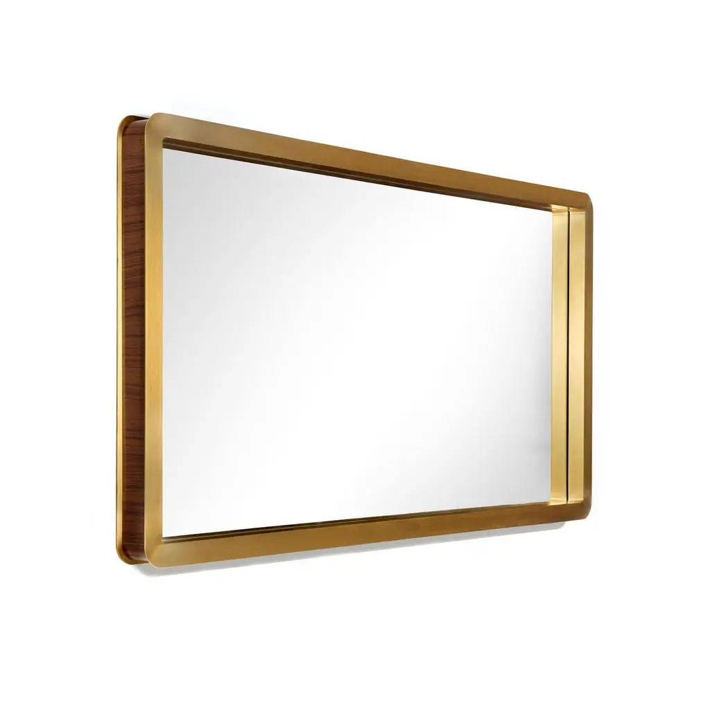 A person’s identity isn’t an immediate perception but, instead, it has to be unveiled. The unveil mirror portraits the unknowns of human Identity.The brass frame around the mirror means that first look to someone, when, sometimes, we wrongly believe that we already have seen it all. A more closely observation to its modern design shows exquisite details.With the exquisite combination of wood, mirror and brass, this mirror makes a statement in interior design projects that look for a retro design with a sense of luxury.Product detailsWood: handcrafted structure with side view finished in walnut veneer with half gloss varnish.Metal frame: brushed brass with matt varnish.Product optionsWood: Other veneers, natural or aged gold/silver/copper leaf or lacquered in any Ral Classic color.Metal frame: polished, brushed, oxidized brushed or aged brushed brass/copper/steel.Weight34Kg 75 lbsMade to order. Custom sizes and other finishes are available under request.Designed by Joana Santos Barbosa for InsidherLand, 2016. Handmade in Portugal.