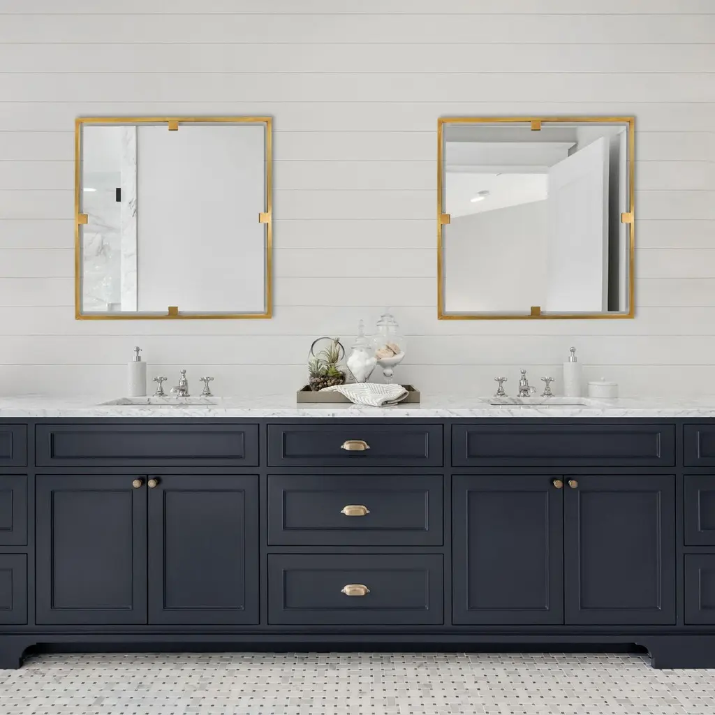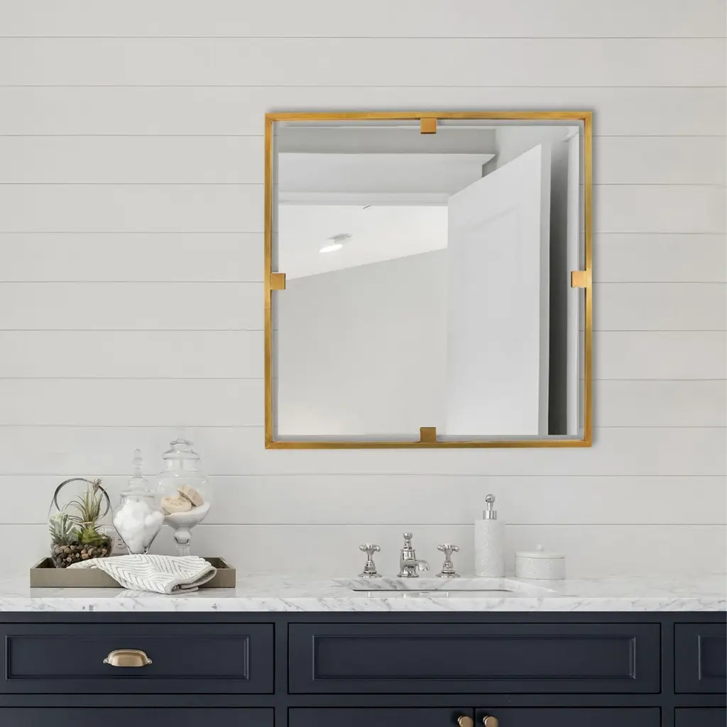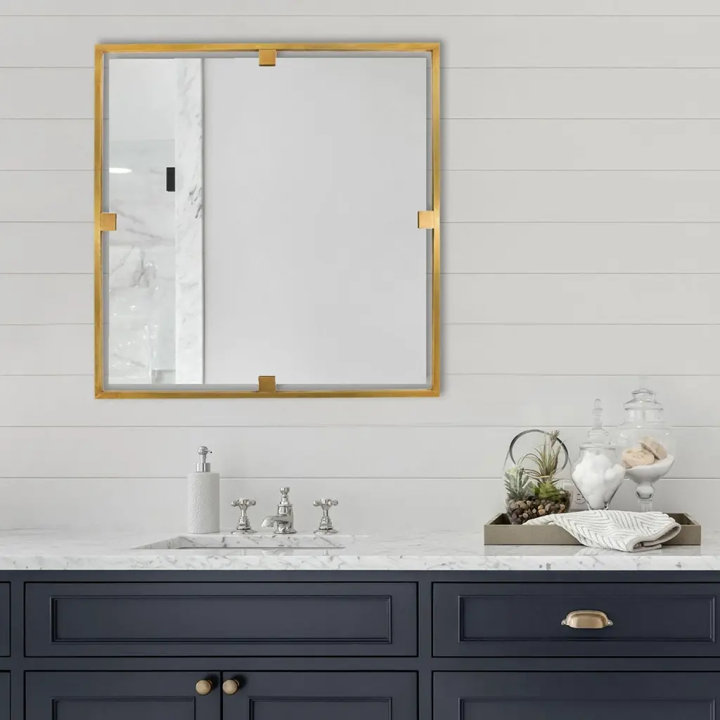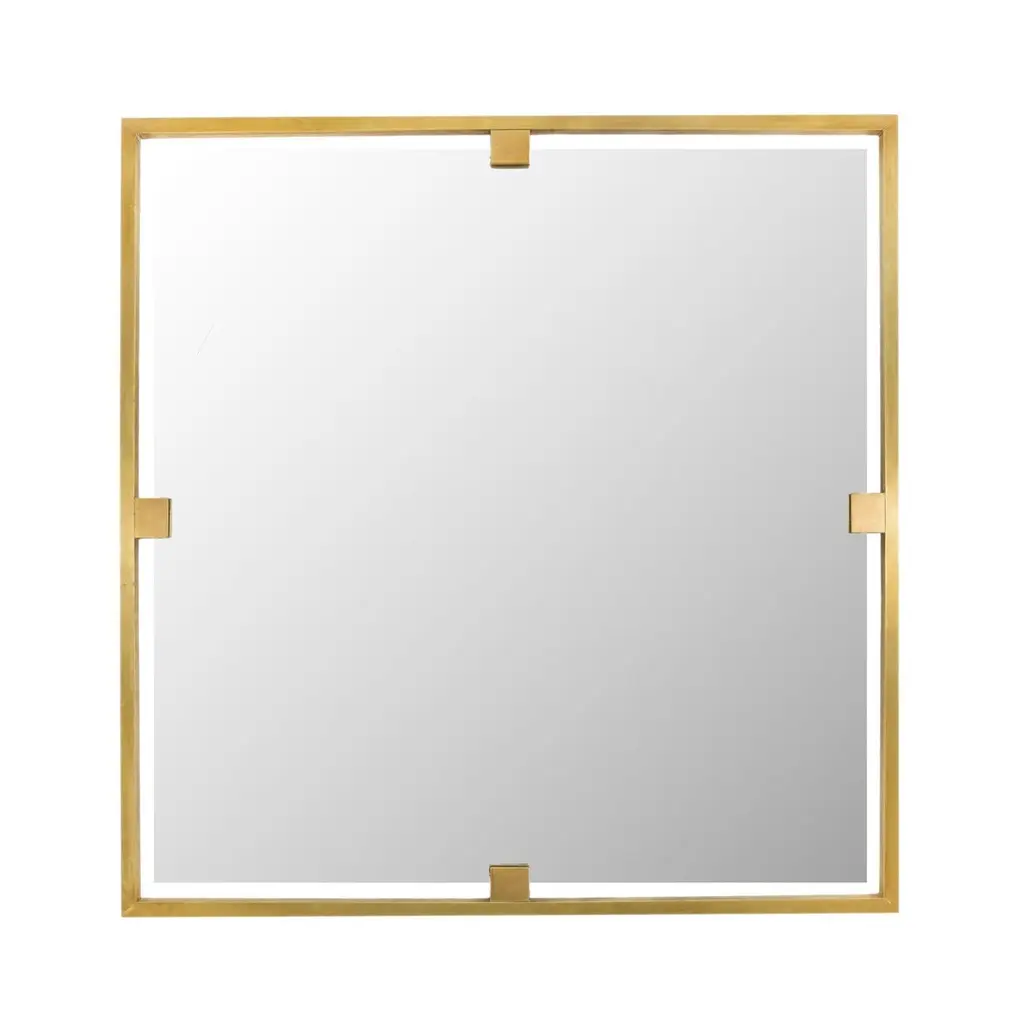 Large square mirror with brass edging and clips from the Timeless collection. Its shape is geometric and clean, if chosen in nickel or chrome finishes it is perfect for creating a sense of amplitude in a bathroom that is not too large or in natural brass above a chest of drowers in the master suite.