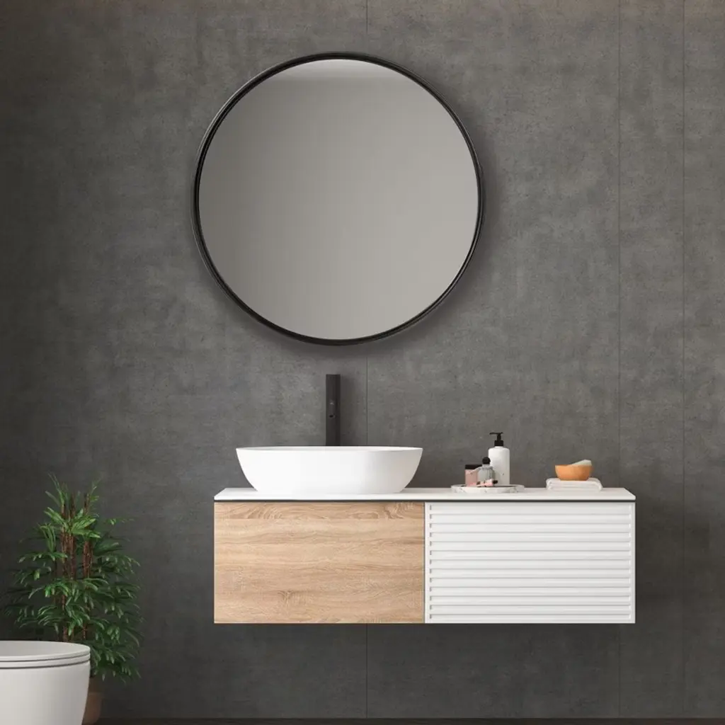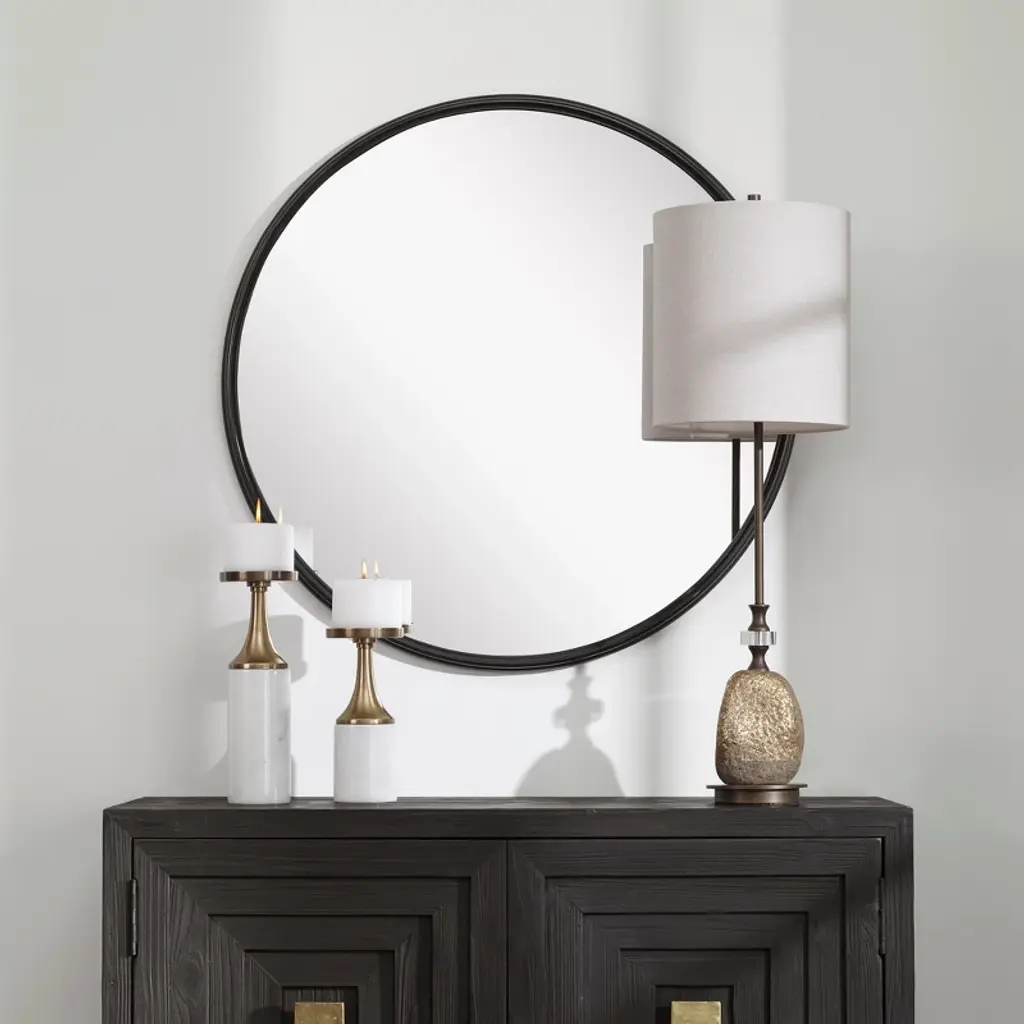The Uttermost Belham Round Iron Mirror brings modern rustic elegance to any room. With its bold round frame and iron detailing, this piece is designed to make a statement while seamlessly blending into farmhouse, industrial, or contemporary spaces. Key Features: Enhance Your Space – Add a bold statement with this large 34.9" round iron wall mirror.Durable Build – Crafted from MDF, iron, and mirror glass for lasting quality.Modern Rustic Style – Blends farmhouse warmth with industrial edge.Versatile Decor – Perfect for entryways, living rooms, bedrooms, or bathrooms.Easy to Hang – Lightweight at 20 lbs with sturdy construction for secure mounting.