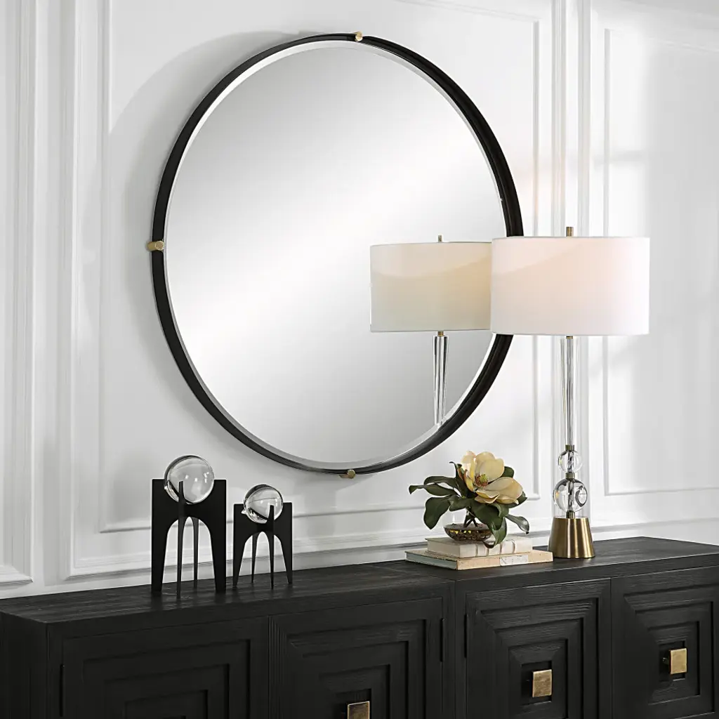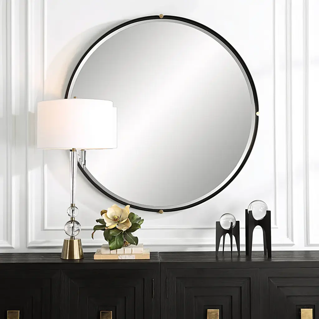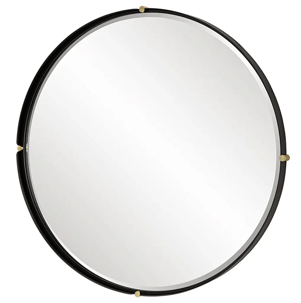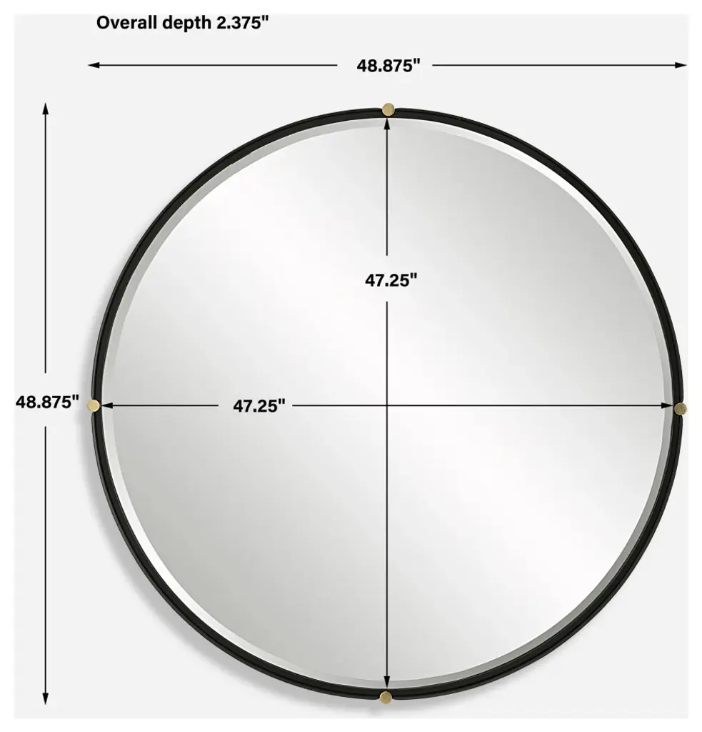 This Large Round Mirror Showcases A Strap Style Iron Frame Finished In A Sleek Matte Black With Soft Curved Ends That Encompass Antique Gold Column Medallions. The Floating Style Mirror Has A Generous 1 1/4" Bevel.
