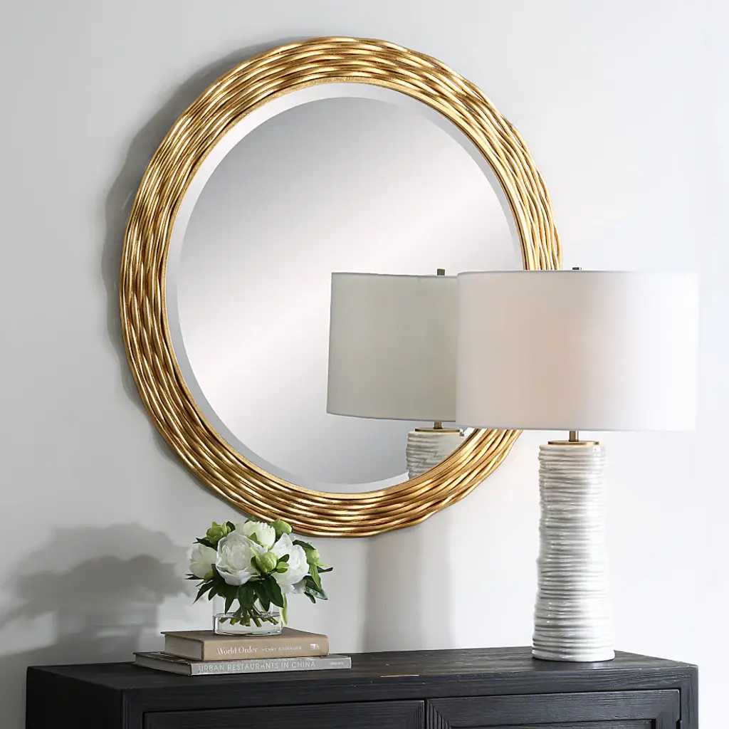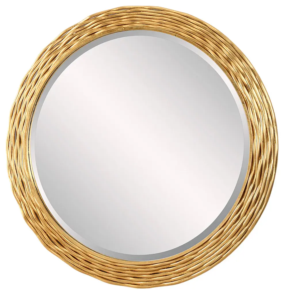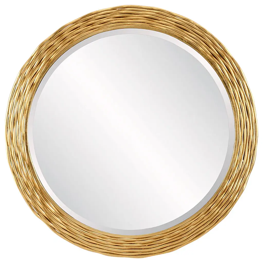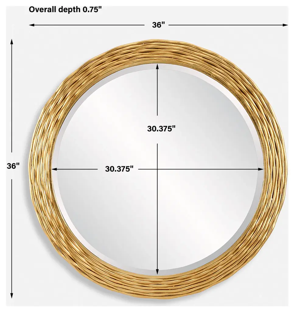 Our Celeste Round Mirror Is Crafted With Layered Iron Rods Meticulously Hand-forged To Create A Graceful, Alternating Wavy Texture. This Unique Design Exudes A Soft Yet Industrial Elegance, Finished In A Lightly Antiqued Gold Leaf. Mirror Has A Generous 1 1/4" Bevel.