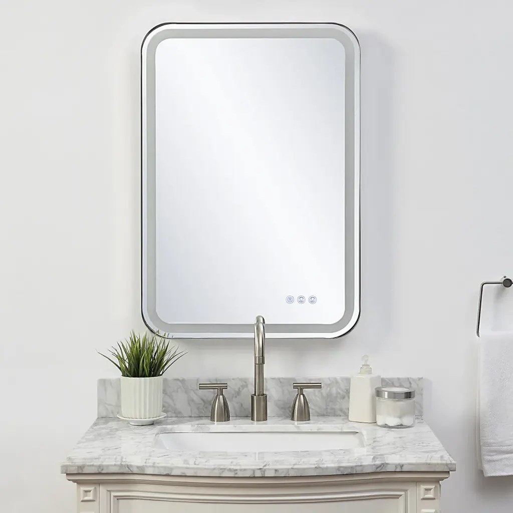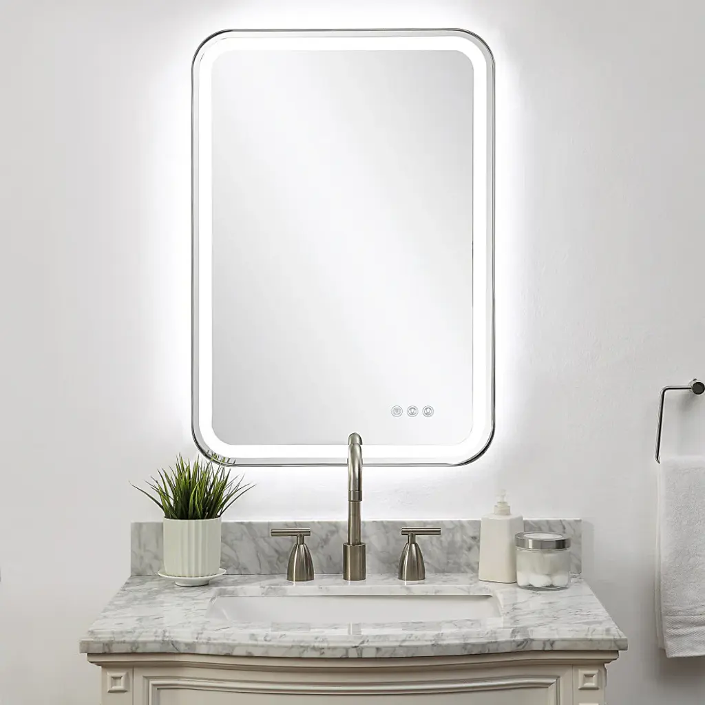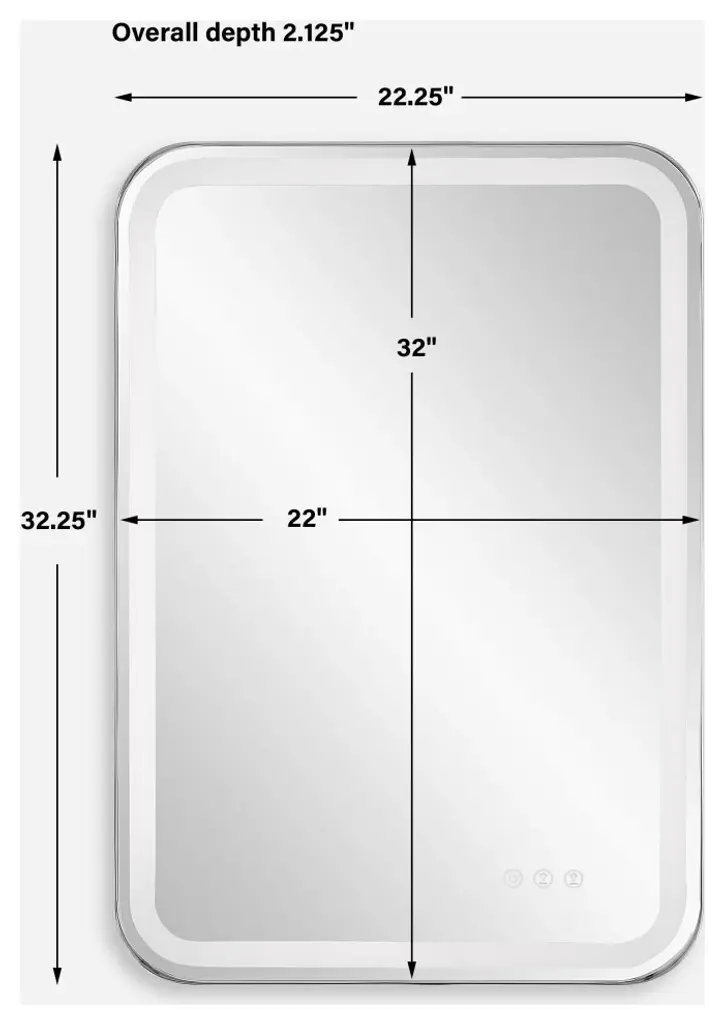 Versatile In Design, This Vanity Mirror Has Integrated LED Lighting That Illuminates Through The Frosted Strip In The Polished Edged Mirror. The Polished Nickel Plated Stainless Steel Frame Is Off Set From The Wall To Allow Ambient Lighting From The Back. Easy To Use Touch Buttons Are Featured On The Bottom Right Of The Mirror With An On Off Function, Touch And Hold Kelvin Control From 2700k To 4000k, And Touch And Hold Brightness Control. LED Lights Rated At 40,000 Hours. Ships With Plug, But Can Be Hardwired Professionally. Touch Screen Icons Continue To Illuminate When Powered Off For Easy Navigation In Dark Settings.