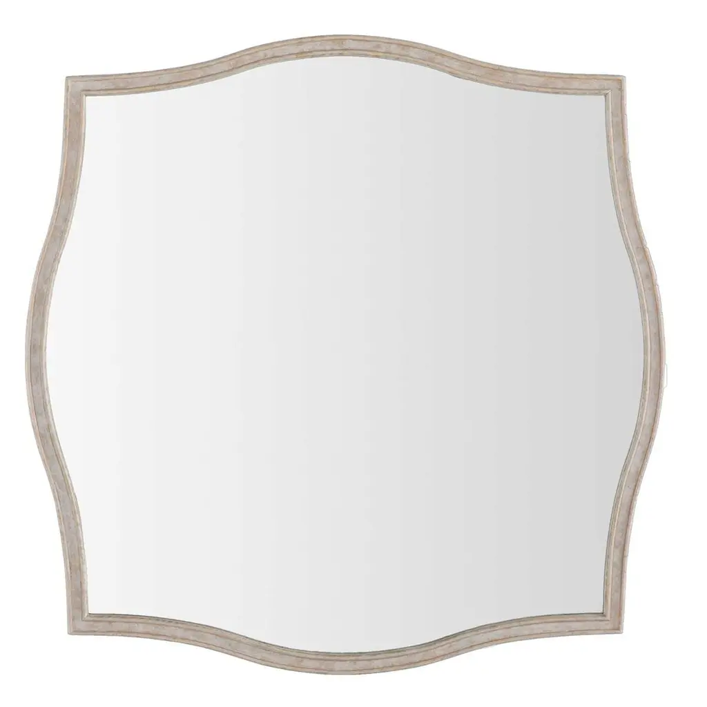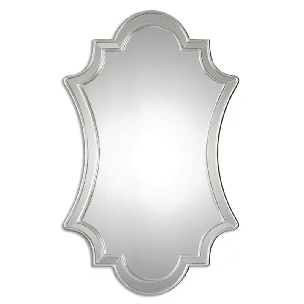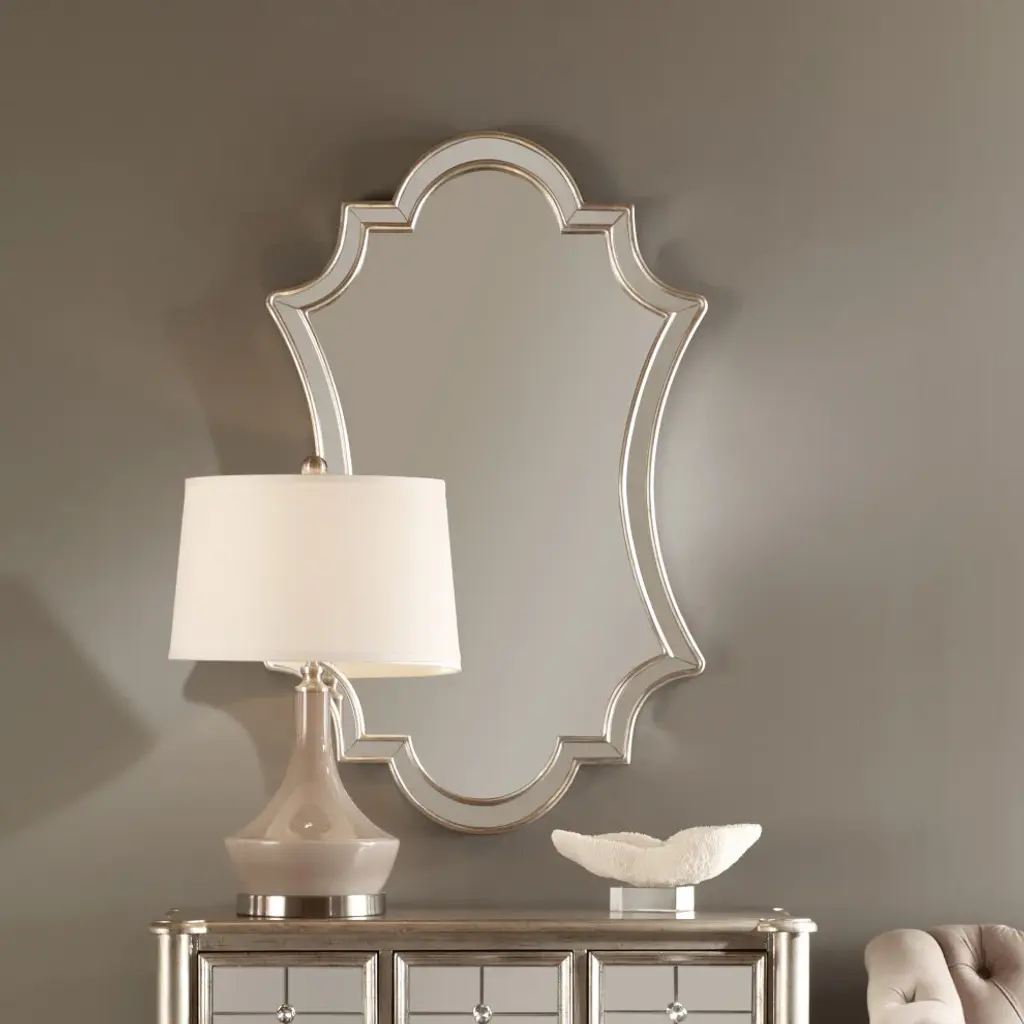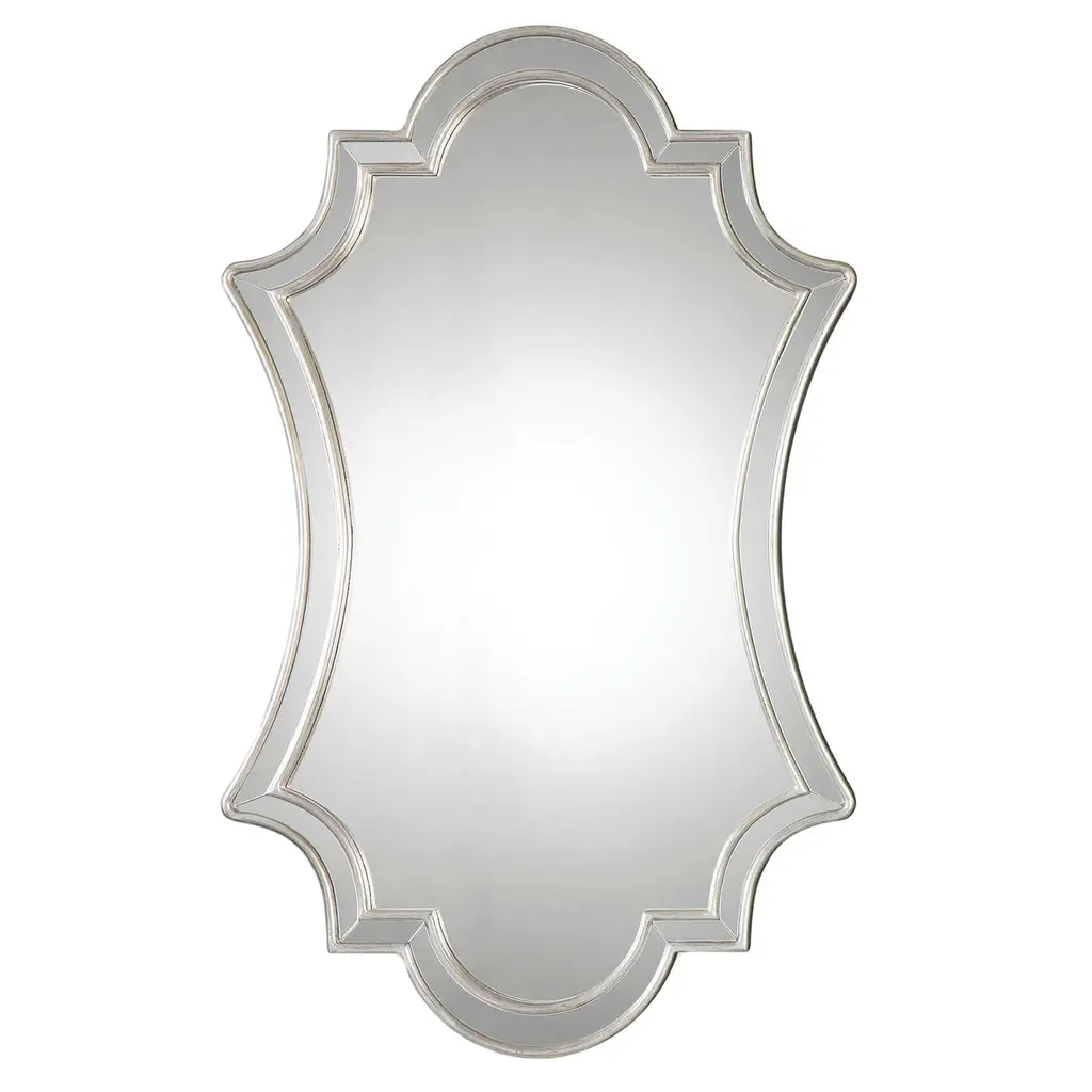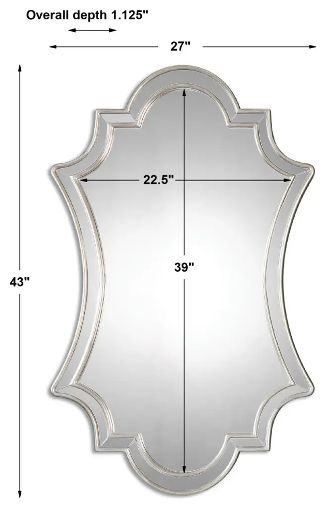 This curvaceous mirror features a lightly antiqued silver finish accented with smooth, polished edges.Features: • Materials: PU, MDF, glass • Finish: Silver • Contemporary styleSpecifications: • Product Dimensions: 43"H x 27"W x 1.13"D • Product Weight: 14.3 lbs • Product Dimensions: (Mirror/Glass) 39"H x 22.25"W x 0.19"D • Product Dimensions: (Cube) 3.2"