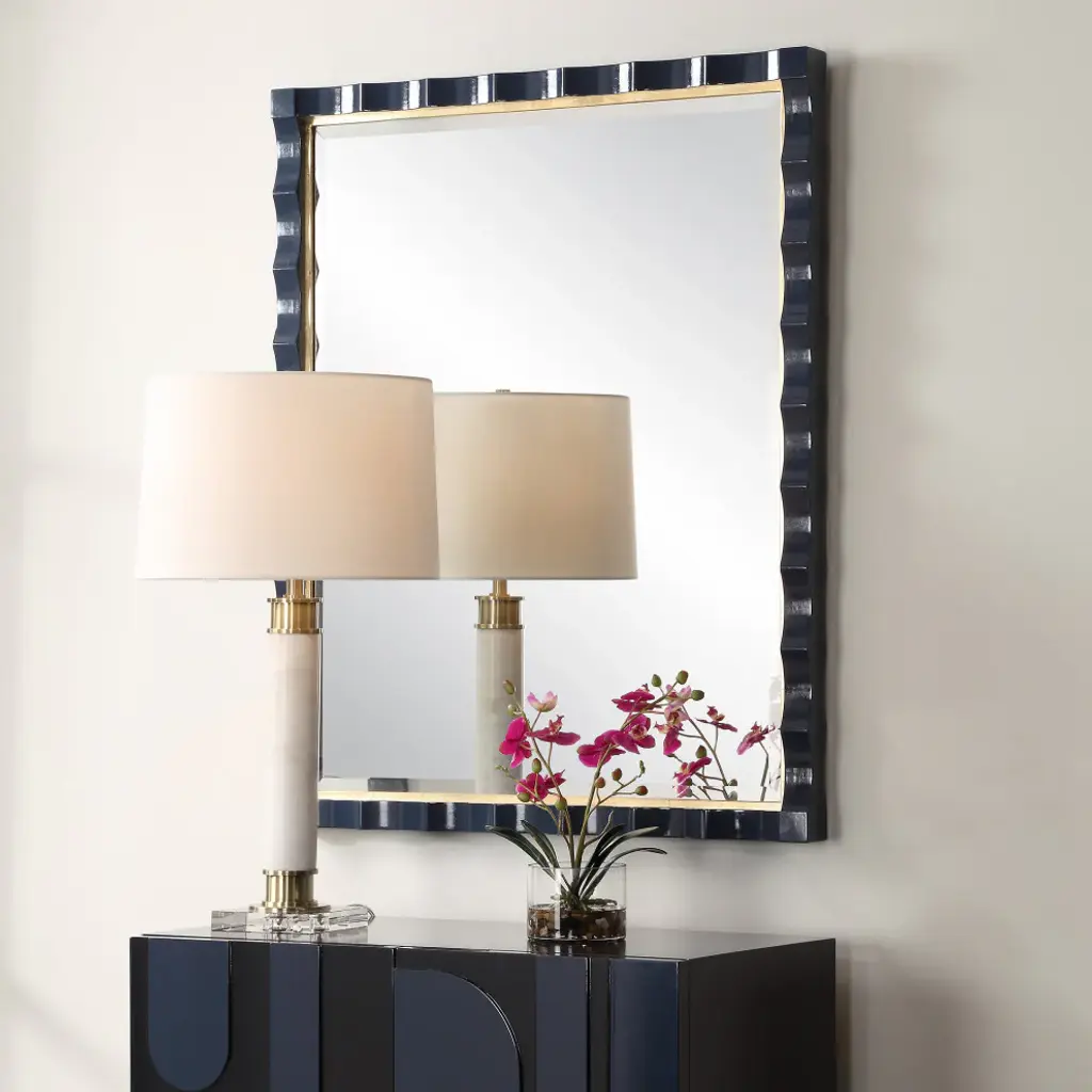 Elegantly Designed With A Scalloped Edge And A Stunning Gold Leaf Inner Liner, This Piece Is Beautifully Finished In A Rich, High-gloss Navy Lacquer. Perfect For Adding A Touch Of Luxury And Depth To Any Room, The Gulf Mirror Blends Classic Charm With A Modern Twist. A Generous 1" Bevel Is Added To This Piece, Which May Be Hung Horizontal Or Vertical.