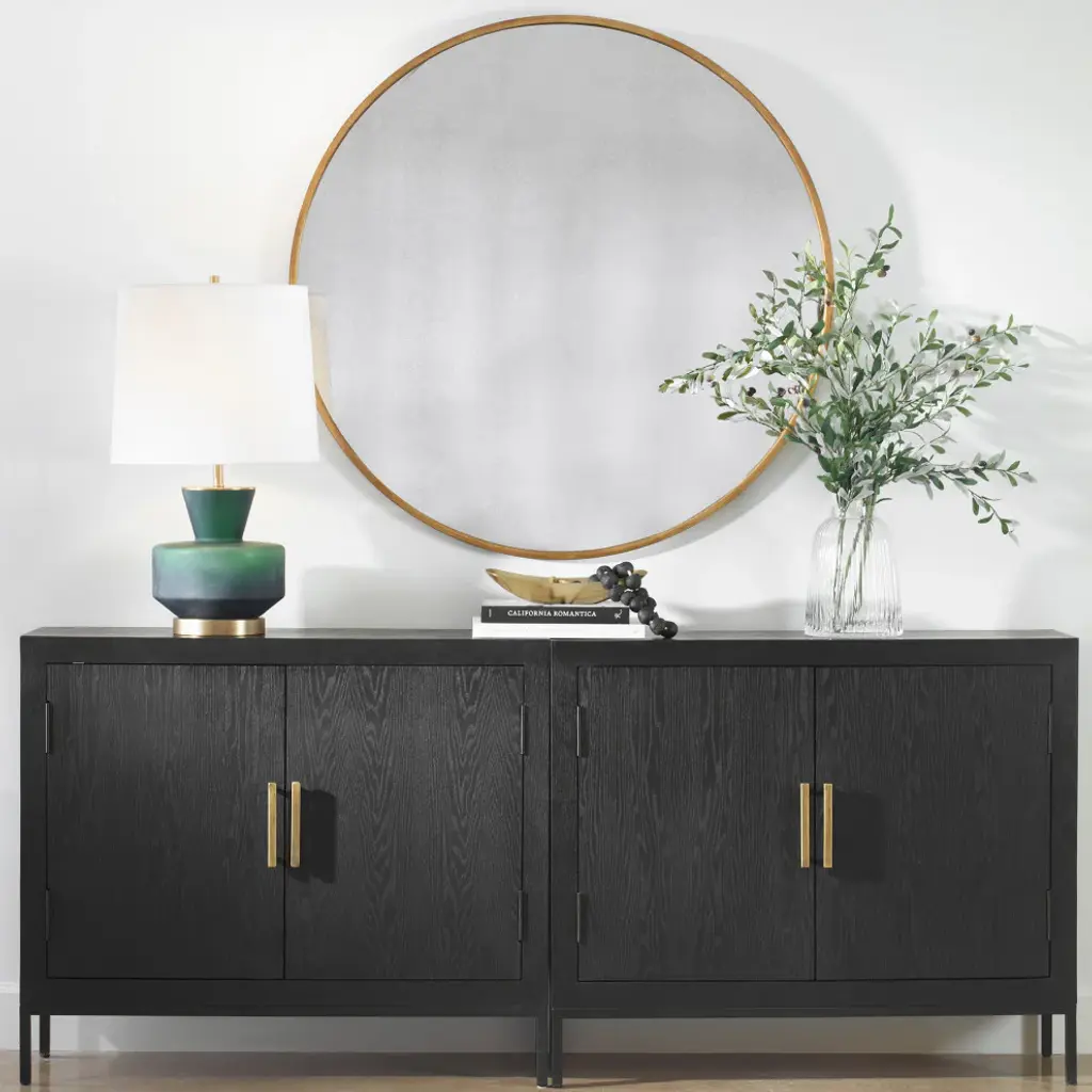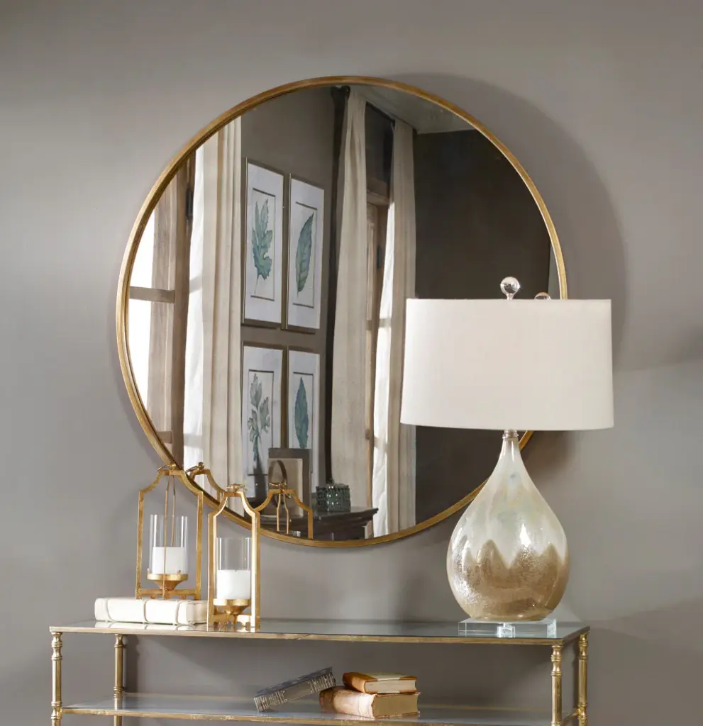 The Uttermost Junius instantly provides a dose of glamour for your design. It''s simple and minimalistic with a round shape and slim frame, yet manages to make an impression with its antiqued mirror face and gold-leaf finish. Hang it in your foyer as an elegant welcome home, or use it to reflect your living room''s chic look.Antique-style round mirrorMetal frameFinish: Gold leafDimensions: W 43" x D 1.25" x H 43"Materials: Metal and MDF