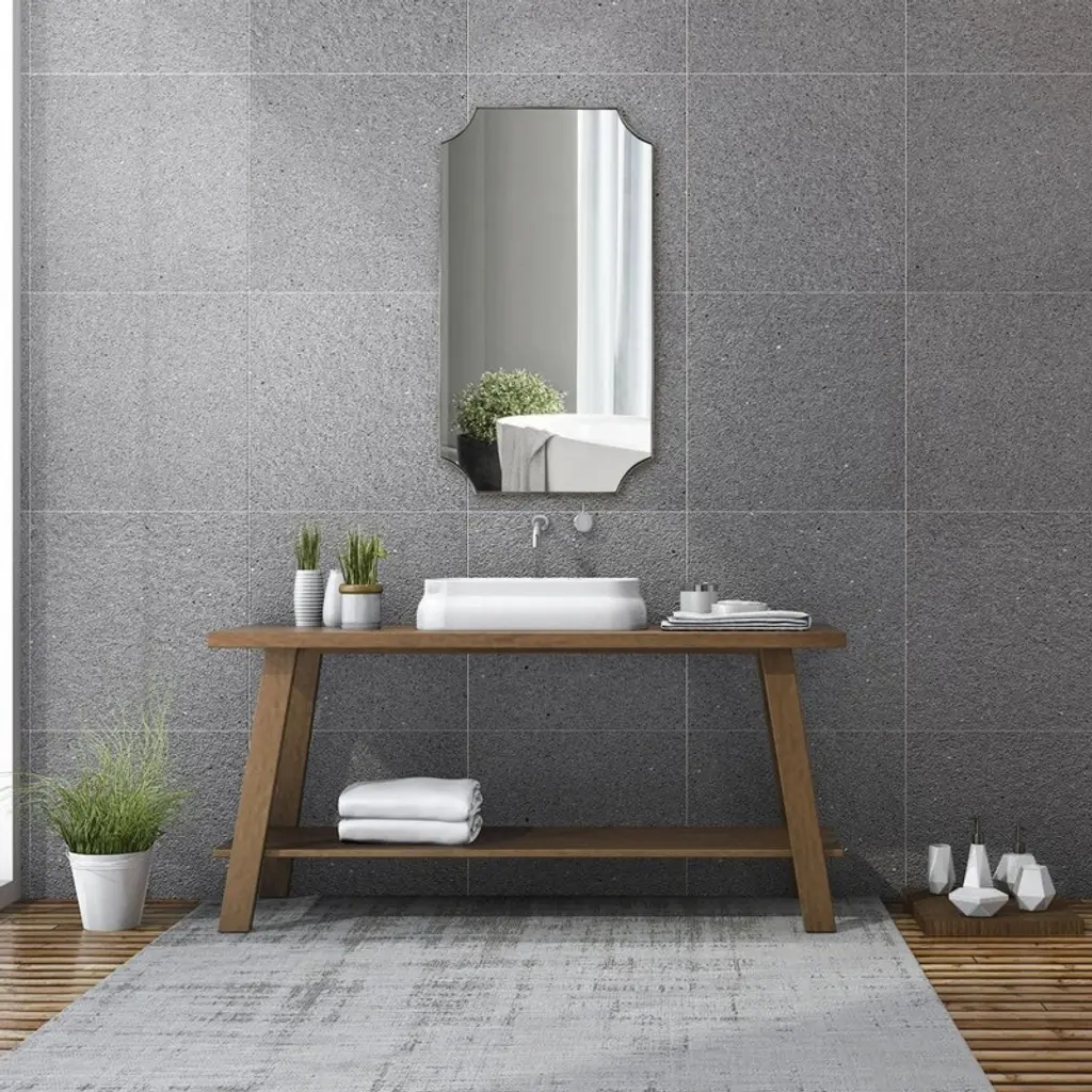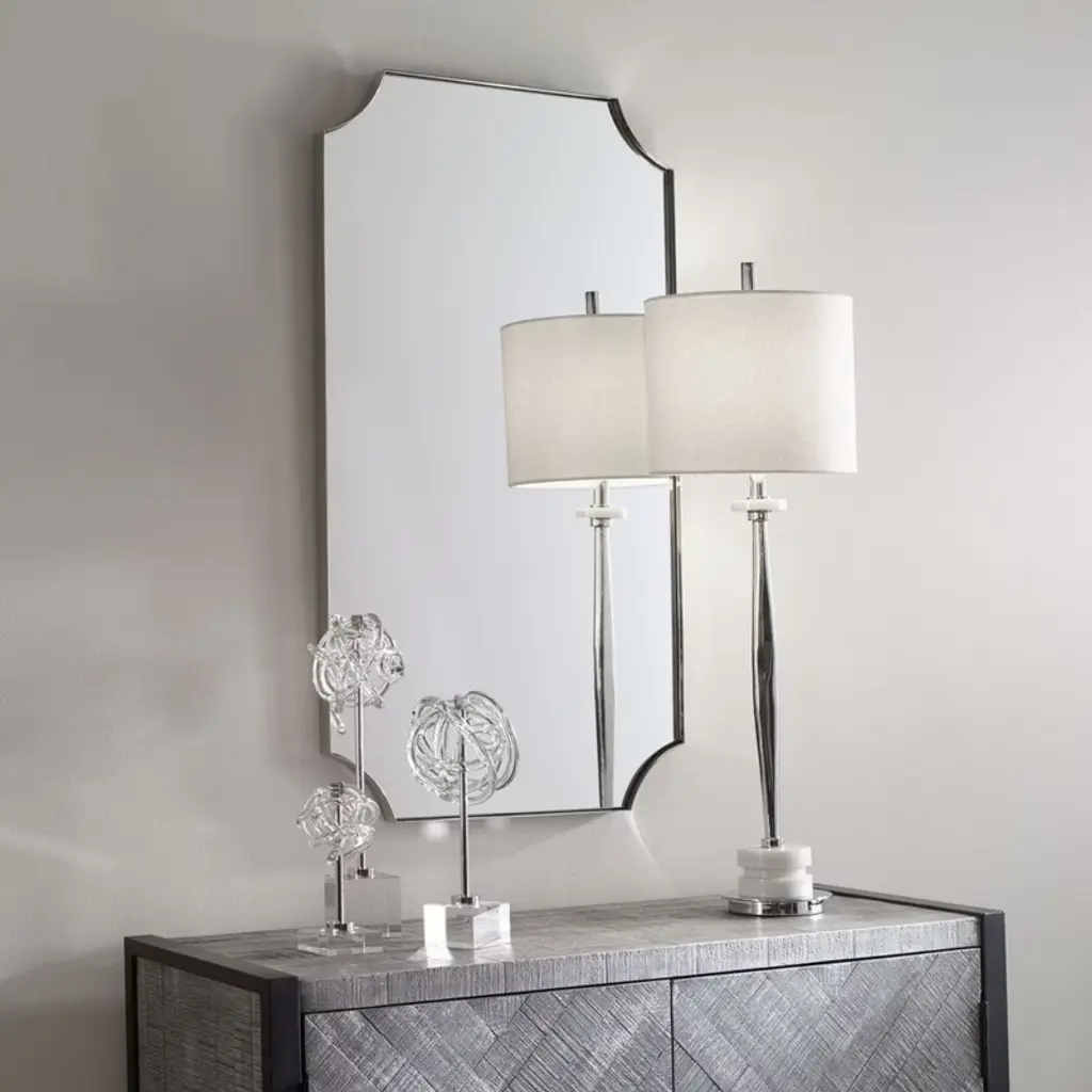 The Uttermost Lennox Nickel Scalloped Corner Mirror offers a refined rectangular silhouette accented by soft scalloped corners. Its nickel finish brings sleek sophistication to modern, transitional, and classic interiors.Constructed with stainless steel, MDF backing, and premium glass, this mirror ensures both strength and crystal-clear reflection. At 40" tall, it’s versatile enough for bedrooms, entryways, living rooms, or bathrooms. Key Features: Sleek nickel finish with scalloped corners adds modern elegance.40" tall rectangular frame creates a bold focal point in any room.Crafted from stainless steel, MDF backing, and premium glass.Reflective design brightens rooms and enhances visual space.Lightweight (23 lbs) for easy and secure wall mounting.