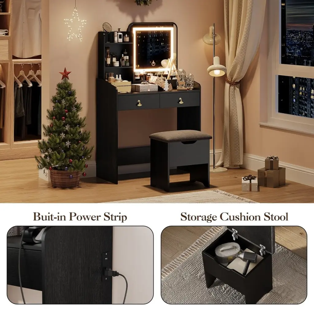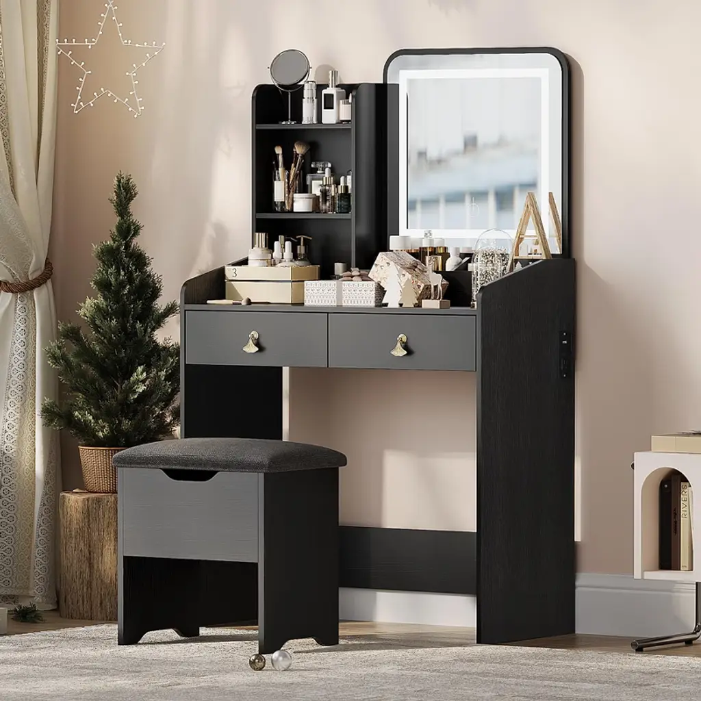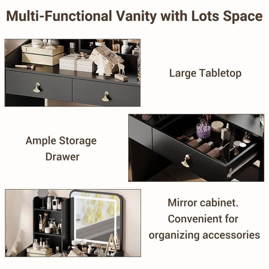 Vanity Desk With Led Light Mirror And Charging Station, Small Makeup Vanities Set With 2 Drawers,black