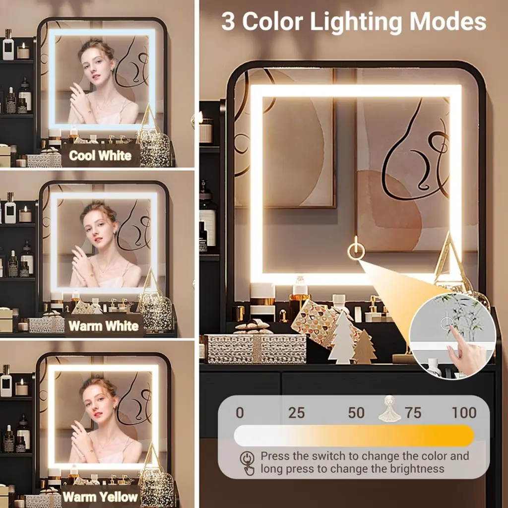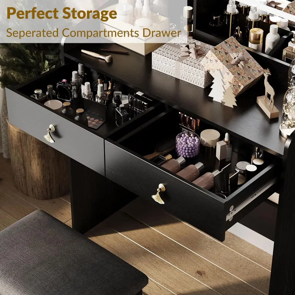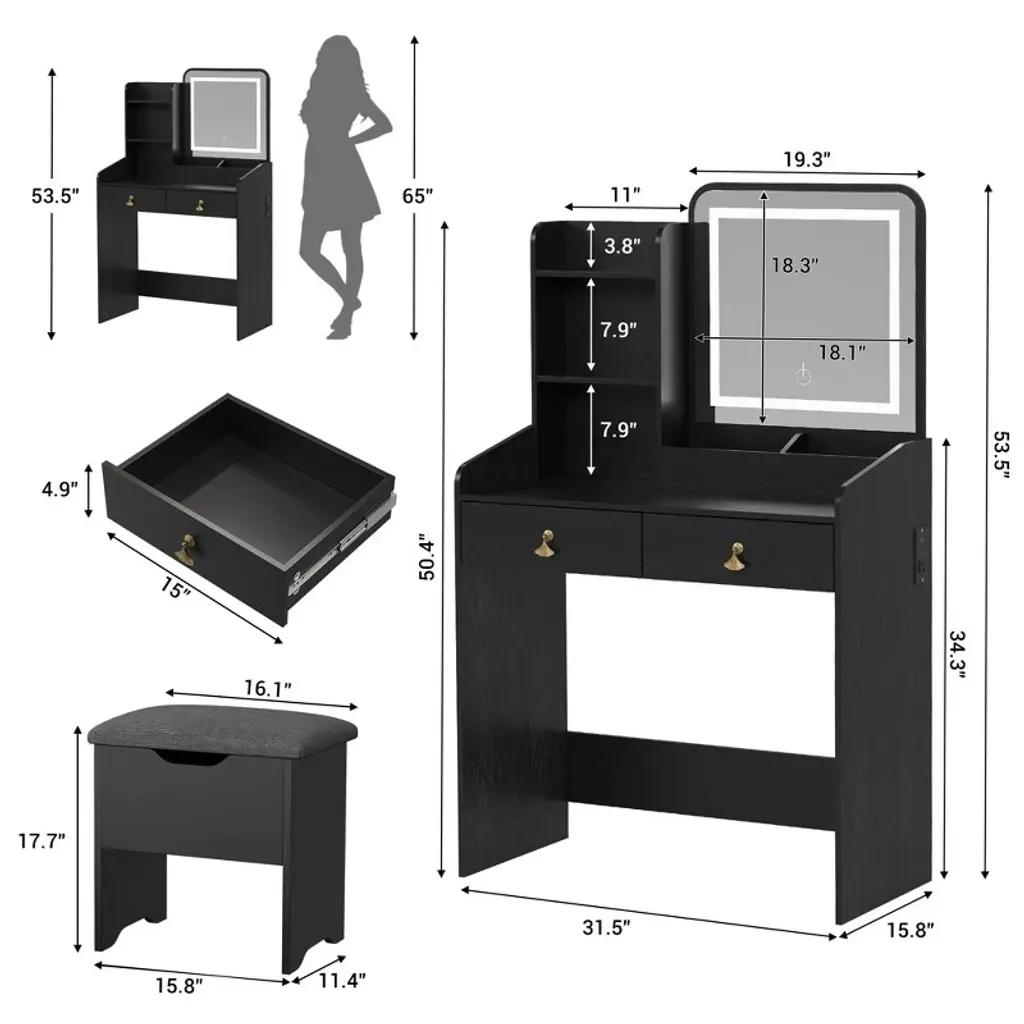 Vanity Desk With Led Light Mirror And Charging Station, Small Makeup Vanities Set With 2 Drawers,black