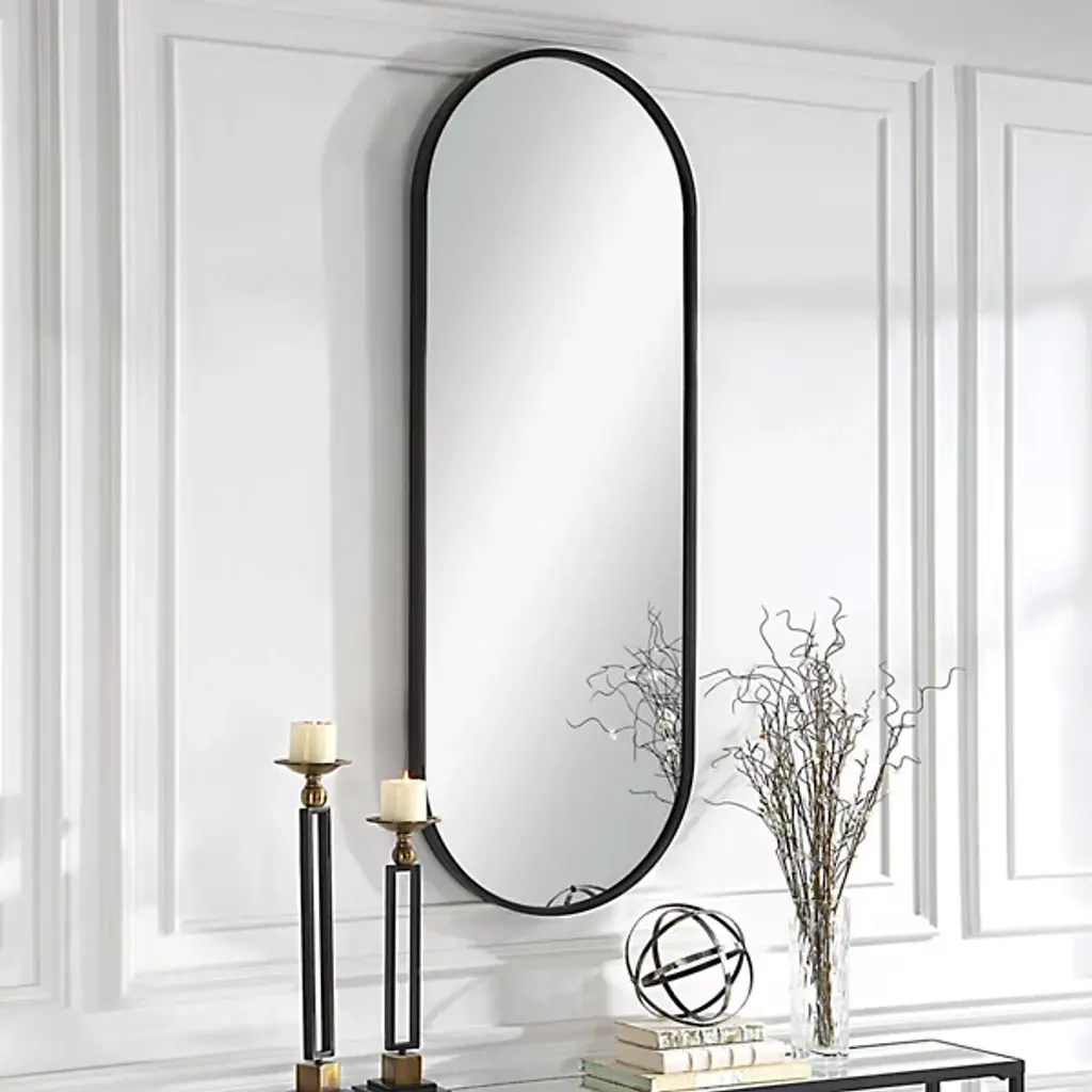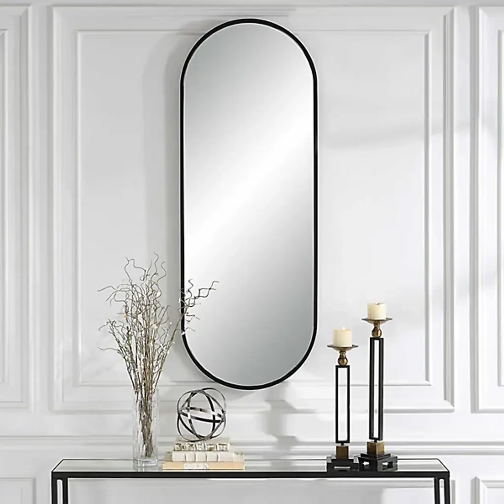The Varina Mirror from Uttermost uses linear details to create visual rhythm within its oval shape. The iron frame maintains clean lines while introducing subtle geometric elements that catch light throughout the day. This mirror adapts beautifully to both horizontal and vertical orientations, making it versatile for various wall arrangements. Its architectural qualities shine in minimalist settings where pure form takes precedence. The mirror's proportions make it especially suitable for narrow walls or between windows.