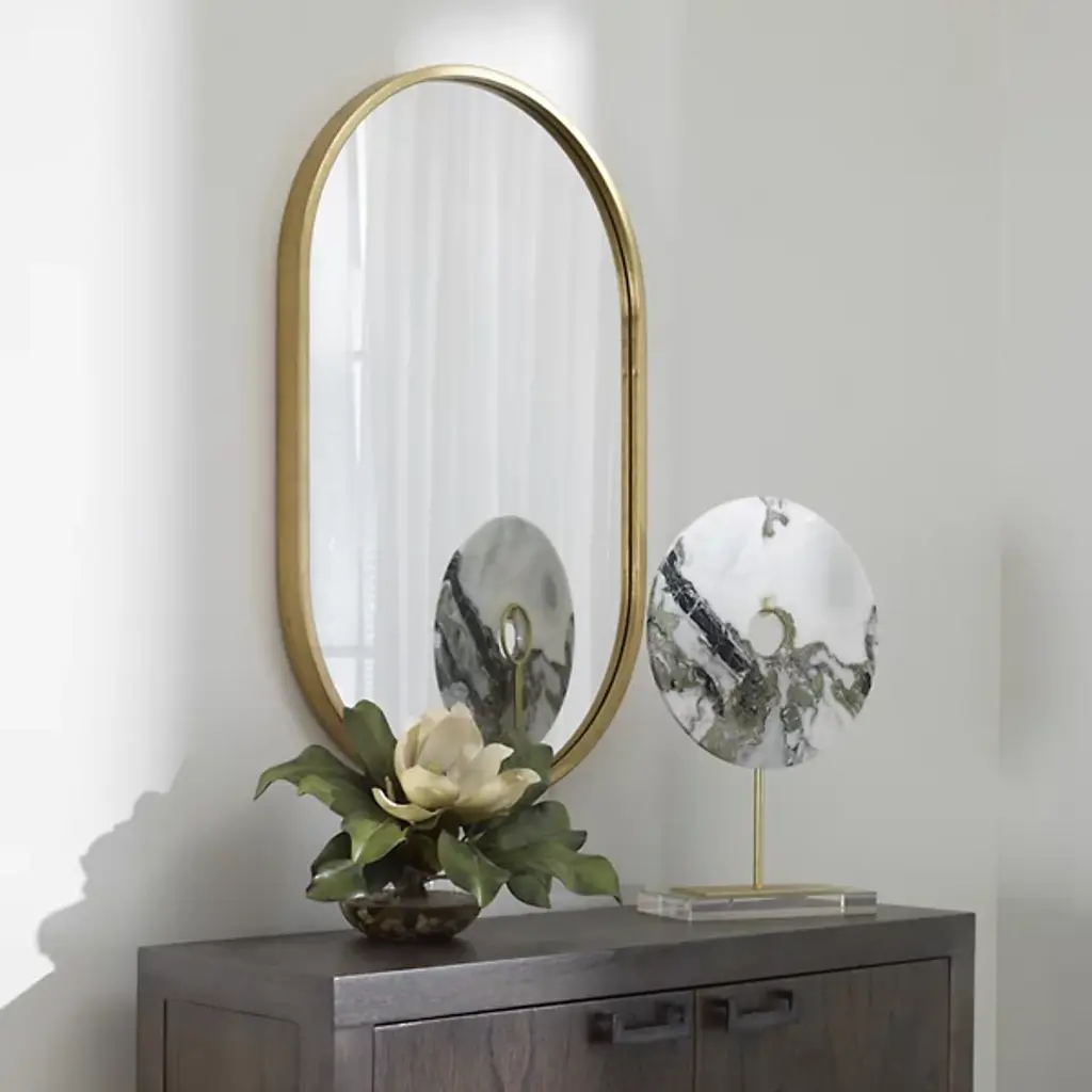 The Varina Mirror from Uttermost features an openwork iron frame. Within the metal border, fine mirror glass provides abundant reflection. Hang this wall mirror on your wall to amplify your surroundings with mesmerizing brilliance. The ovular shape of the mirror makes it versatile. Use Varina to help you complete your morning beautification routine.