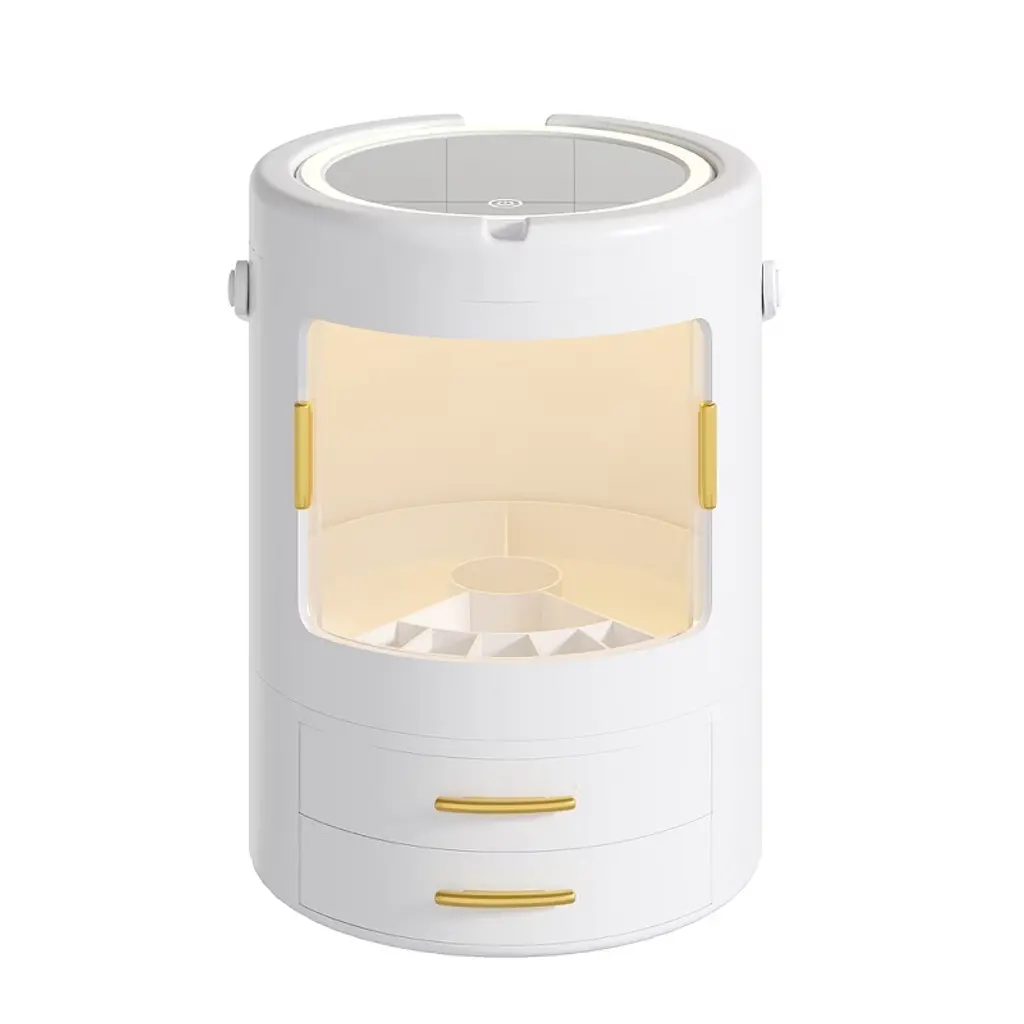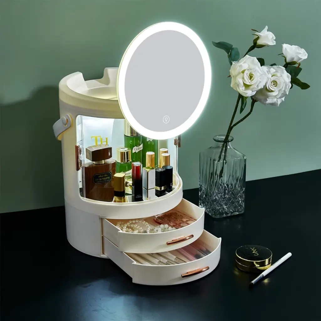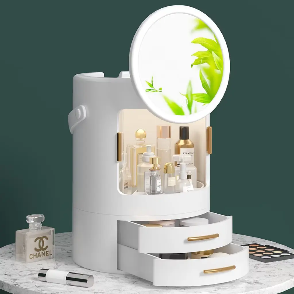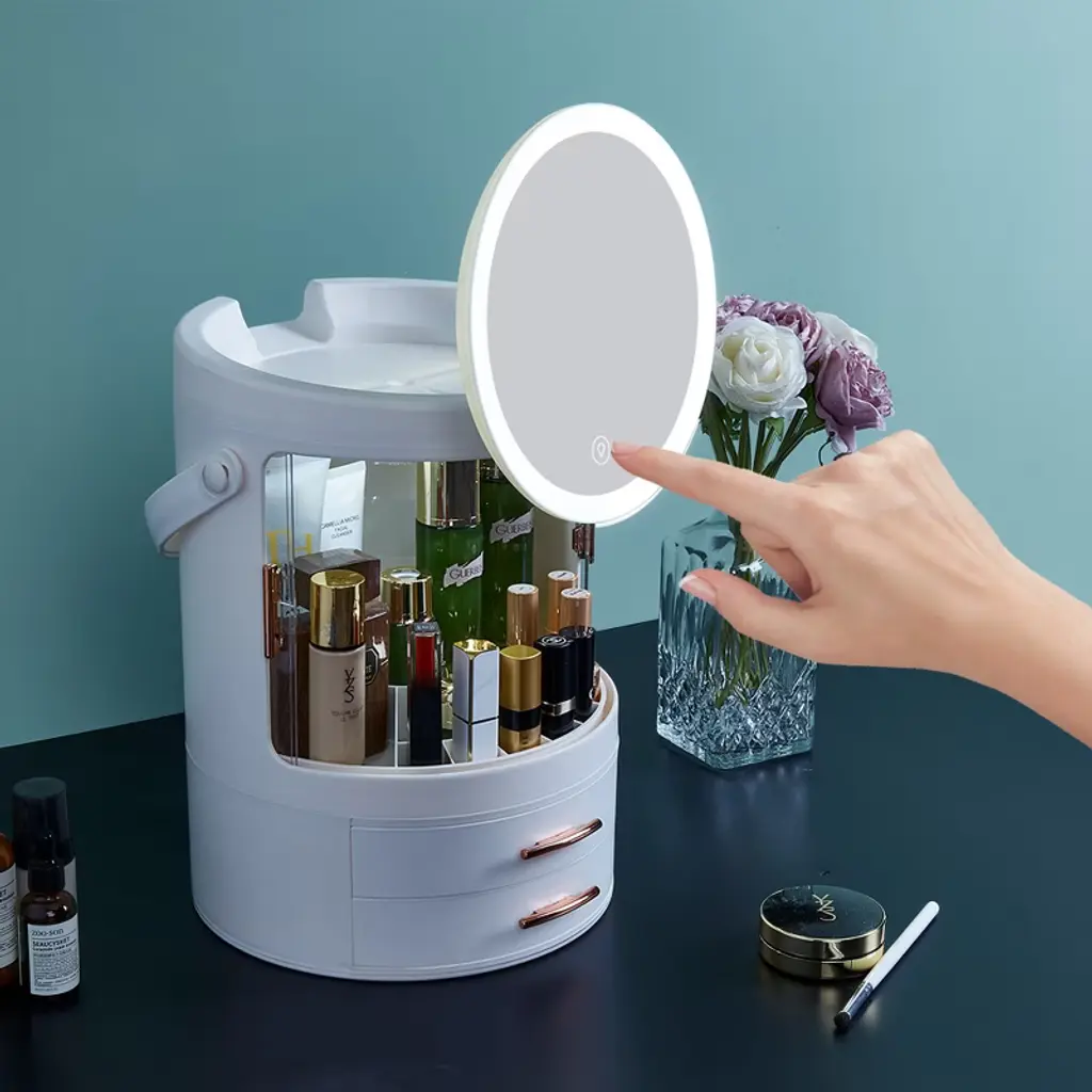 This makeup organizer features a cylindrical design with a flip-up mirror on top. The light strip can be turned on with the click of a switch, so you can apply makeup even in dark environments, and even in the event of a power outage. Our storage tier is designed with three layers. The first large storage tier also has LED lights and can store large bottles of perfume, makeup remover and other items. The second and third tiers can store small items such as earrings, bracelets, powders, lipsticks and more. Our makeup organizer is not only exquisite and compact in appearance, but also comes with a handle, which is convenient for you to use when you are on the go. Most importantly, our product is waterproof, so you don't have to worry about using it in any weather conditions.