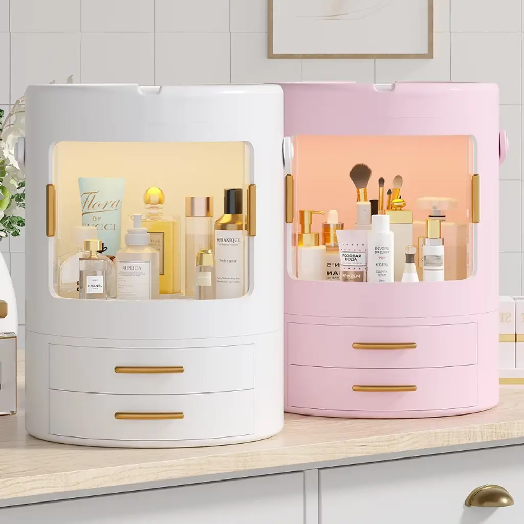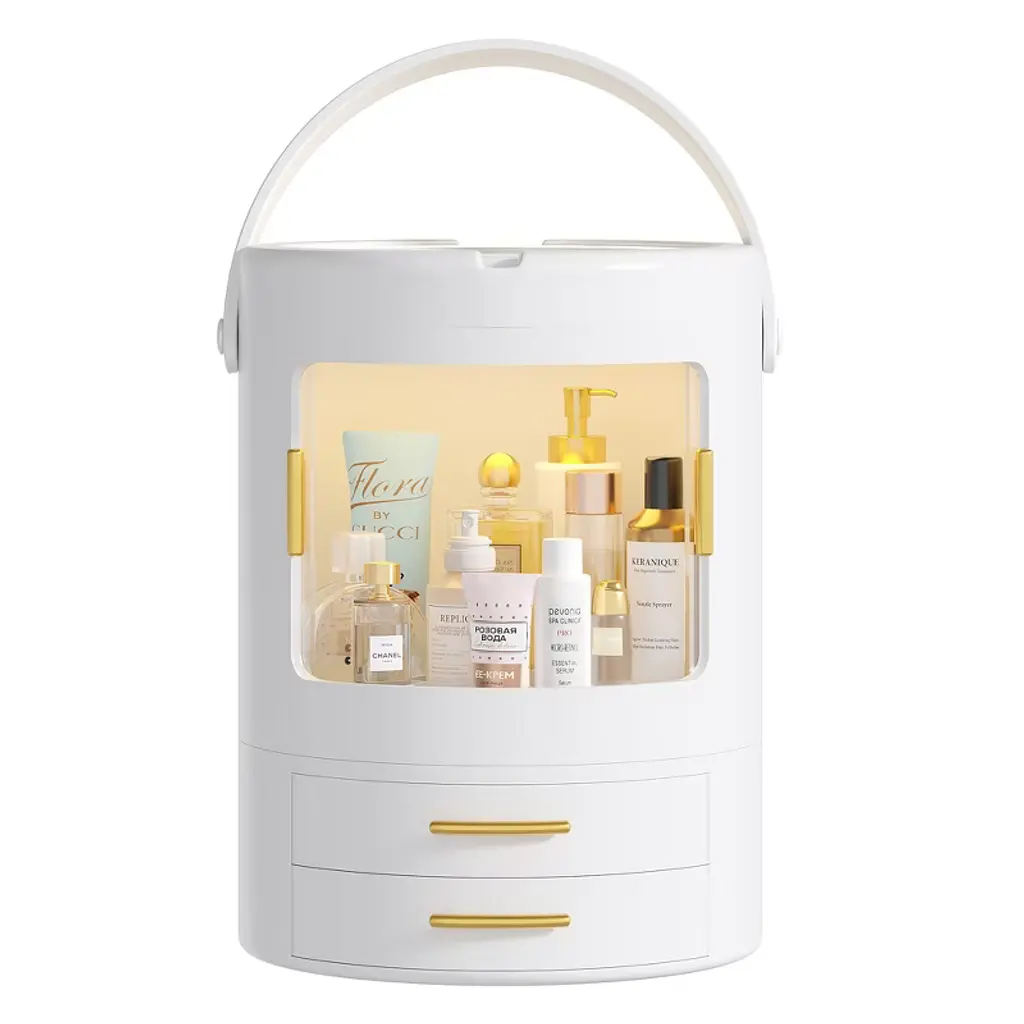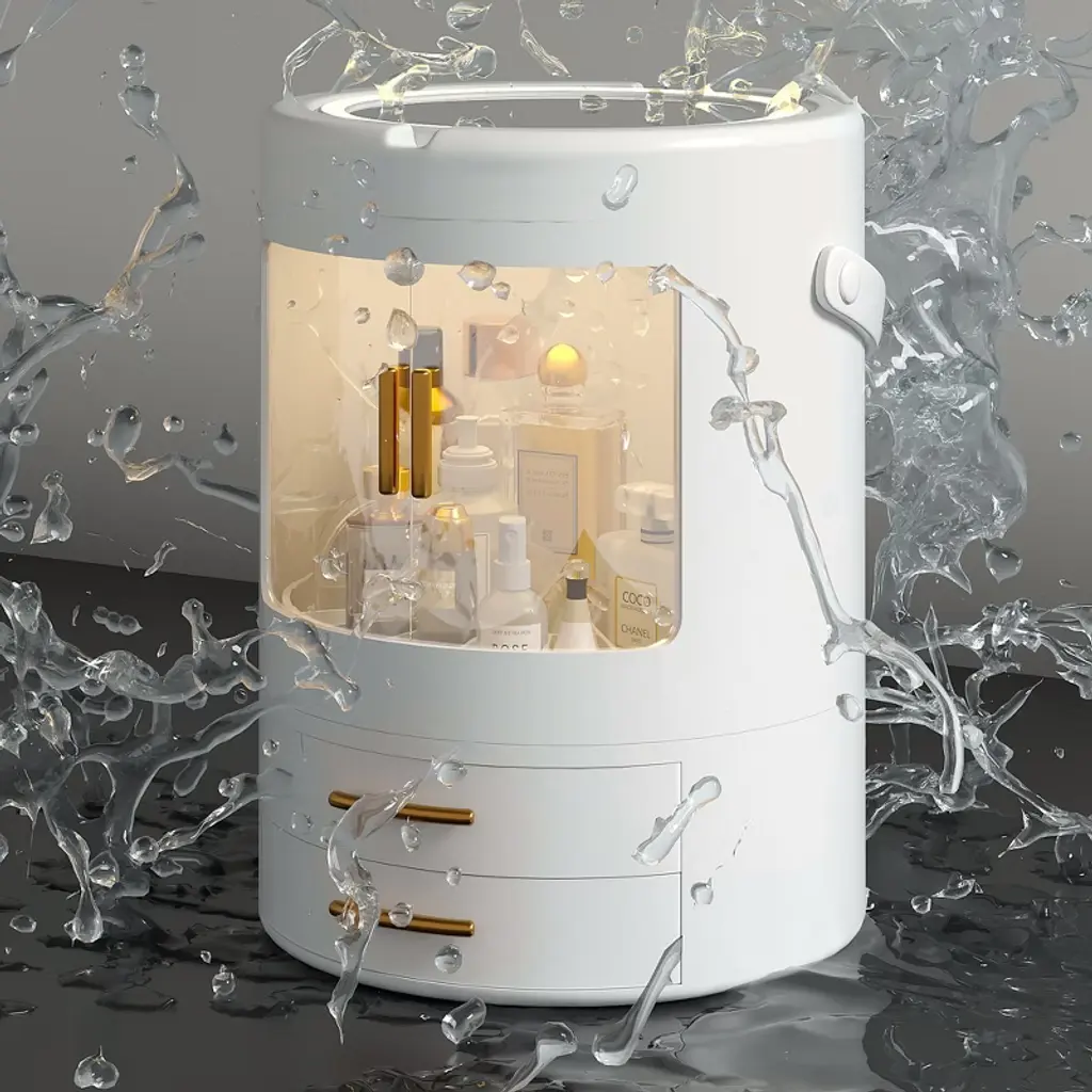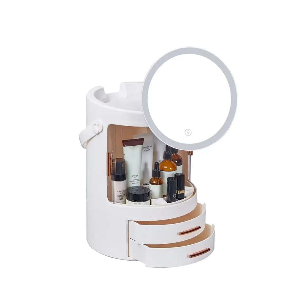 This makeup organizer features a cylindrical design with a flip-up mirror on top. The light strip can be turned on with the click of a switch, so you can apply makeup even in dark environments, and even in the event of a power outage. Our storage tier is designed with three layers. The first large storage tier also has LED lights and can store large bottles of perfume, makeup remover and other items. The second and third tiers can store small items such as earrings, bracelets, powders, lipsticks and more. Our makeup organizer is not only exquisite and compact in appearance, but also comes with a handle, which is convenient for you to use when you are on the go. Most importantly, our product is waterproof, so you don't have to worry about using it in any weather conditions.