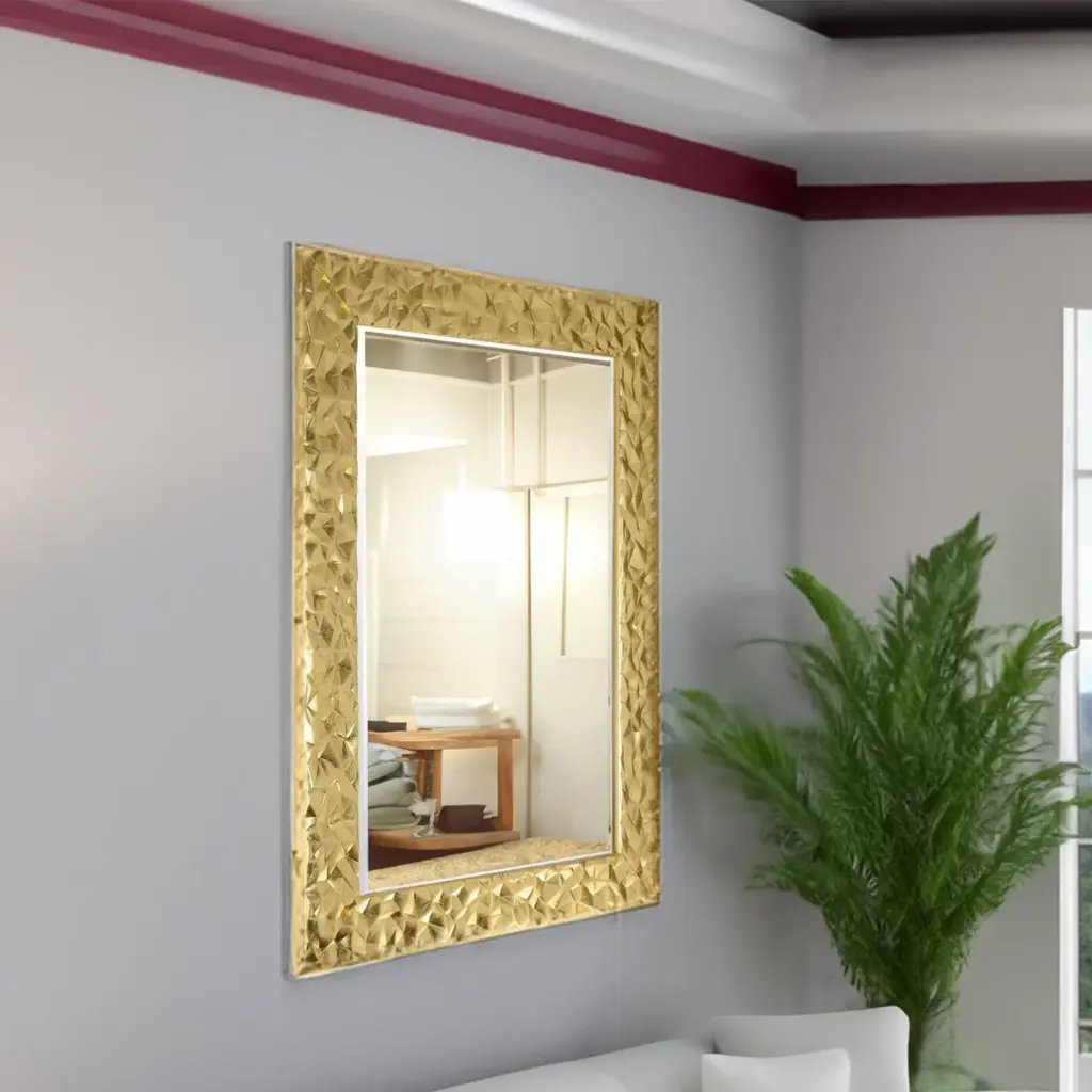A tridimensional, geometric-style pattern accented in shimmering gold leaf is the characteristic lending this wall mirror its unmistakable stylish look. Distilling fresh opulence, it is comprised of a 4mm-thick crystal mirror enclosed in the luminous frame deftly hand-carved from fir. The piece can be hung on walls both horizontally or vertically depending on decor needs and taste.