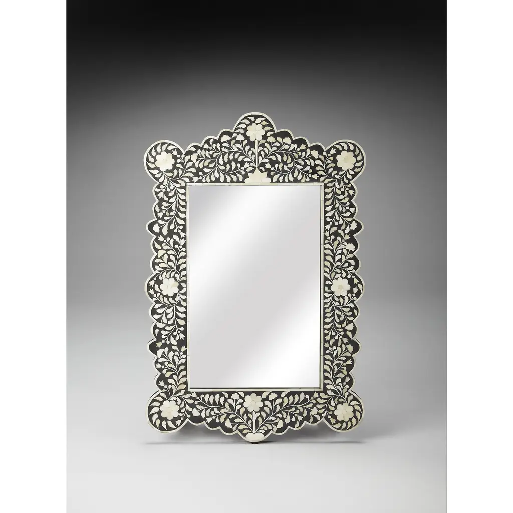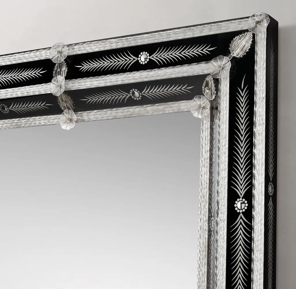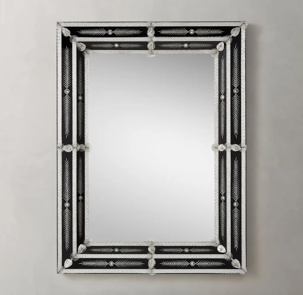 Inspired by a 17th-century Venetian antique, our mirror blends Baroque flourishes with Neoclassical decorative elements. The bold silhouette features a double stepped-glass frame reverse etched with chains of stylized feathers. Hand-placed rosettes known as miroirs à pareclose lend authentic detail to the dimensional glass border.