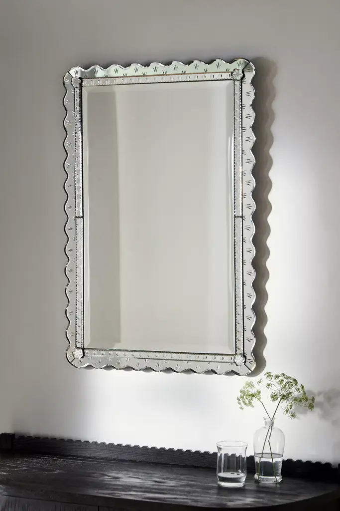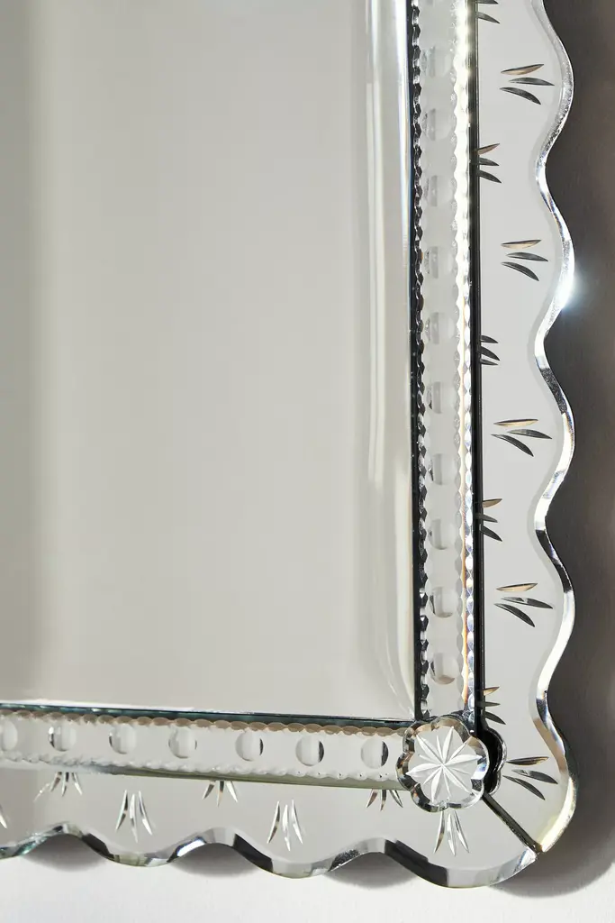 This ornate handmade mirror looks marvelous as an accent in a living space, bedroom, or entryway.