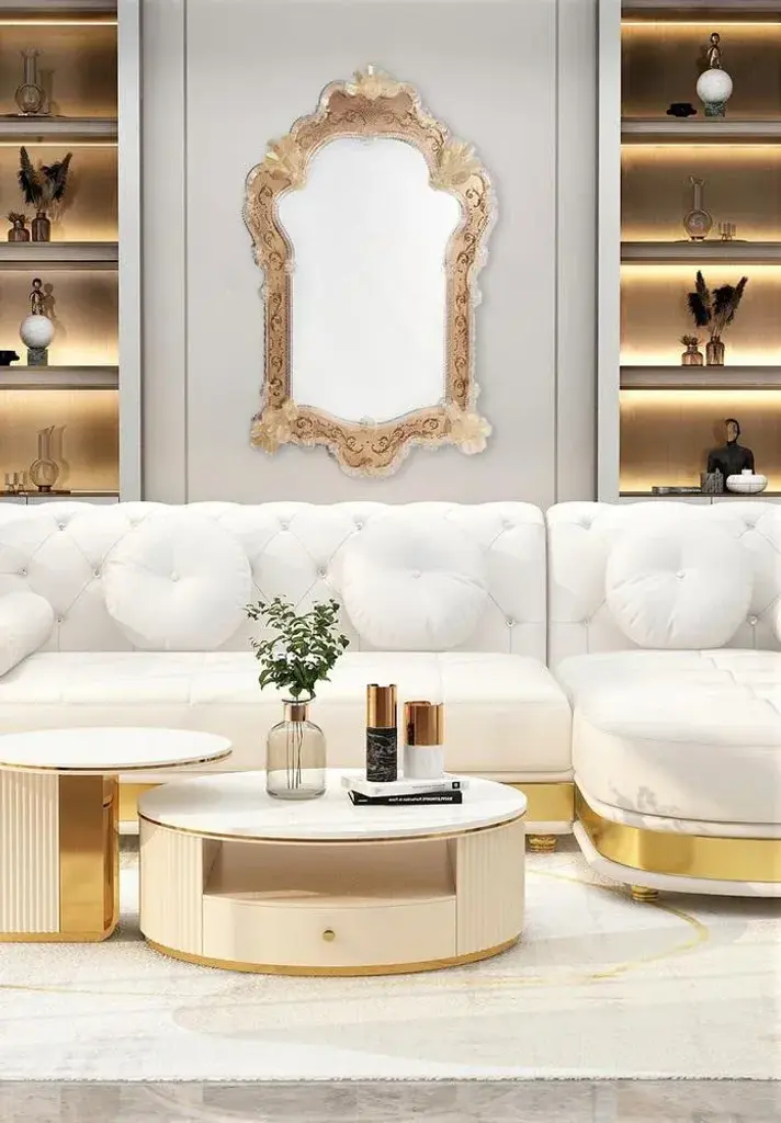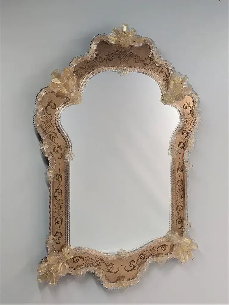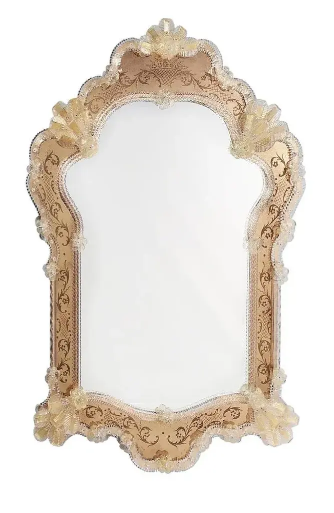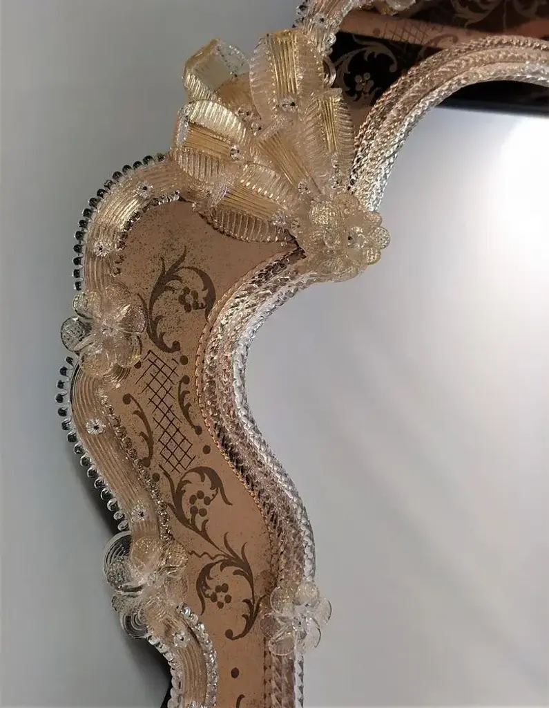 Luxurious Venetian mirror "Ca' Vendramin", made by the Tosi Brothers on the island of Murano, in Murano glass, worked entirely by hand following the techniques of our ancestors. Mirror with sinuous curves composed of an antique amber mirror frame engraved with the subject of curls and flowers, double internal and external frame in Murano crystal on a gold background, embellished with details of flowers and leaves in crystal with gold leaf, mirror customizable in size and in colors. Labeled by Maker