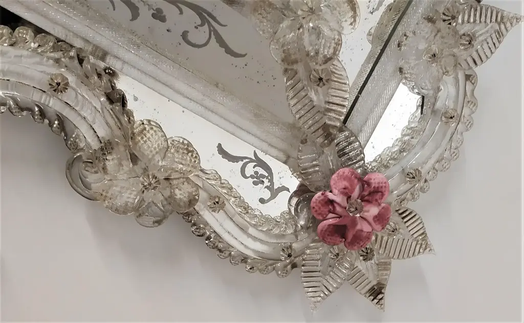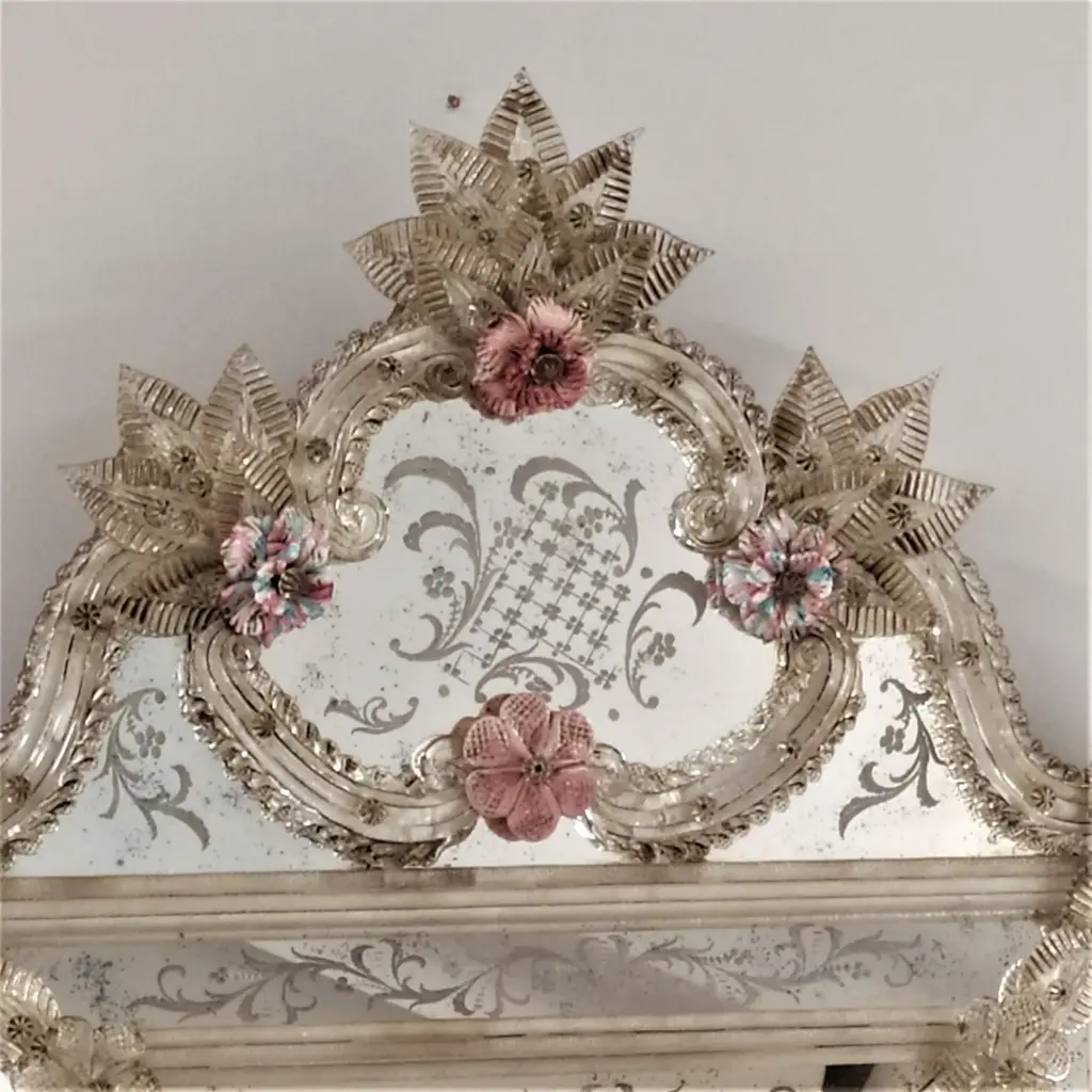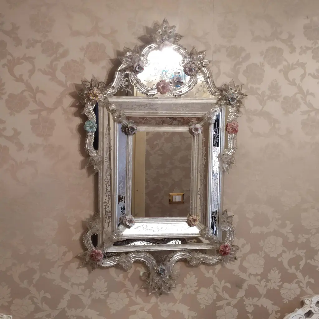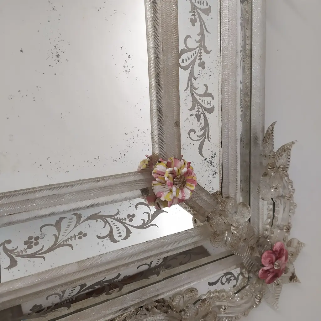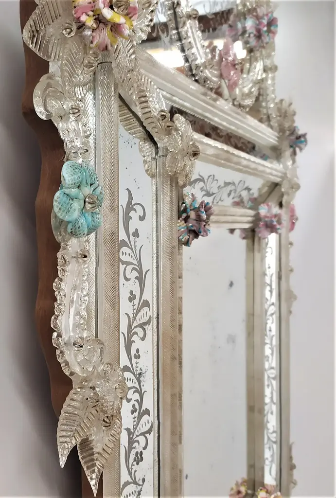 "Laguna" Reproduction of an antique Venetian mirror from the 20th century, antiqued, engraved and handcrafted, with frame and leaves in antique crystal colour, flowers in multicolored glass paste in Murano glass, made according to the ancient traditions of the Murano glass masters. The entire mirror is antiqued almost as if it were original, made by the expert hands of the Tosi Brothers on the island of Murano, a company that still produces following the ancient techniques of mirrors from the past, an excellence on the island of Murano, a true work of art. Labeled by Maker