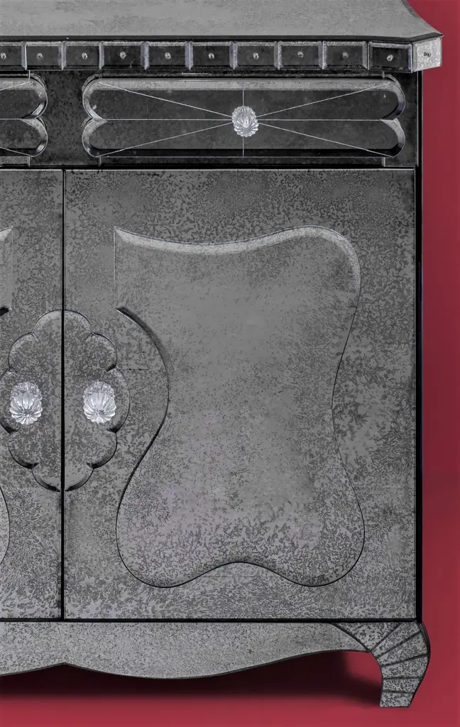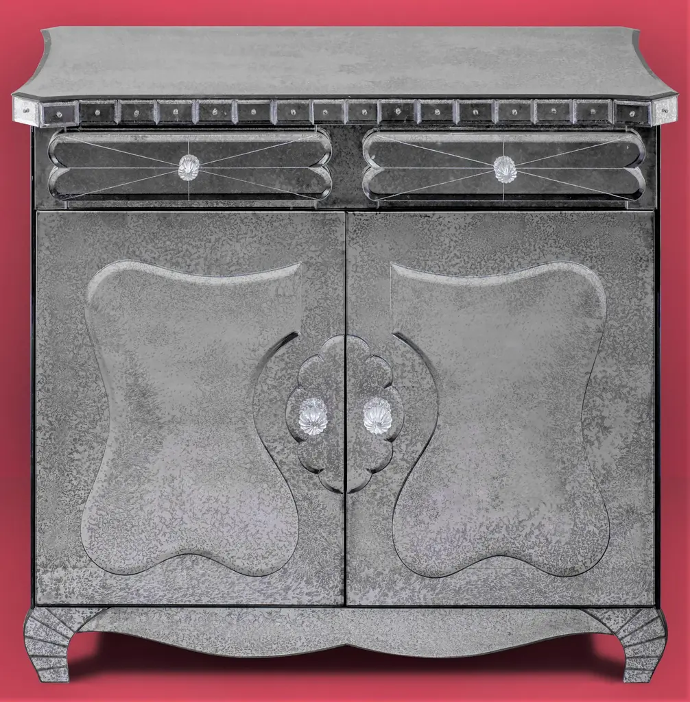 Luxurious cabinet, reproduction of classic furniture in Style Art Deco ' of the 21st century, produced by Fratelli Tosi, designed by Fratelli Barbini Glass Mirror composed of two front doors, covered in antique Murano mirror, all beveled, wheel engraved and hand polished with pure silver with an antique effect, following the ancient techniques handed down from father to son up to the present day. Labeled by Maker