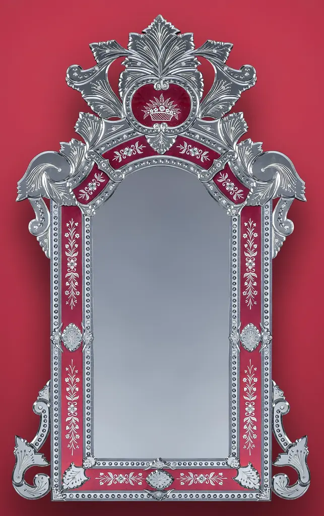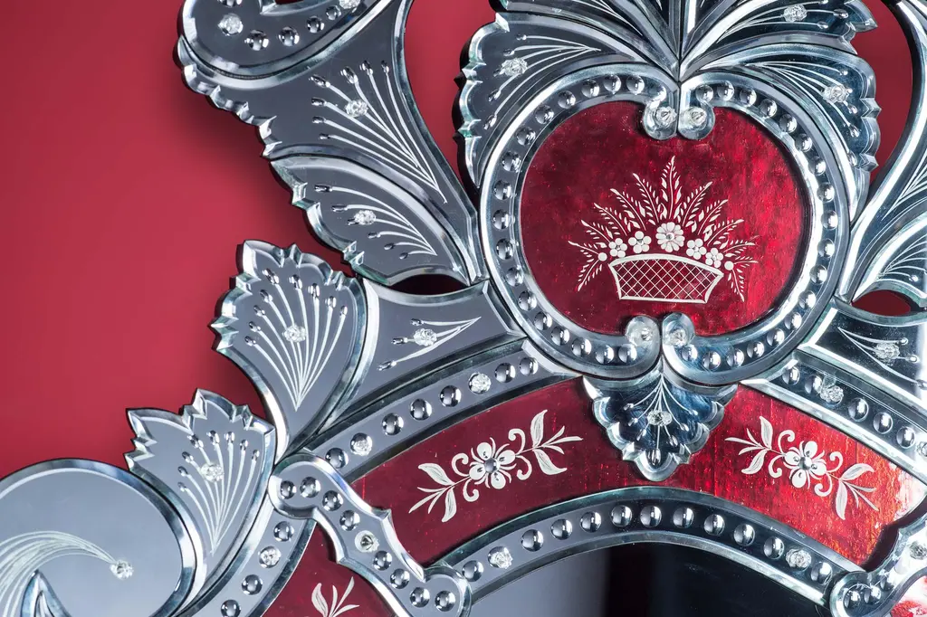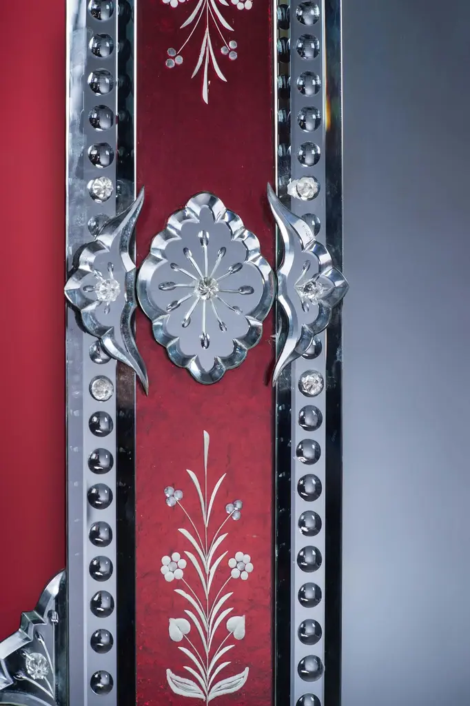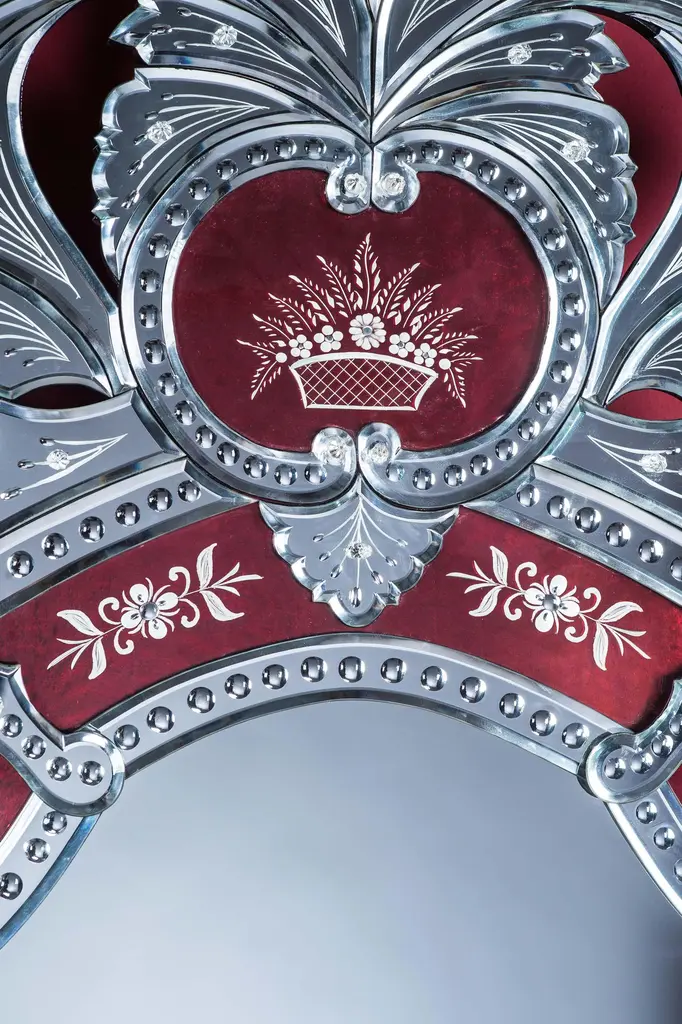 Luxurious Murano glass mirror 1800s French style made by Fratelli Tosi designed by Fratelli Barbini. Mirror produced on the island of Murano all beveled, engraved, carved and polished entirely by hand, pure silver plating is still performed today following the ancient formulas of Venetian mirrors. The band that embraces the central red mirror is engraved with a floral motif, the entire outer frame is a succession of curls totally engraved and polished by hand, all this to give brilliance and brightness to this extraordinary mirror made in Murano - Italy. Labeled by Maker