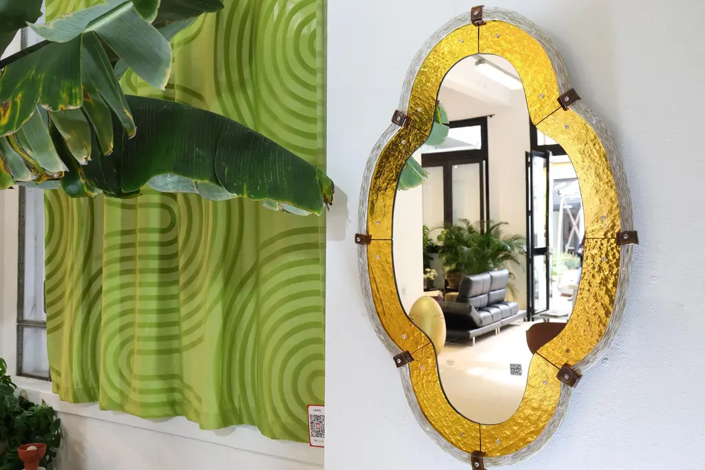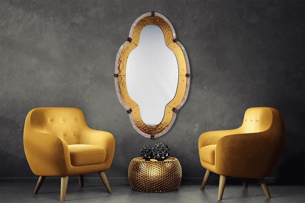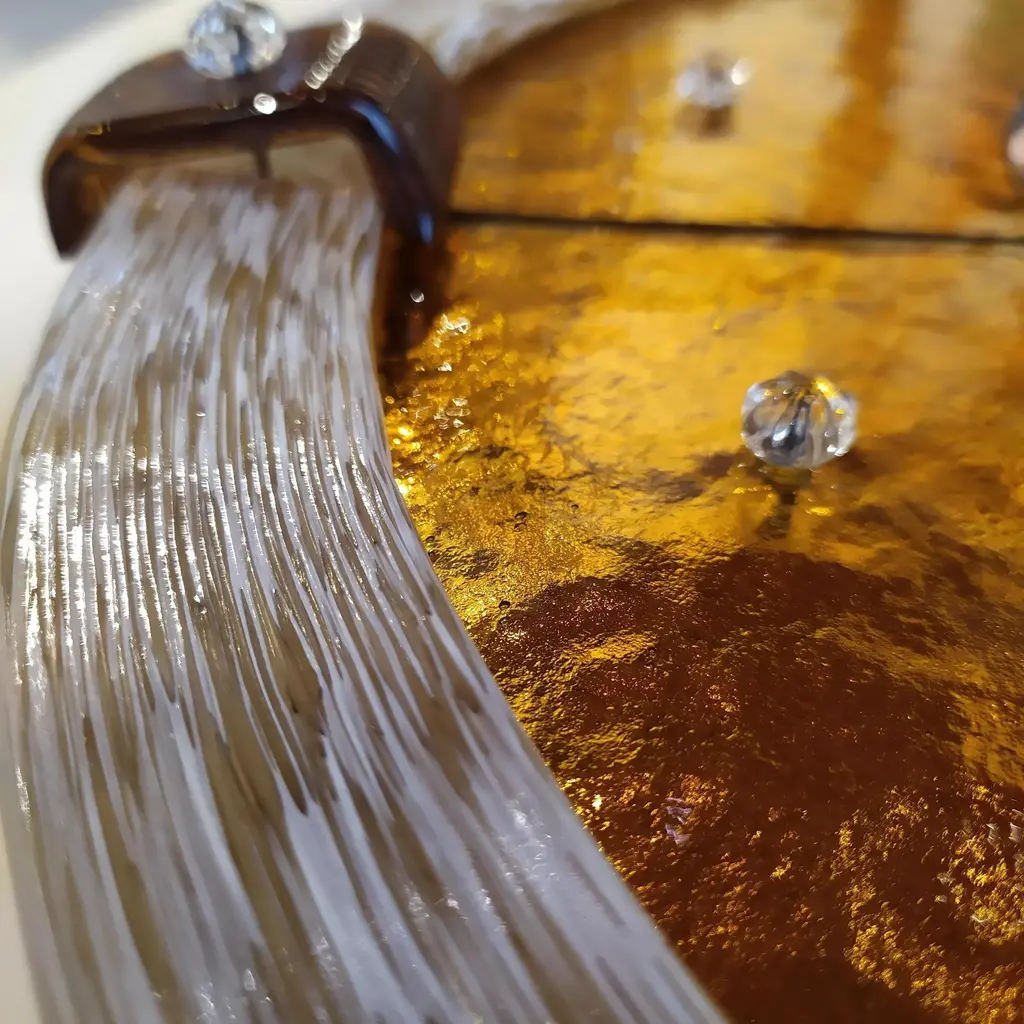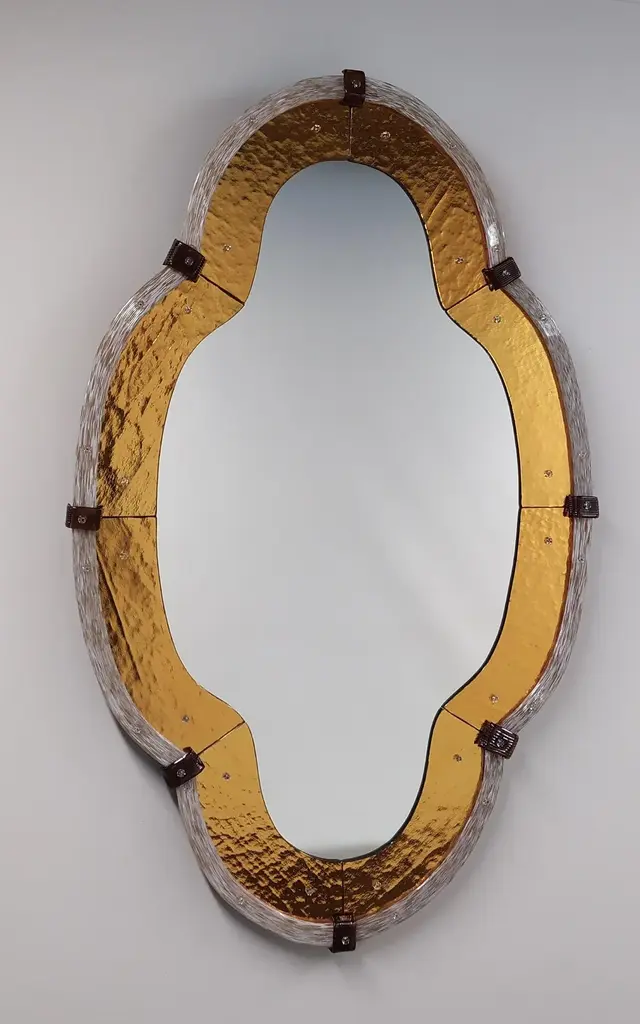 "New York" Luxury Mirror in Contemporary Style, the Murano Glass frame is Amber in color and is part of the new limited number "Curve" series, a true work of art created by the Tosi Brothers on the island of Murano, historic company on the island, which has been producing mirrors made entirely by hand since 1900, customizable in colours, dimensions and orientation Labeled by Maker