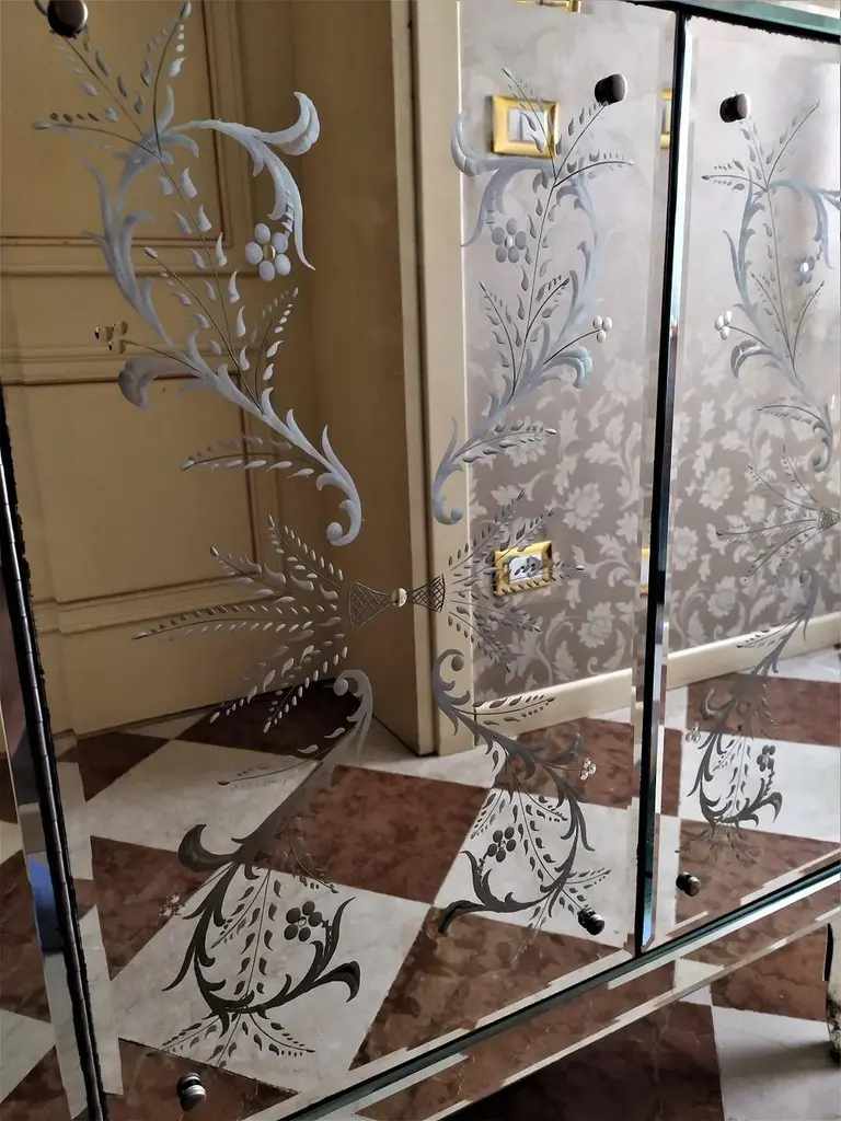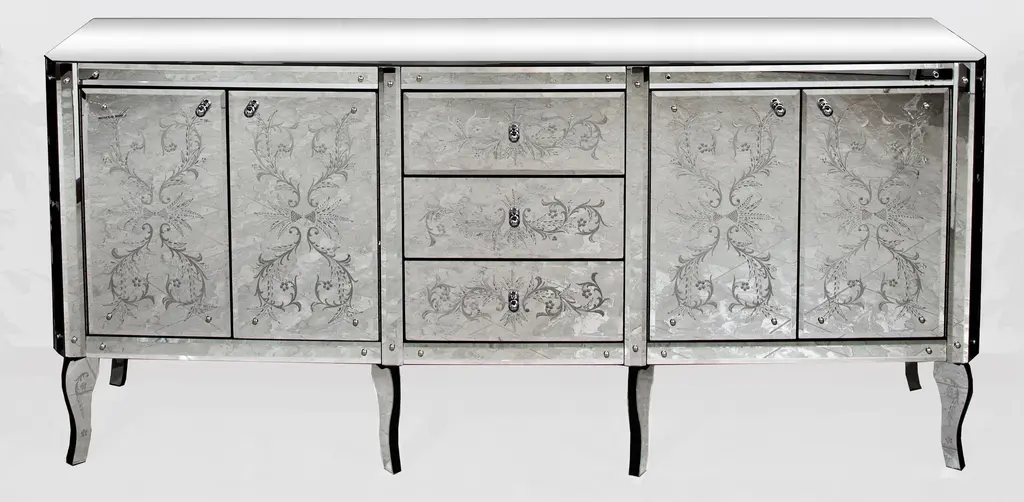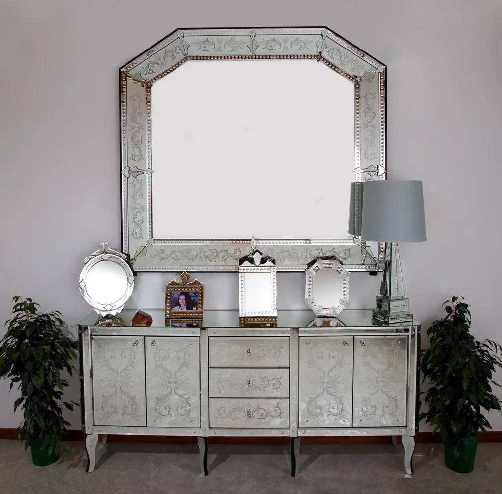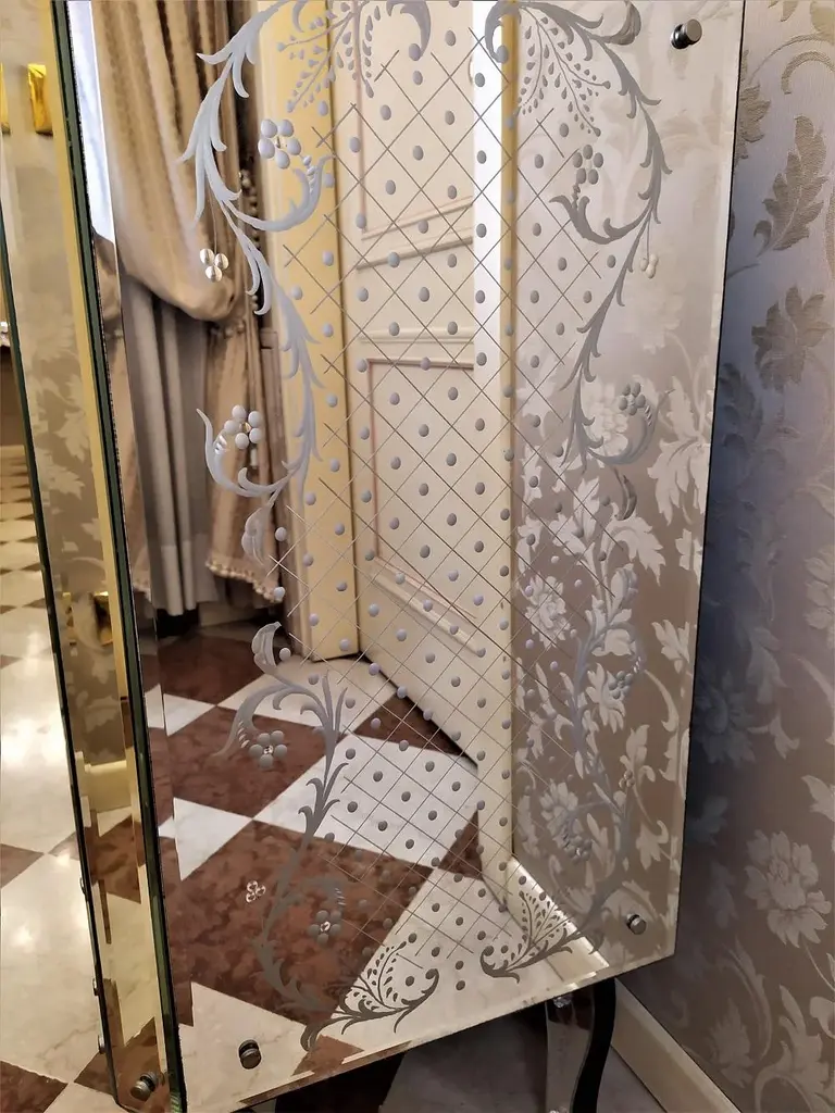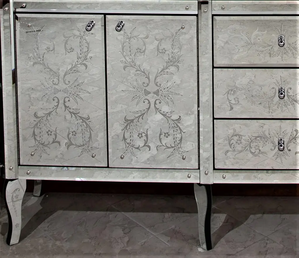 Luxurious classic sideboard called "Ca Corner", in murano Glass mirror, composed of three central drawers and four side doors, all beveled, wheel engraved and hand polished with pure silver silvering following the ancient processing techniques handed down from father to son up to our days, in which the Fratelli Tosi makes its pride. Labeled by Maker