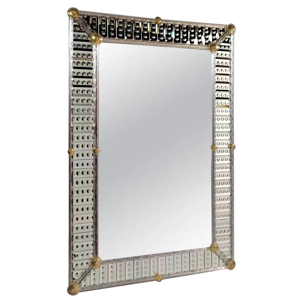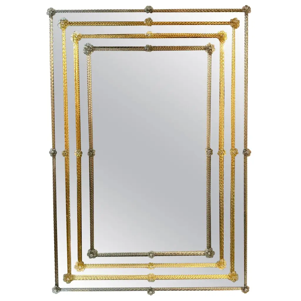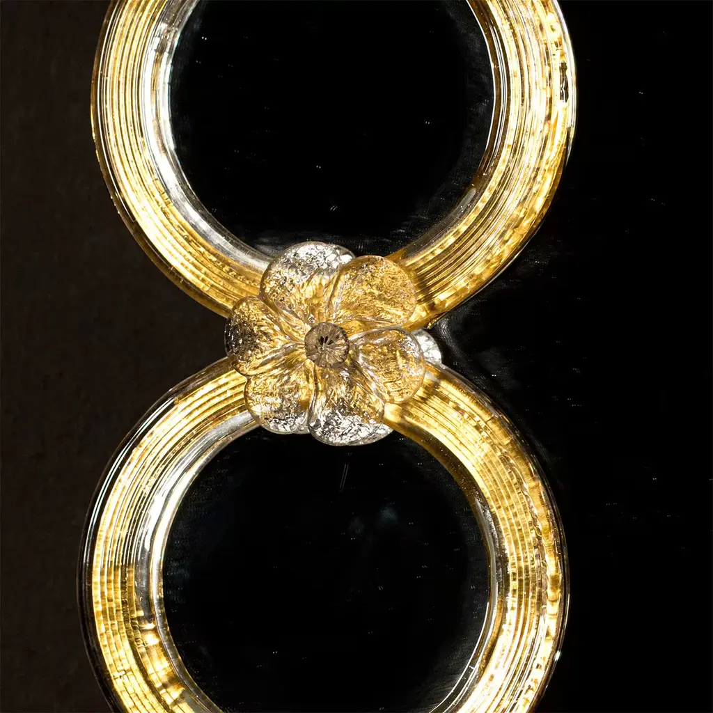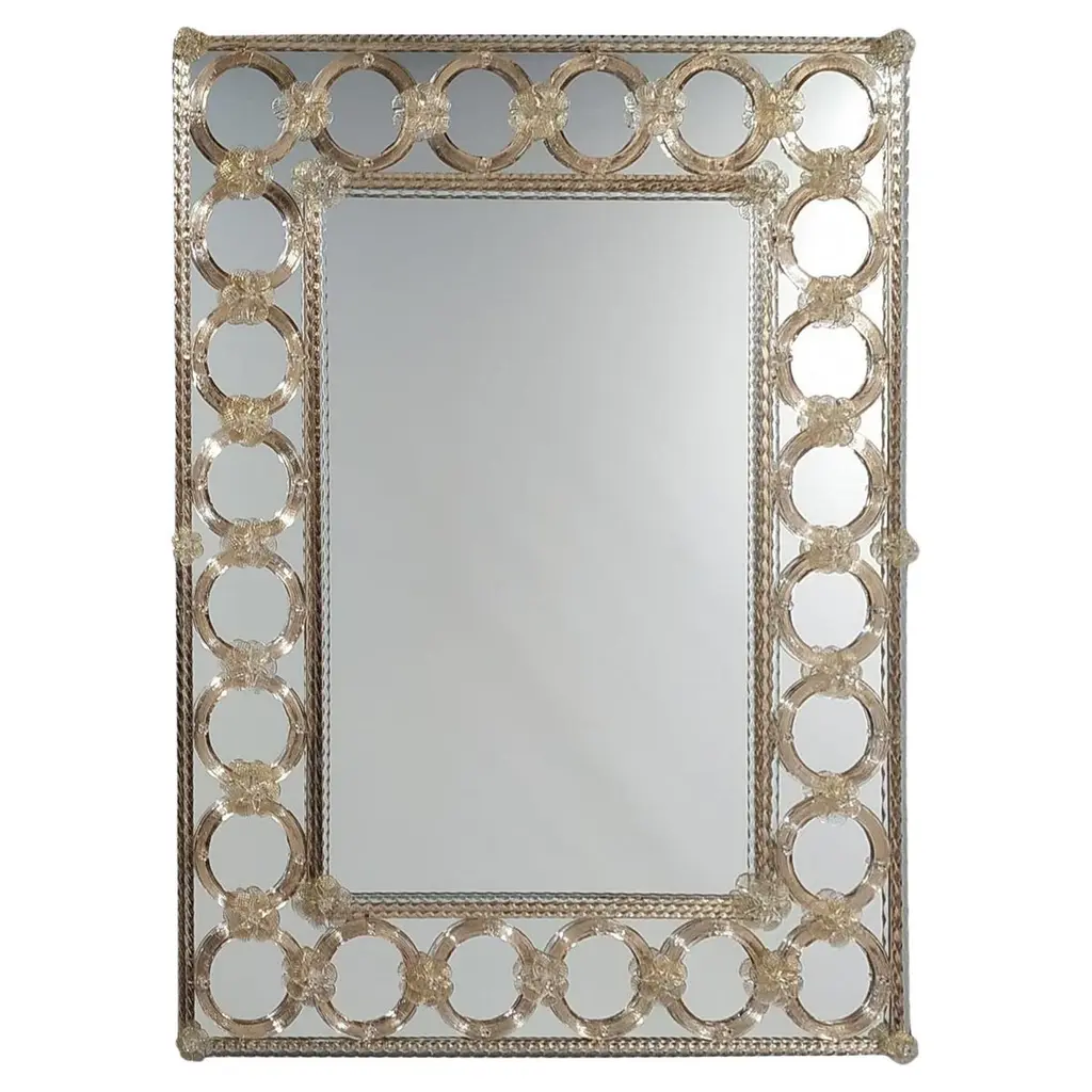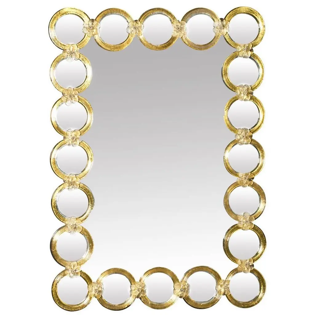 Golden Murano glass rings embellish this rectangular mirror by Ongaro e Fuga. The décor is welded to the wood base panel by glass flowers joining each of the rings, thus giving a sense of traditional in a rather modern design. This piece adds the right amount of glamor to any space.