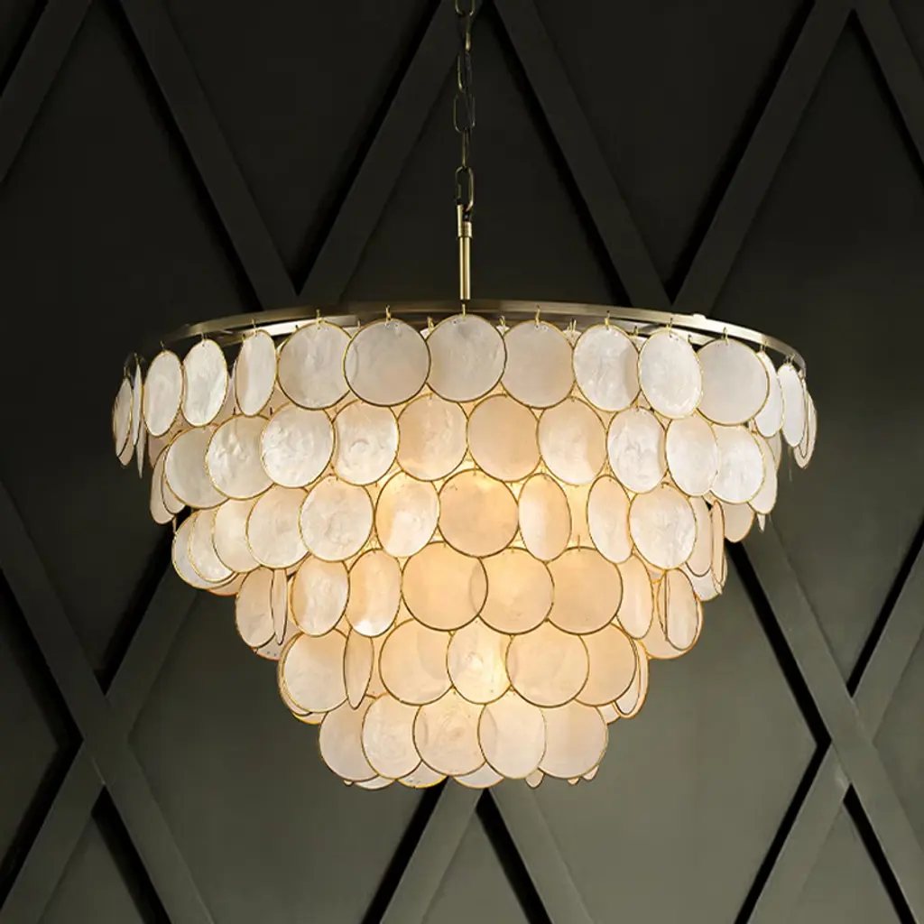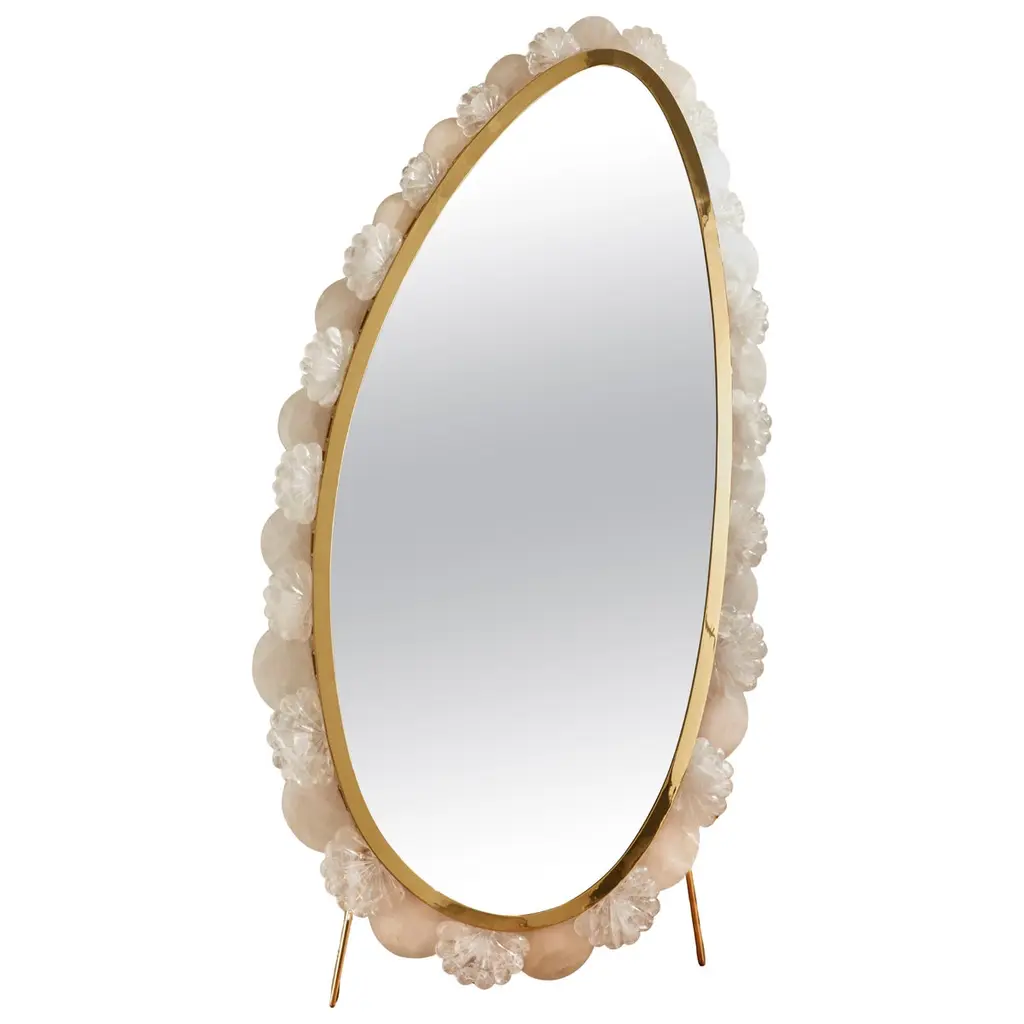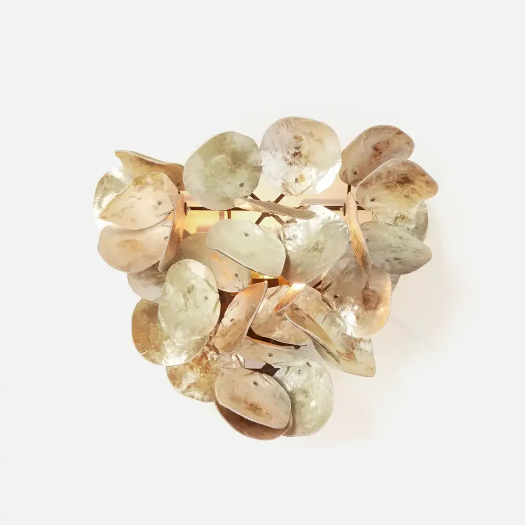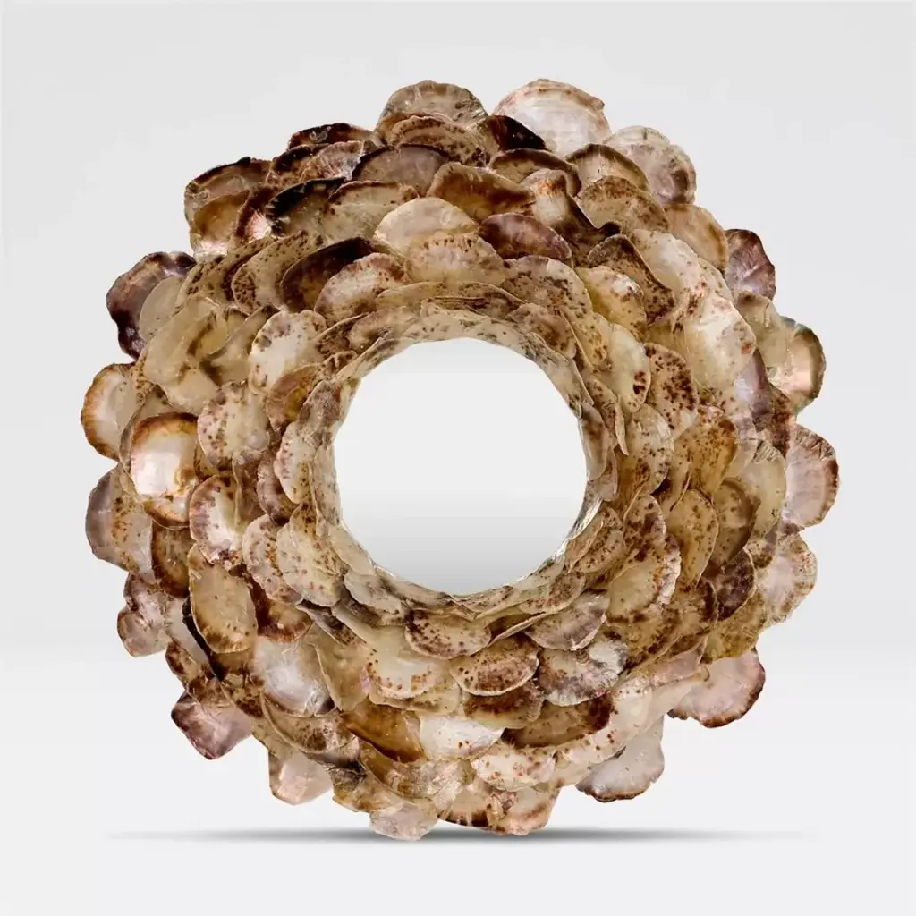 Shells are arranged as petals of a 45-inch round flower. The Venus starts with small shells at the mirror's edge that get larger, up to 12 inches, as they radiate out from the mirror's center. The Venus is feminine, organic, modern, and dramatic. The layers of organic shells give the mirror an approximate 6" depth.