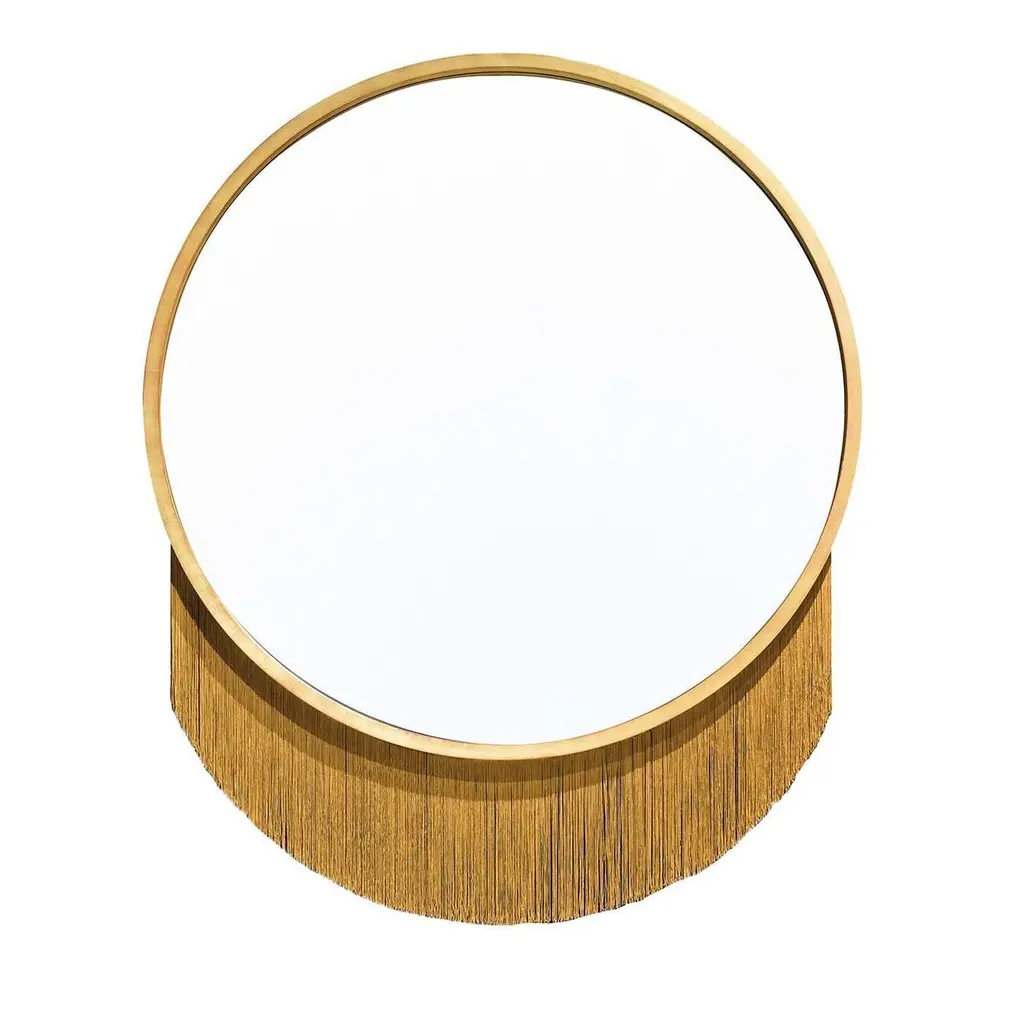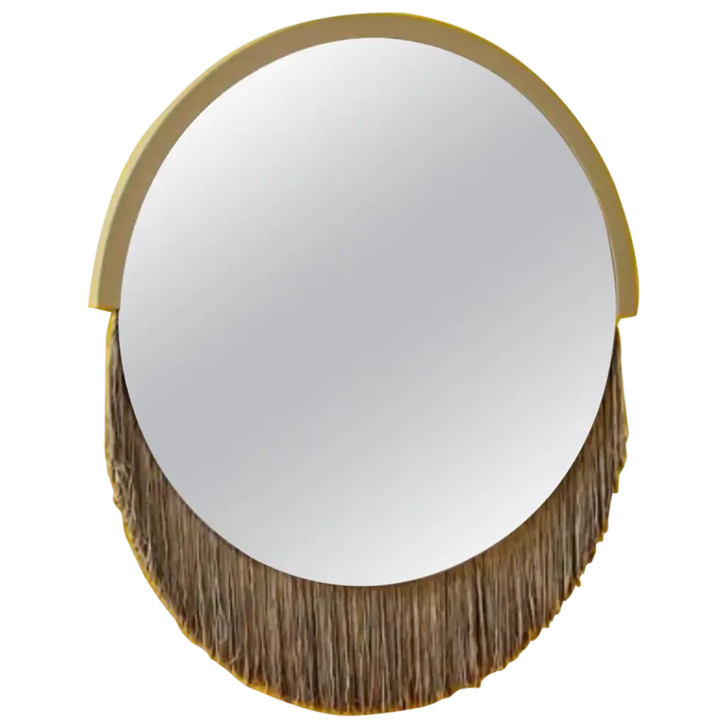 Brimming with minimalist appeal, this captivating wall mirror is a sophisticated way for brightening up any midcentury or minimalist interior with style. The mirror's prominent circular silhouette is fashioned of wood with a gold-leaf finish, which complements the golden-yellow decorative fringe and the bronze hue of the mirrored glass. A glamorous addition to an entryway console or a vintage-inspired bedroom dresser, the materials and dimensions of this unique piece are customizable upon request.