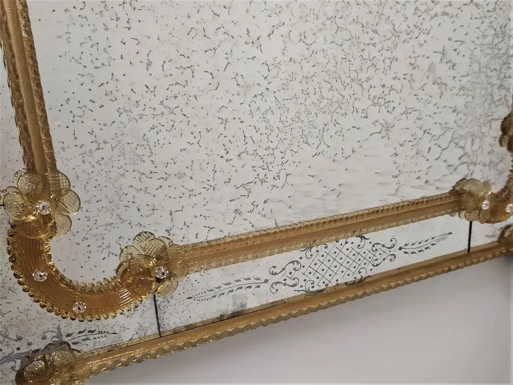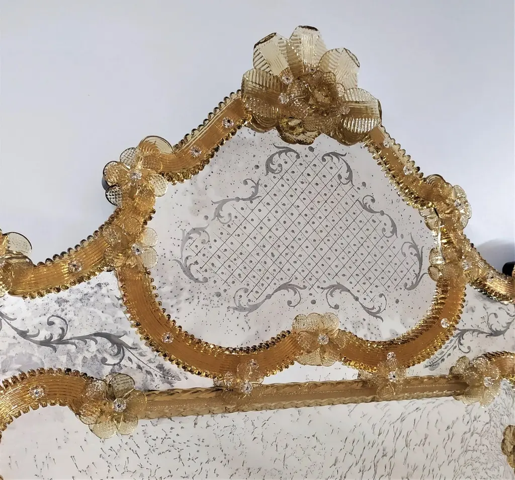Mirror in Venetian style made by the Fratelli Tosi on a design by the Fratelli Barbini Glass Mirror, in Murano glass, entirely handmade according to the techniques of the glass masters of the fourteenth century, decorated withFloral and curly engravings, silvered with an antiqued effect, with pure silver, the frame composed of smoky colored reeds and curls recalling the sandbanks of our Venice lagoon, embellished with flowers and leaves in smoked Murano glass.