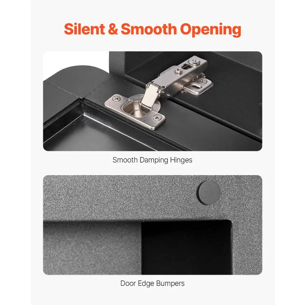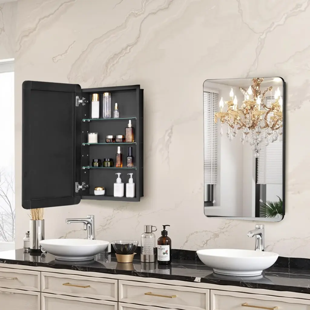 Feature: Fit for Various Size: Overall size: 16.5''L x 5''D x 27.5''H; Recessed installation size: 15.2''L x 3.4''D x 23.9''H. Featuring a high-definition mirror, this beveled medicine cabinet creates a bright and expansive atmosphere in your bathroom. Ample Storage Space: The mirror medicine cabinet comes with 5mm triple-layer adjustable tempered glass, increasing storage capacity while allowing for free, organized divisions. Whether storing small medicine bottles, large shampoo bottles, or various cosmetics, you'll find the ideal spot for everything, eliminating wasted space. Aesthetic & Durable Materials: Crafted with a premium black stainless steel frame and aluminum door frame, this bathroom mirror medicine cabinet provides superior rust resistance, making it ideal for damp spaces. Its long-lasting durability ensures it won’t warp with use, while the contemporary design and beveled edges add a stylish, secure touch that prevents any harm. Wall-Mounted or Recessed: The bathroom vanity mirror cabinet provides two installation methods—wall-mounted or recessed—and supports upside-down installation, allowing you to change the door opening direction. Choose the most suitable option based on your bathroom layout and personal preference to achieve the optimal use of space. Additional Premium Features: Equipped with high-quality, low-noise damping hinges, this medicine cabinet with mirror is designed for smooth and quiet opening and closing. The surface is scratch-resistant and rust-proof, while the included cushioning pads further reduce noise, enhancing your overall user experience. Package Content: 1 x Mirror Medicine Cabinet 2 × Hanging Brackets 8 × Self-tapping Screws 8 × Expansion Tubes 12 × Glue Caps 1 × User Manual