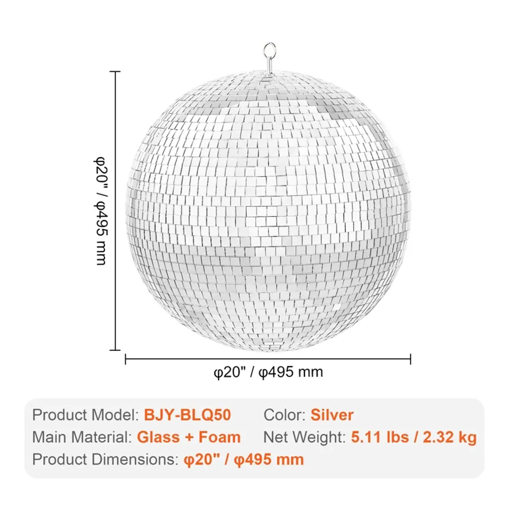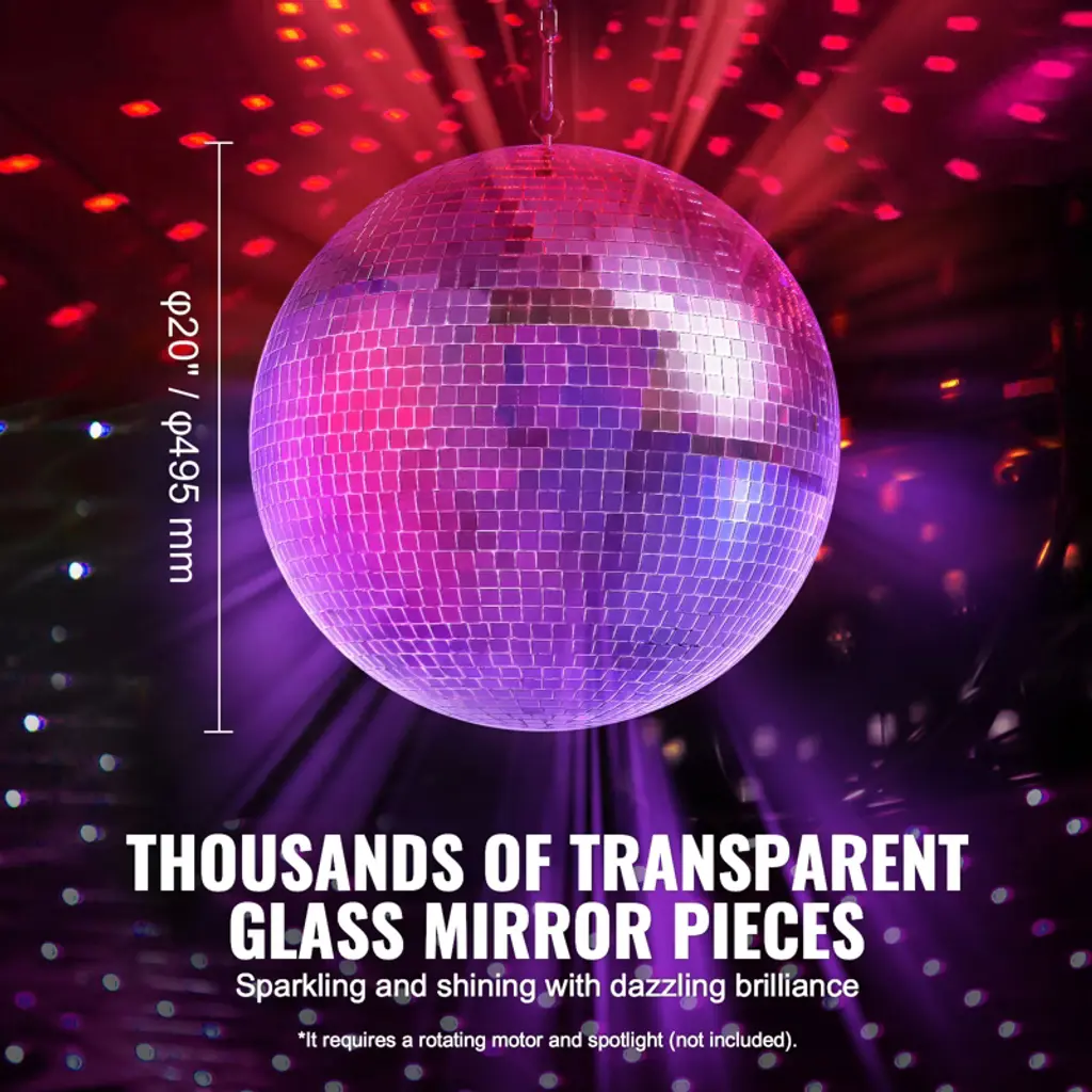 Feature: Professional Quality Materials: This 20 in/495 mm mirror disco ball adopts heavy duty material with thousands of clear glass mirrors that create a dazzling flashing effects. Pair it with a rotating motor (sold separately) and spotlight (sold separately) to bring extra fun and sparkle to your home, perfect for parties and special events! Sturdy & Durable Disco Ball: The mirrors on our light mirror ball are securely attached using strong adhesive, ensuring they stay in place without loosening or cracking over time. Plus, the sturdy metal hanging ring makes it easy to hang and keeps it safe and stable. Easy Installation: Our 20 in/495 mm party mirror ball comes with a pre-installed O ring on the top of the ball, which provides a secure and safe hanging to prevent balls from falling and causing damages. It can be easily hang on any ceiling walls with a hook, or electronic rotating motor (Sold/Purchase Separately)—no hassle, just fun! Versatile Application: Whether it's a birthday, holiday party, bar, wedding, or store window display, our disco ball ornament adds the perfect touch to any setting. This mirror disco ball is reflective, when at daylight the sun hits it, the whole room lights up in little reflections off the back. Let your creativity run wild with all the ways you can use it! Safe Shipping: We take extra care when packaging your disco ball deco. It’s wrapped in bubble cushioning, with foam reinforcements in the corners to keep it safe during transit, so it arrives ready to shine! Package Content: 1 x Mirror Disco Ball