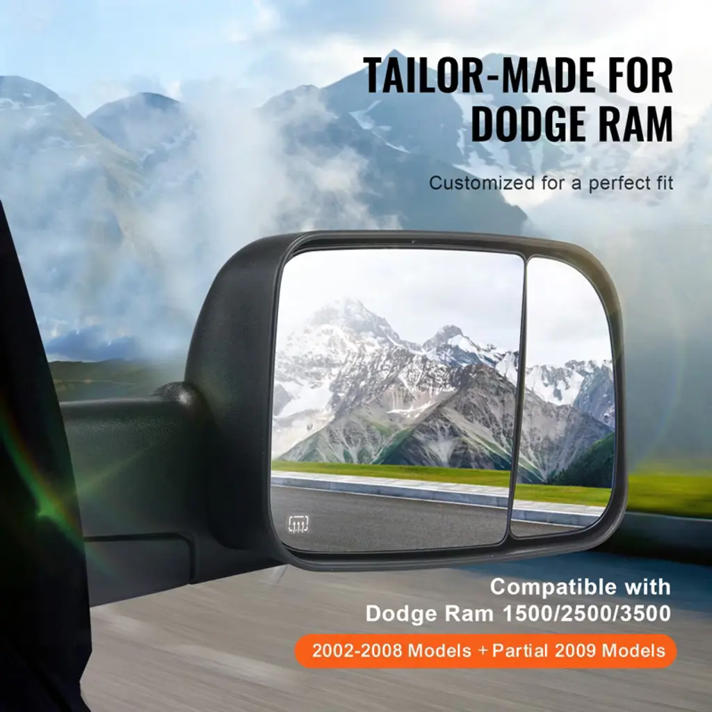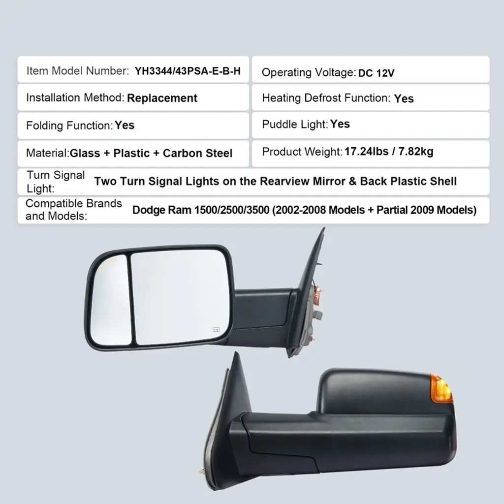 Feature: Vehicle Compatibility: Our towing mirrors are compatible with 2002-2008 For Dodge For Ram 1500; 2003-2009 For Dodge For Ram 2500; 2003-2009 For Dodge For Ram 3500. No worries about mismatched parts here – our mirror set is designed to blend seamlessly with your vehicle, ensuring a snug fit. Four-Way Adjustment: With advanced multidimensional adjustment and electric adjustment features, you can tweak the tow mirrors to just the right angle for your driving style. Whether it's vertical or horizontal adjustment, precise control is achievable. No more blind spots ruining your day – get ready for a safer, smoother ride. Diverse Lighting Configuration: Light up the road with our trailer mirrors' full set of lights, including turn signals and puddle lights. They boost visibility in dim conditions and add a touch of sleekness to your vehicle. Crafted from industrial-grade plastic and carbon steel, they're built to last through countless adventures. Folding and Heating Functions: These truck mirrors are designed with manual flip-folding functionality, making storage a breeze and facilitating passage through narrow spaces. The heating function ensures quick removal of frost or fog for crystal-clear vision, even on rainy and snowy days. Easy Installation: No need to call in the pros or hunt down special tools – installing our trailer towing mirror is as easy as pie! Just hook it up to your vehicle's power supply (DC 12V), and you're good to go. We've included everything you need in the package, along with a step-by-step guide that even a DIY newbie can follow. Package Content 2 x Towing Mirrors 2 x Installation Nuts (Extra Provided) 1 x User Manual