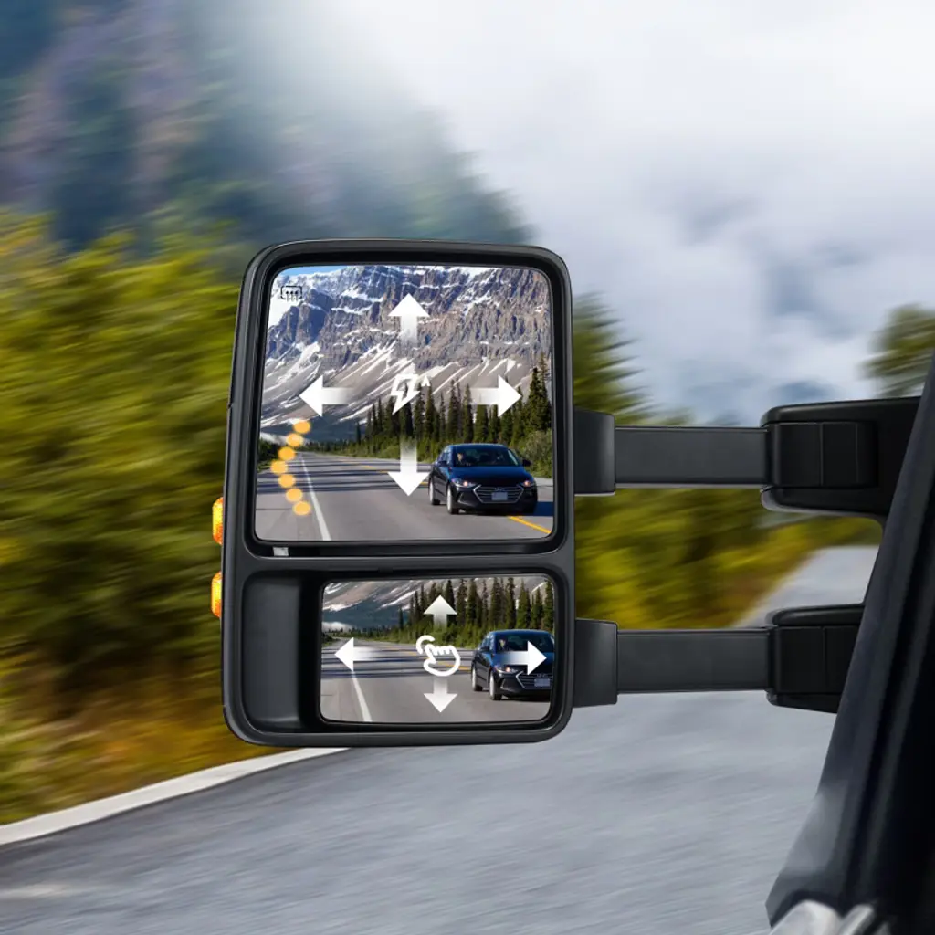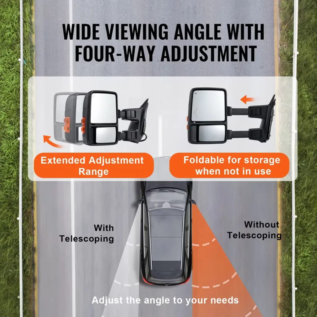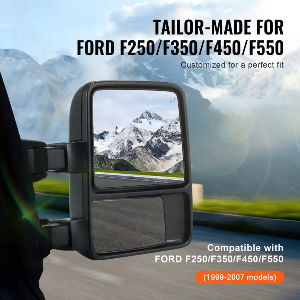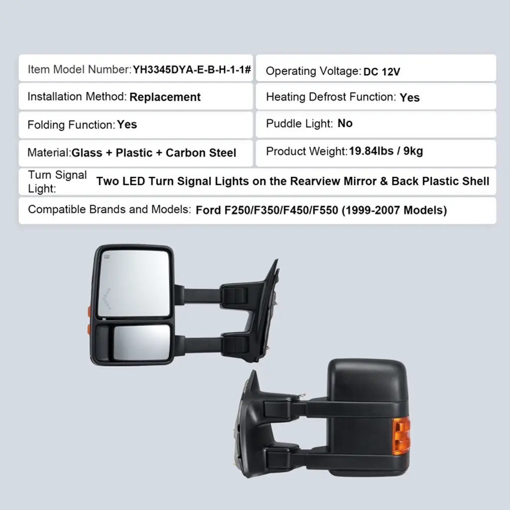 Feature: Vehicle Compatibility: Our towing mirrors are compatible with 1999-2003 Ford F250 F350 F450; 2003-2007 Ford F250 F350 F450; 1999-2007 Ford F250/F350/F450/F550 Super Duty; 2001-2005 Ford Excursion. No worries about mismatched parts here – our mirror set is designed to blend seamlessly with your vehicle, ensuring a snug fit. Four-Way Adjustment: With advanced multidimensional adjustment and electric adjustment features, you can tweak the tow mirrors to just the right angle for your driving style. Whether it's vertical or horizontal adjustment, precise control is achievable. No more blind spots ruining your day – get ready for a safer, smoother ride. Diverse Lighting Configuration: Light up the road with our trailer mirrors' turn signal lights. They boost visibility in dim conditions and add a touch of sleekness to your vehicle. Crafted from industrial-grade plastic and carbon steel, they're built to last through countless adventures. Folding and Heating Functions: These truck mirrors are designed with manual telescopic folding functionality, making storage a breeze and facilitating passage through narrow spaces. The heating function ensures quick removal of frost or fog for crystal-clear vision, even on rainy and snowy days. Easy Installation: No need to call in the pros or hunt down special tools – installing our trailer towing mirror is as easy as pie! Just hook it up to your vehicle's power supply (DC 12V), and you're good to go. We've included everything you need in the package, along with a step-by-step guide that even a DIY newbie can follow. Package Content 2 x Towing Mirrors 2 x Conversion Plugs 1 x User Manual