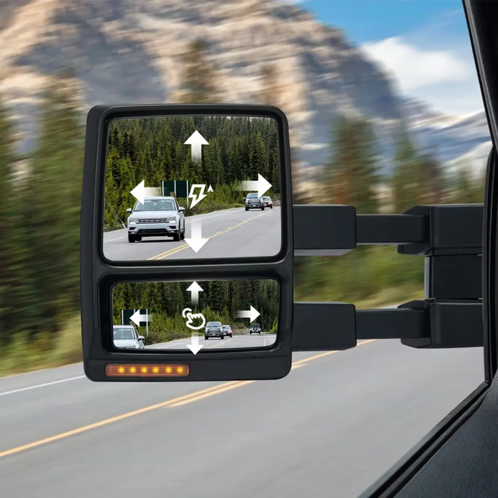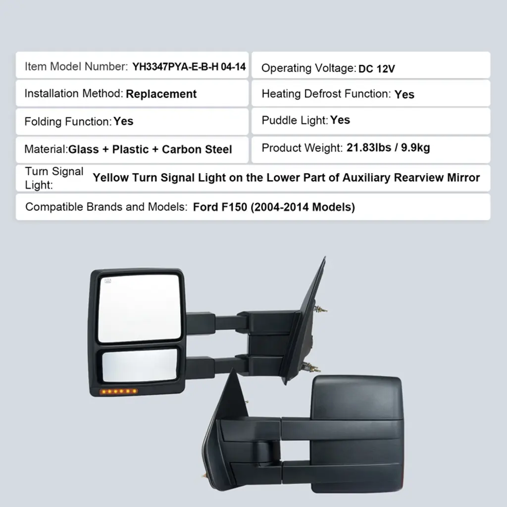 Feature: Vehicle Compatibility: Our towing mirrors are tailored for Ford models. It's a perfect fit for 2004-2014 Ford F150. No worries about mismatched parts here – our mirror set is designed to blend seamlessly with your vehicle, ensuring a snug fit that won't wobble on the road. Four-Way Adjustment: With advanced multidimensional adjustment and electric adjustment features, you can tweak the tow mirrors to just the right angle for your driving style. Whether it's vertical or horizontal adjustment, precise control is achievable. No more blind spots ruining your day – get ready for a safer, smoother ride. Diverse Lighting Configuration: Light up the road with our trailer mirrors' full set of lights, including turn signals and puddle lights. They boost visibility in dim conditions and add a touch of sleekness to your vehicle. Crafted from industrial-grade plastic and carbon steel, they're built to last through countless adventures. Folding and Heating Functions: These truck mirrors are designed with manual telescopic folding functionality, making storage a breeze and facilitating passage through narrow spaces. The heating function ensures quick removal of frost or fog for crystal-clear vision, even on rainy and snowy days. Easy Installation: No need to call in the pros or hunt down special tools – installing our trailer towing mirror is as easy as pie! Just hook it up to your vehicle's power supply (DC 12V), and you're good to go. We've included everything you need in the package, along with a step-by-step guide that even a DIY newbie can follow. Package Content 2 x Towing Mirrors 2 x Conversion Plugs 1 x User Manual