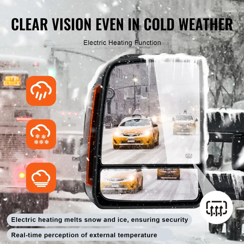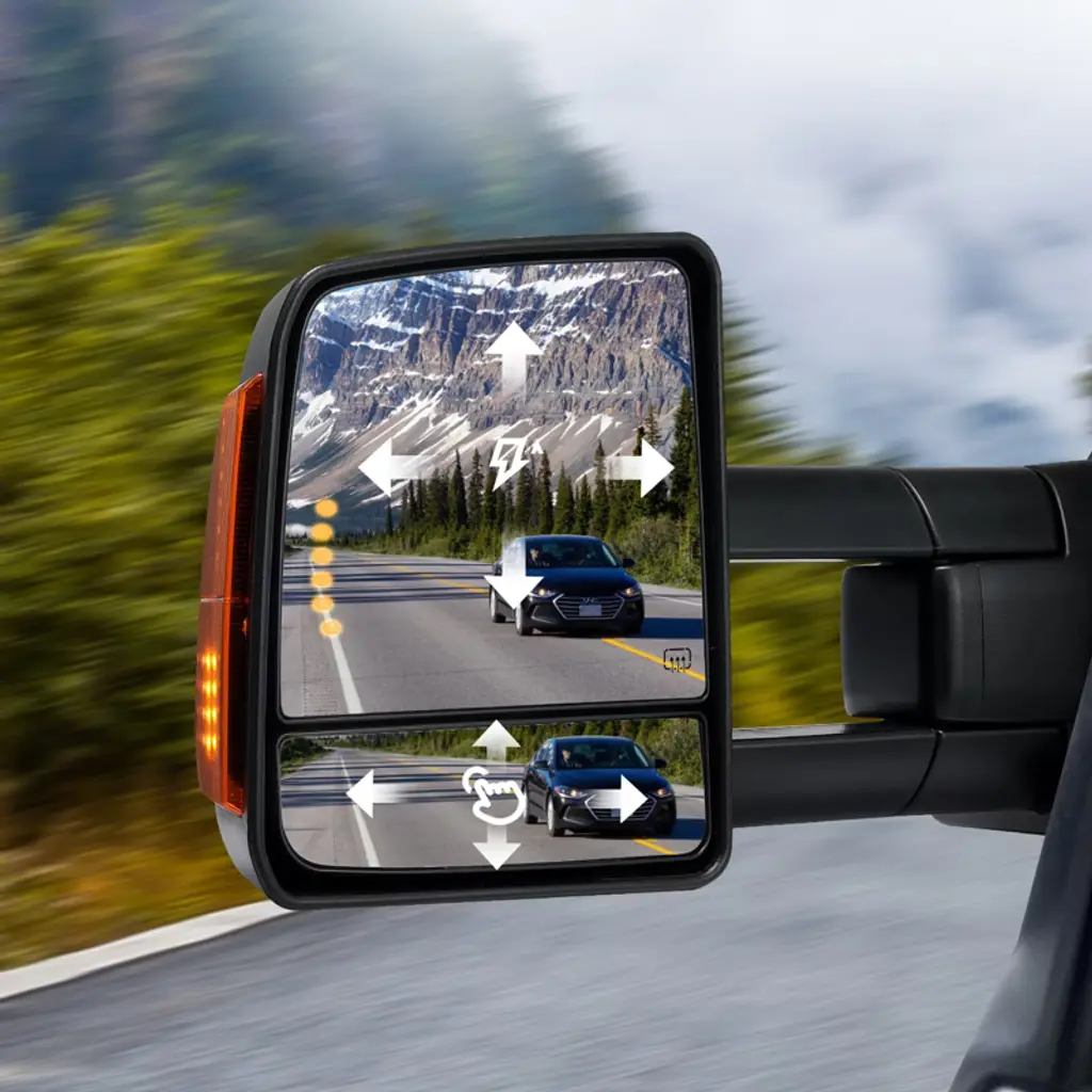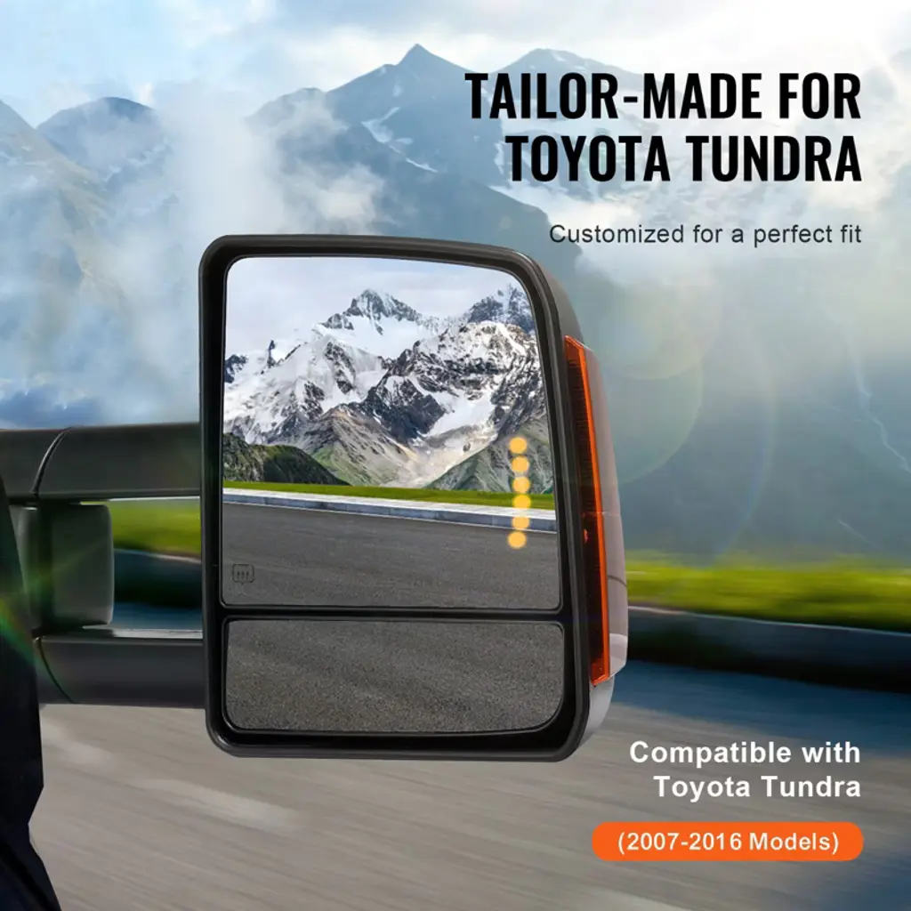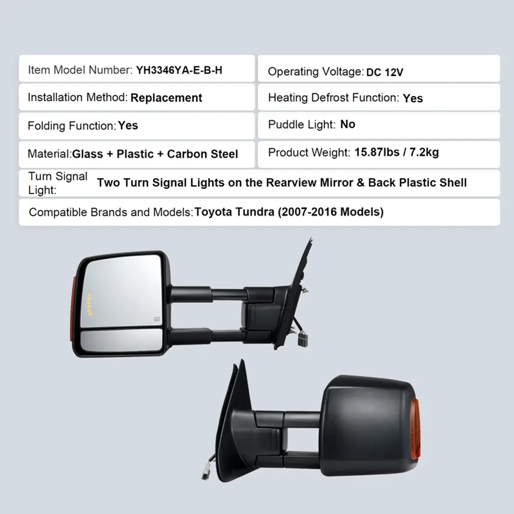 Feature: Vehicle Compatibility: Our towing mirrors are compatible with 2007-2017 For Tundra. No worries about mismatched parts here – our mirror set is designed to blend seamlessly with your vehicle, ensuring a snug fit. Four-Way Adjustment: With advanced multidimensional adjustment and electric adjustment features, you can tweak the tow mirrors to just the right angle for your driving style. Whether it's vertical or horizontal adjustment, precise control is achievable. No more blind spots ruining your day – get ready for a safer, smoother ride. Diverse Lighting Configuration: Light up the road with our trailer mirrors' turn signal lights. They boost visibility in dim conditions and add a touch of sleekness to your vehicle. Crafted from industrial-grade plastic and carbon steel, they're built to last through countless adventures. Folding and Heating Functions: These truck mirrors are designed with manual telescopic folding functionality, making storage a breeze and facilitating passage through narrow spaces. The heating function ensures quick removal of frost or fog for crystal-clear vision, even on rainy and snowy days. Easy Installation: No need to call in the pros or hunt down special tools – installing our trailer towing mirror is as easy as pie! Just hook it up to your vehicle's power supply (DC 12V), and you're good to go. We've included everything you need in the package, along with a step-by-step guide that even a DIY newbie can follow. Package Content 2 x Towing Mirrors 1 x User Manual