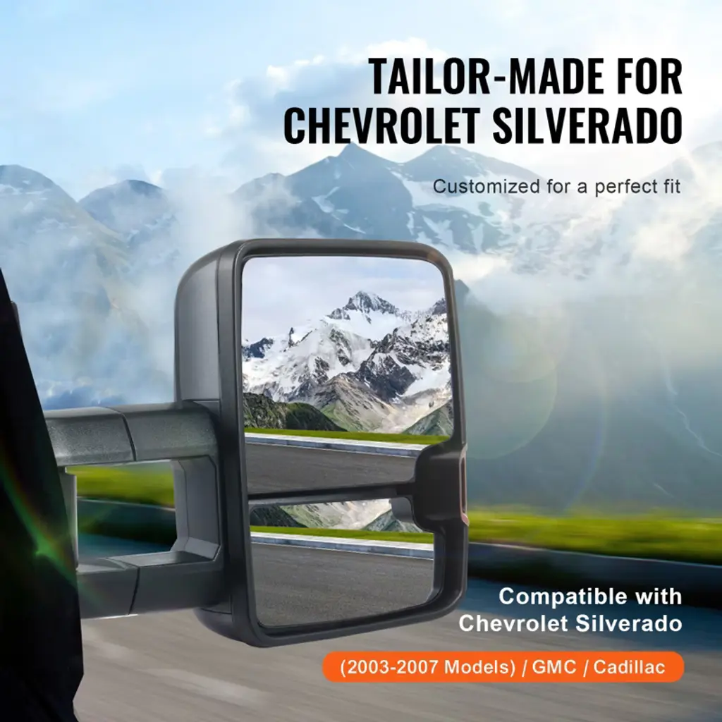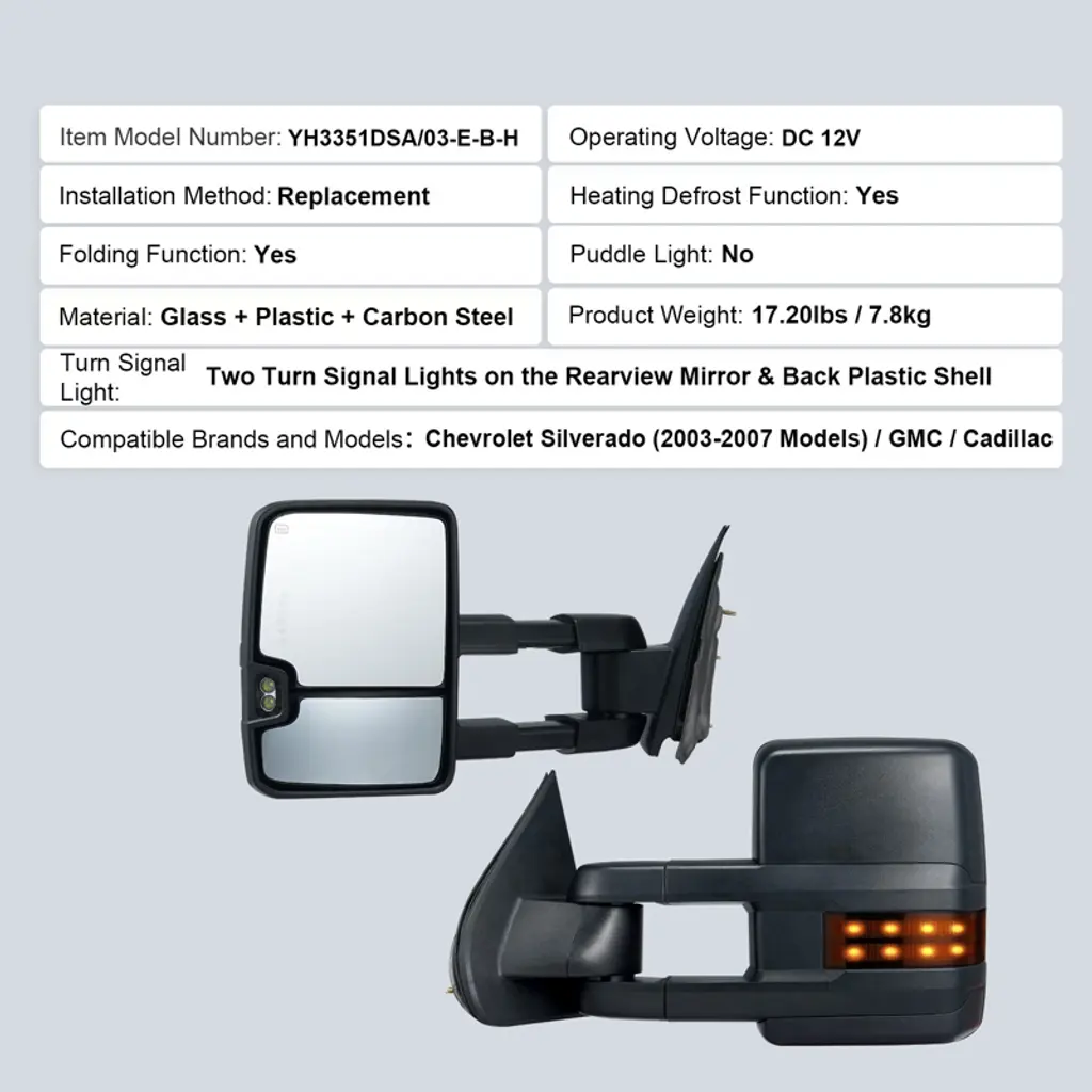 Feature: Vehicle Compatibility: Our towing mirrors are compatible with 2003-2006 Chevy Silverado Pickup all models; 2003-2006 GMC Sierra Pickup all models; 2003-2006 Chevy Tahoe/Suburban/Avalanche/Yukon/Yukon XL; 2003-2006 Cadillac Escalade all models; 2007 Chevy Silverado Classic Models; 2007 GMC Sierra Classic Models. No worries about mismatched parts here – our mirror set is designed to blend seamlessly with your vehicle, ensuring a snug fit. Four-Way Adjustment: With advanced multidimensional adjustment and electric adjustment features, you can tweak the tow mirrors to just the right angle for your driving style. Whether it's vertical or horizontal adjustment, precise control is achievable. No more blind spots ruining your day – get ready for a safer, smoother ride. Diverse Lighting Configuration: Light up the road with our trailer mirrors' full set of lights, including turn signals, reversing lights, and driving lights. They boost visibility in dim conditions and add a touch of sleekness to your vehicle. Crafted from industrial-grade plastic and carbon steel, they're built to last through countless adventures. Folding and Heating Functions: These truck mirrors are designed with manual telescopic folding functionality, making storage a breeze and facilitating passage through narrow spaces. The heating function ensures quick removal of frost or fog for crystal-clear vision, even on rainy and snowy days. Easy Installation: No need to call in the pros or hunt down special tools – installing our trailer towing mirror is as easy as pie! Just hook it up to your vehicle's power supply (DC 12V), and you're good to go. We've included everything you need in the package, along with a step-by-step guide that even a DIY newbie can follow. Package Content 2 x Towing Mirrors 4 x Connection Cables (2.5 m) 1 x Accessories Kit 1 x User Manual
